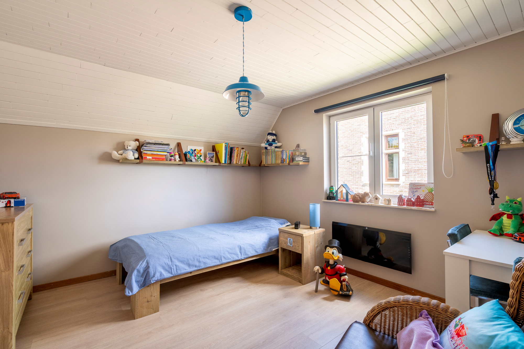 A detached house in a traffic-calmed environment. Despite its less favorable energy label, the home benefits from a remarkably low electricity consumption (€163.35/month in 2024) thanks to the photovoltaic panels, home battery, and insulation. Other features include a pleasant through-living room, a closed kitchen, three bedrooms—one of which is located on the ground floor with a versatile character (also ideal for a home office or professional practice)—and a fully fenced, landscaped garden.