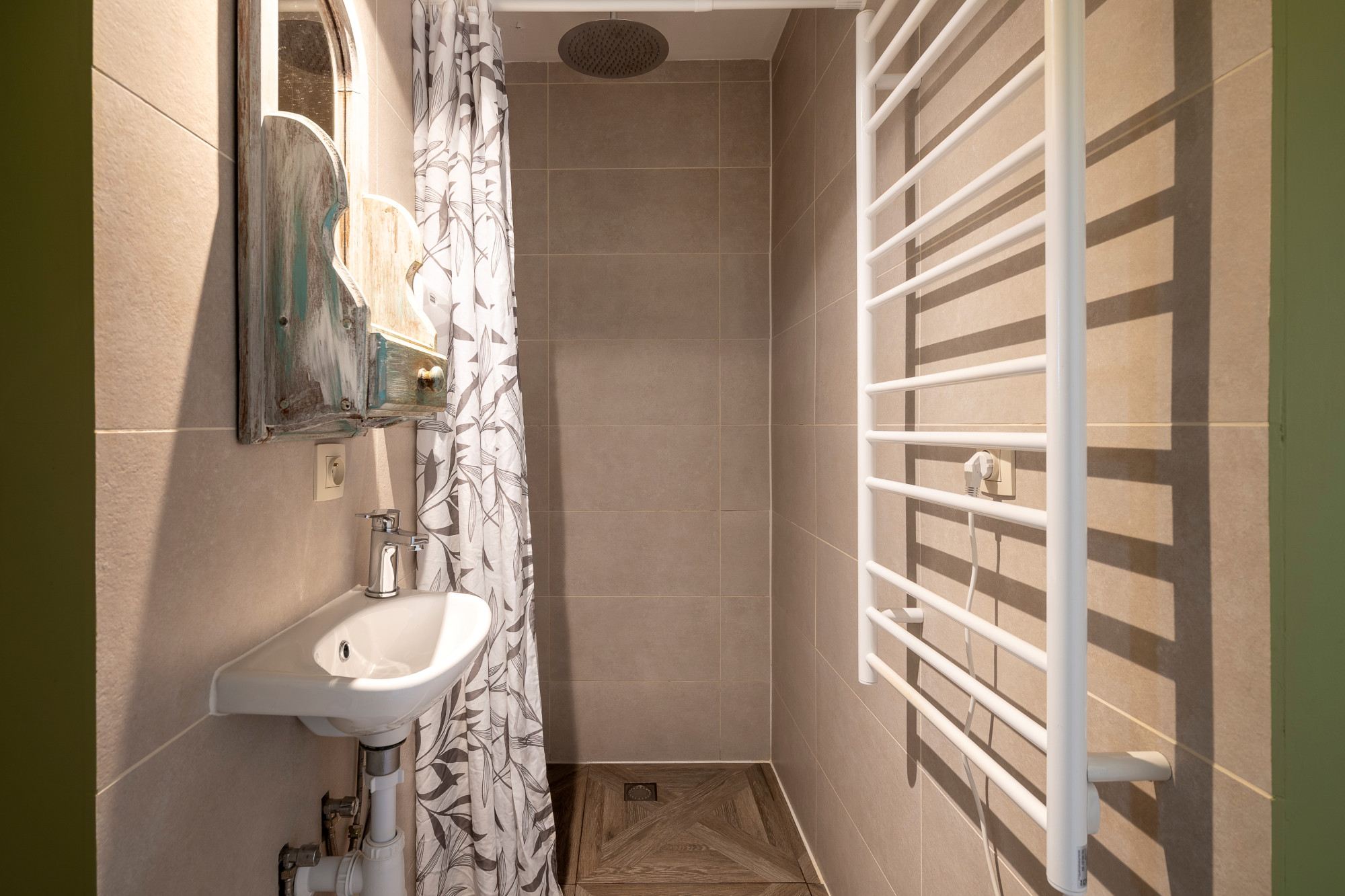 The first bathroom has a fixed washbasin and a walk-in rain shower. The 2nd bathroom is installed with a vanity unit, bathtub/shower combination and a bidet.