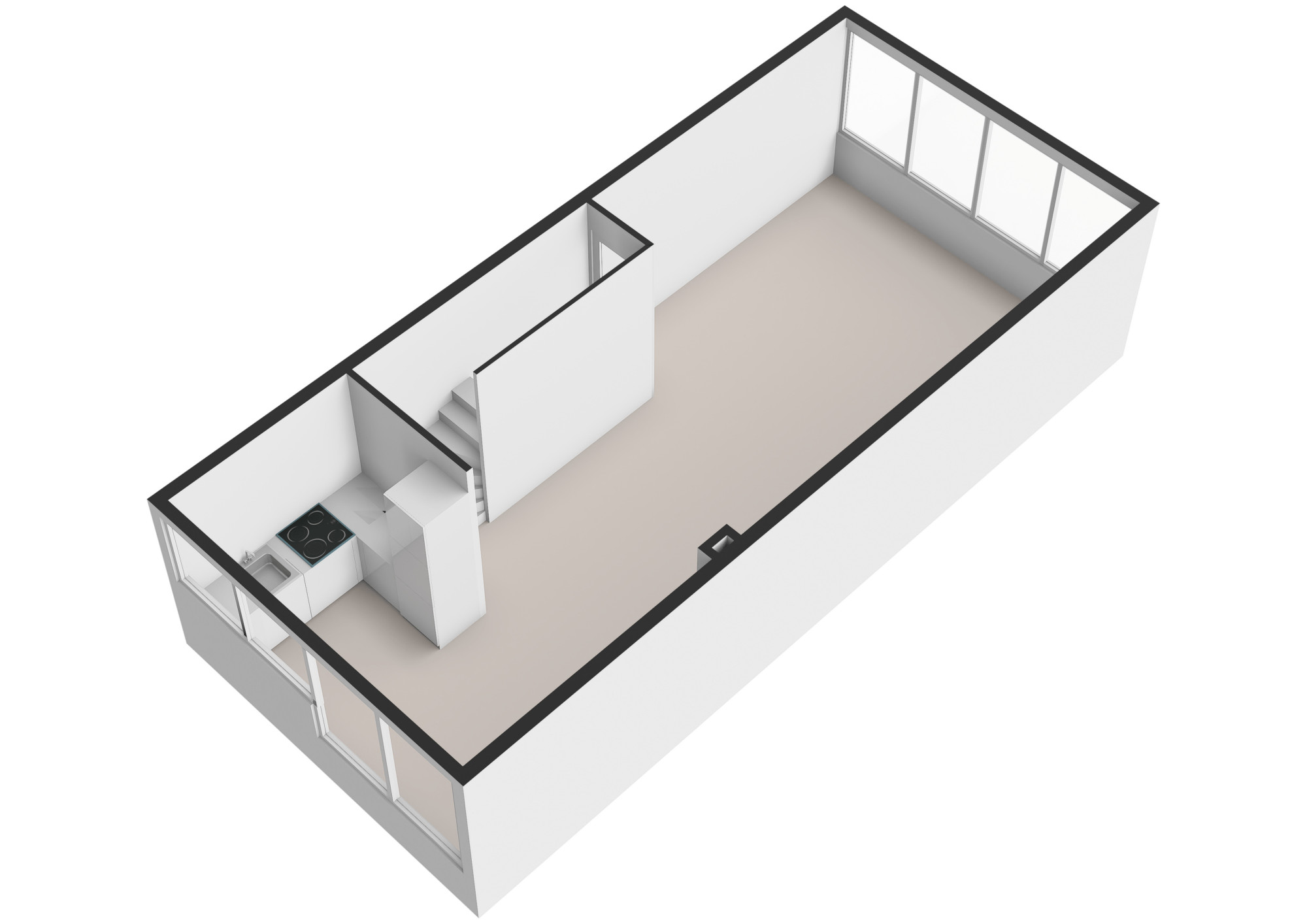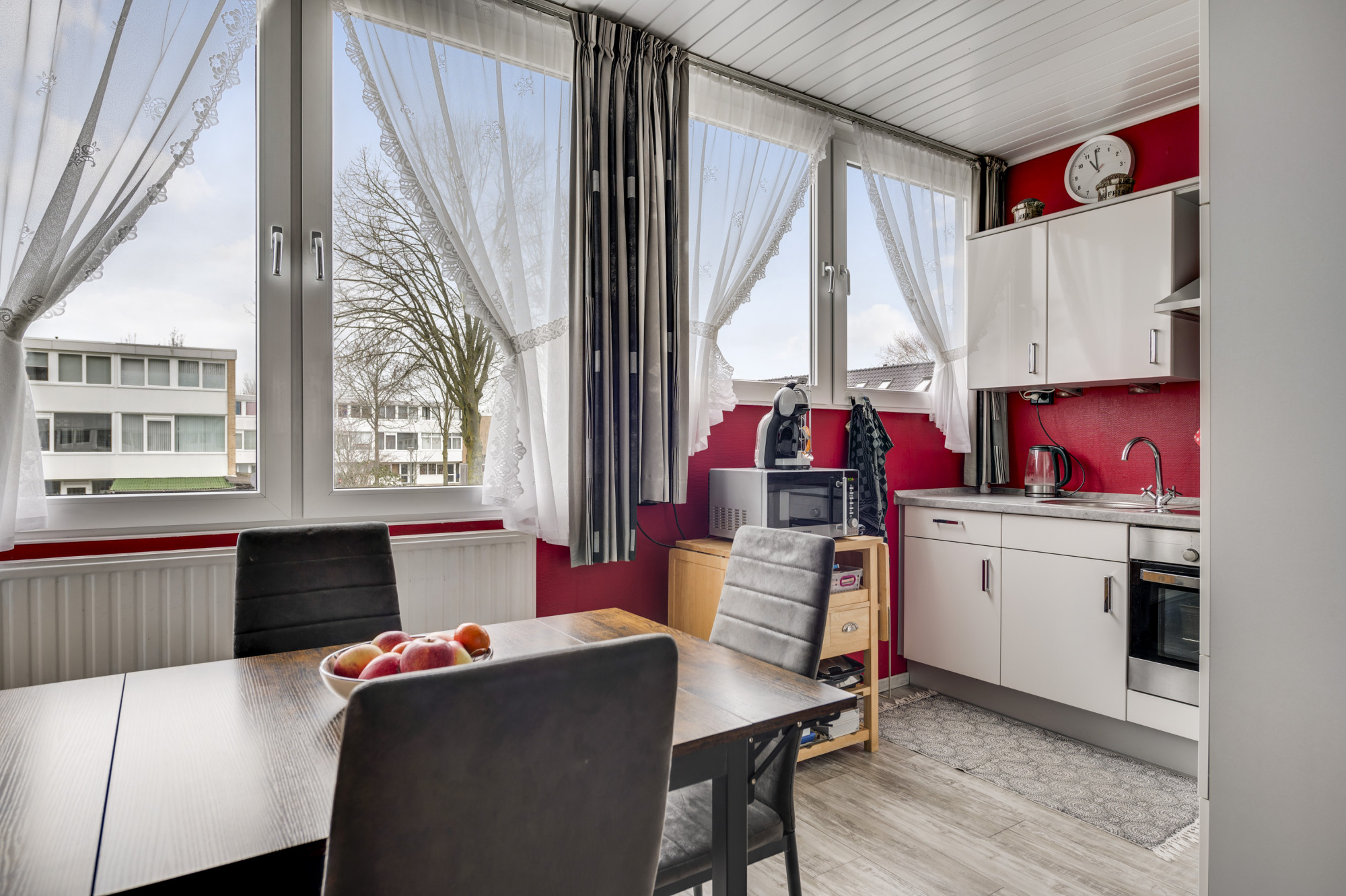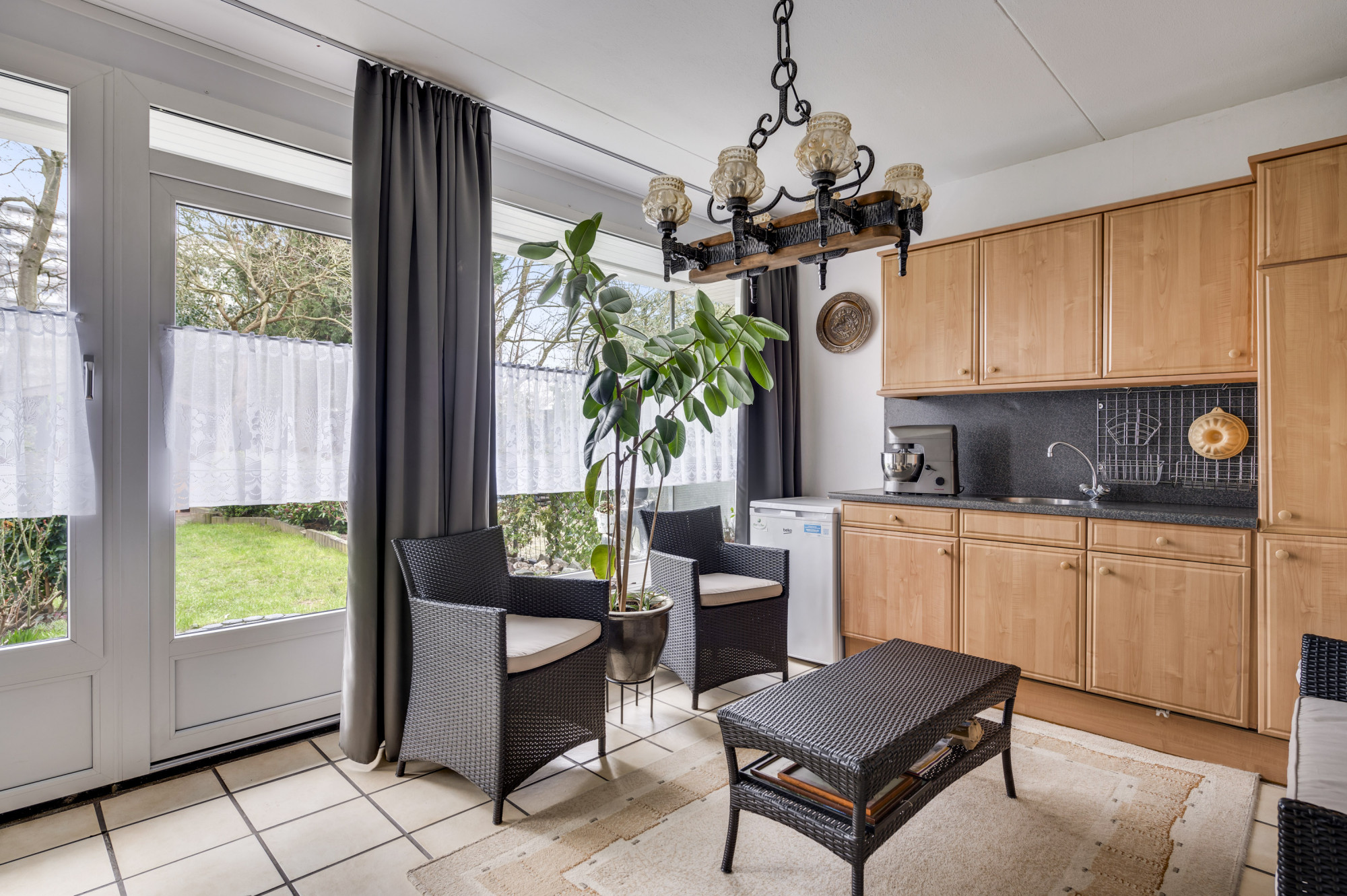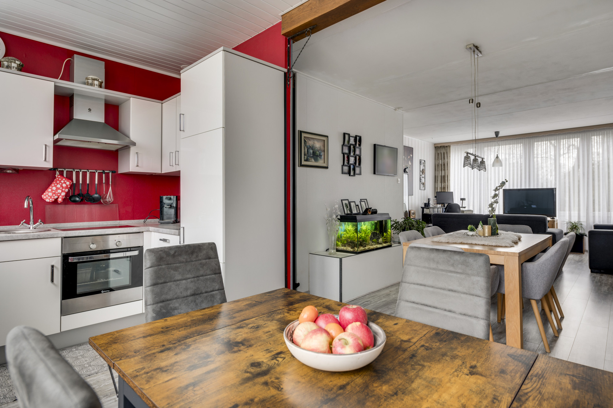 Via een tussen portaal zijn de royale woonkamer en half open keuken bereikbaar. De woonkamer beschikt over veel lichtinval door de grote raampartijen en staat in verbinding met de keuken. De keuken is voorzien van een moderne hoekopstelling met de navolgende apparatuur: inductiekookplaat, afzuigkap, oven en koelkast.