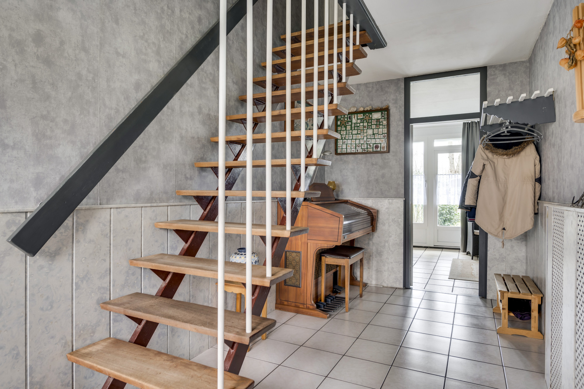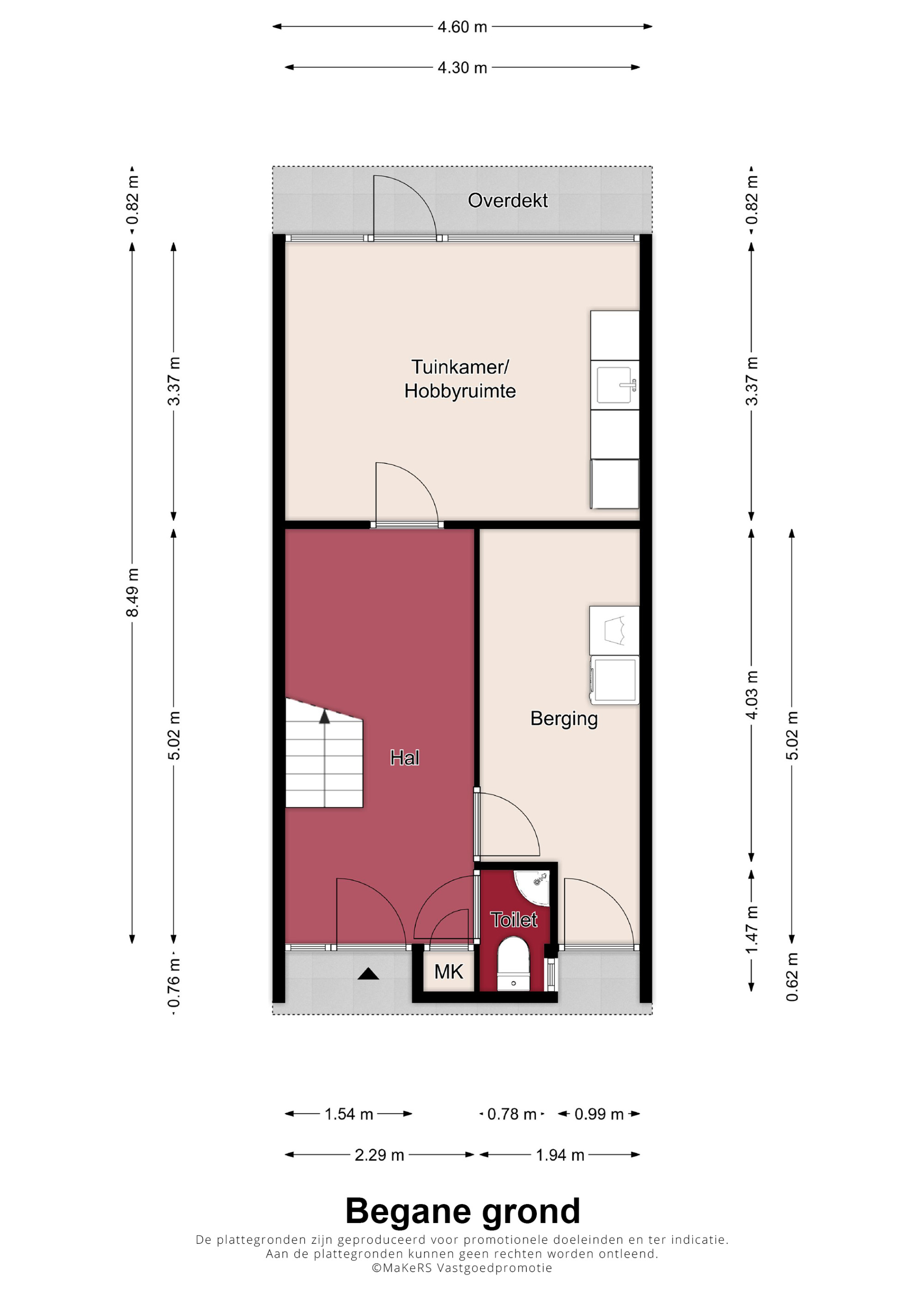 De ruime hal/entree is voorzien van een tegelvloer en biedt toegang tot het toilet met fonteintje, meterkast, tuinkamer/hobbyruimte, riante berging en de opgang naar de eerste verdieping. De berging is voorzien van een laminaatvloer en heeft een aparte toegang aan de voorzijde van de woning. Tevens bevinden zich hier de witgoedaansluitingen. De ruime, multifunctionele tuinkamer/hobbyruimte is voorzien van een praktisch keukenblok, tegelvloer en een loopdeur naar de zonnige achtertuin met overkapping. Thans is deze ruimte in gebruik als gezellige tuinkamer, maar de ruimte is natuurlijk voor meerdere doeleinden geschikt, zoals bijvoorbeeld als gelijkvloerse slaapkamer, of heerlijke hobbyruimte met direct tuincontact.