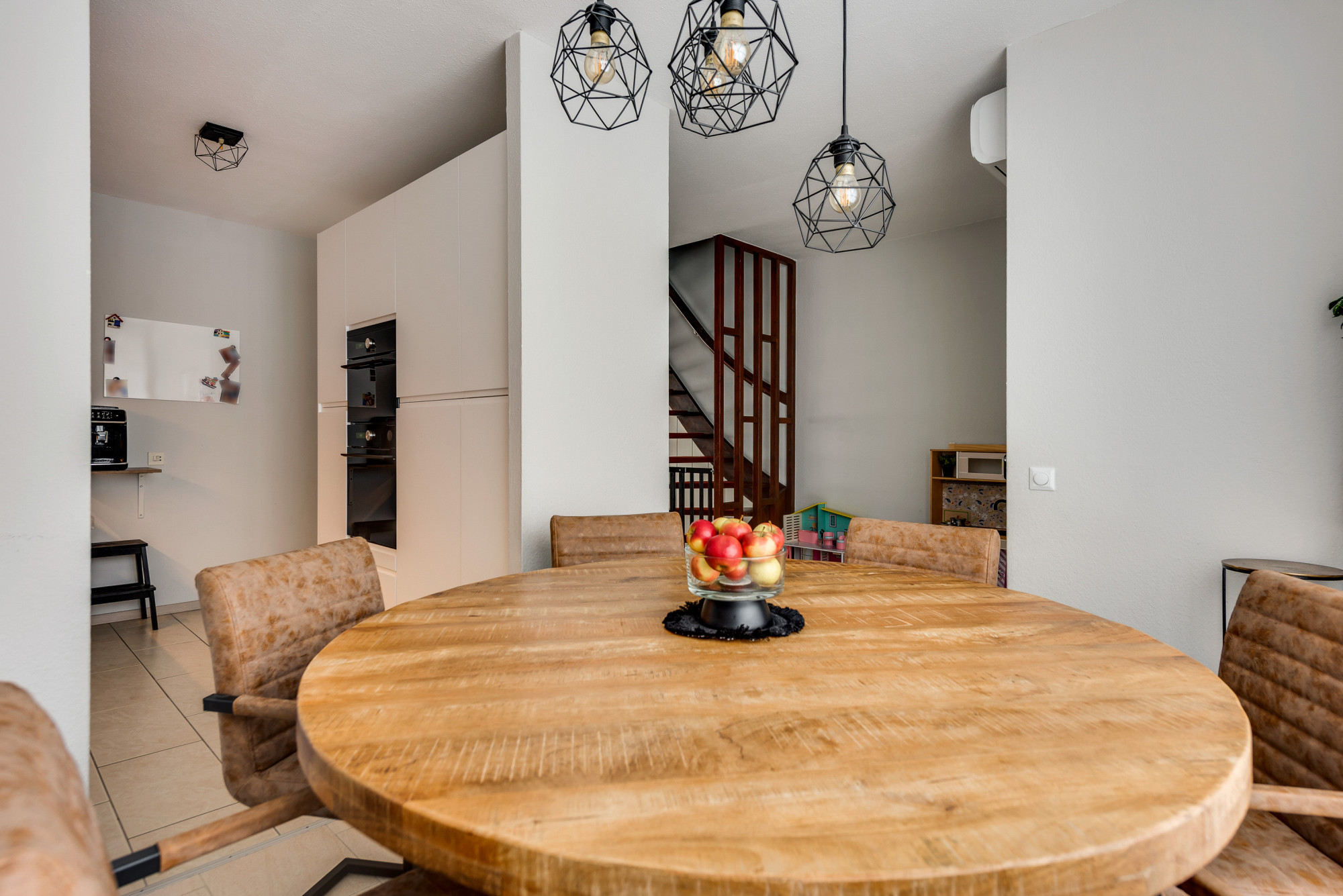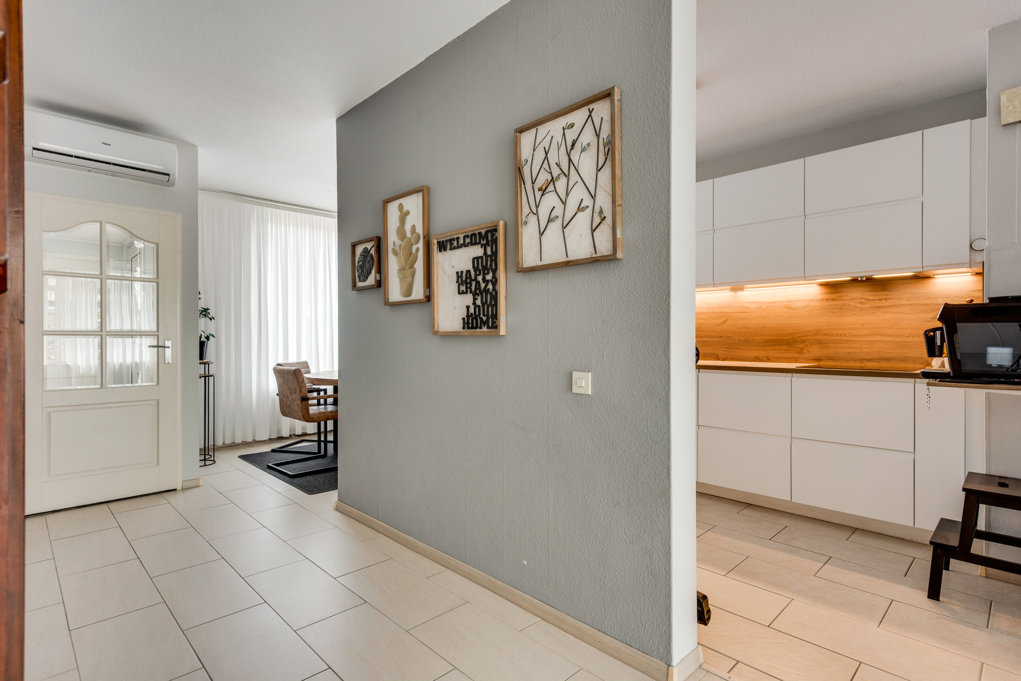 Via de hal/entree is de betegelde toiletruimte met toilet en fonteintje, de meterkast, de berging en de woonkamer toegankelijk. De royale en lichte woonkamer is aan de achterzijde van de woning gelegen en heeft prettig tuincontact middels naar het terras. Tevens bevindt zich in de woonkamer de opgang naar de eerste verdieping. De open keuken is in het hart van de woning gelegen en voorzien van een moderne combinatie in 2 delen met inbouwapparatuur; inductiekookplaat, afzuigkap, combi-oven, stoomoven, koelkast en vaatwasser. Aan de voorzijde van de woning is het eetgedeelte gelegen. De tevens voorgelegen, inpandig bereikbare berging is voorzien van een buitendeur. De begane grond is voorzien een tegelvloer.
