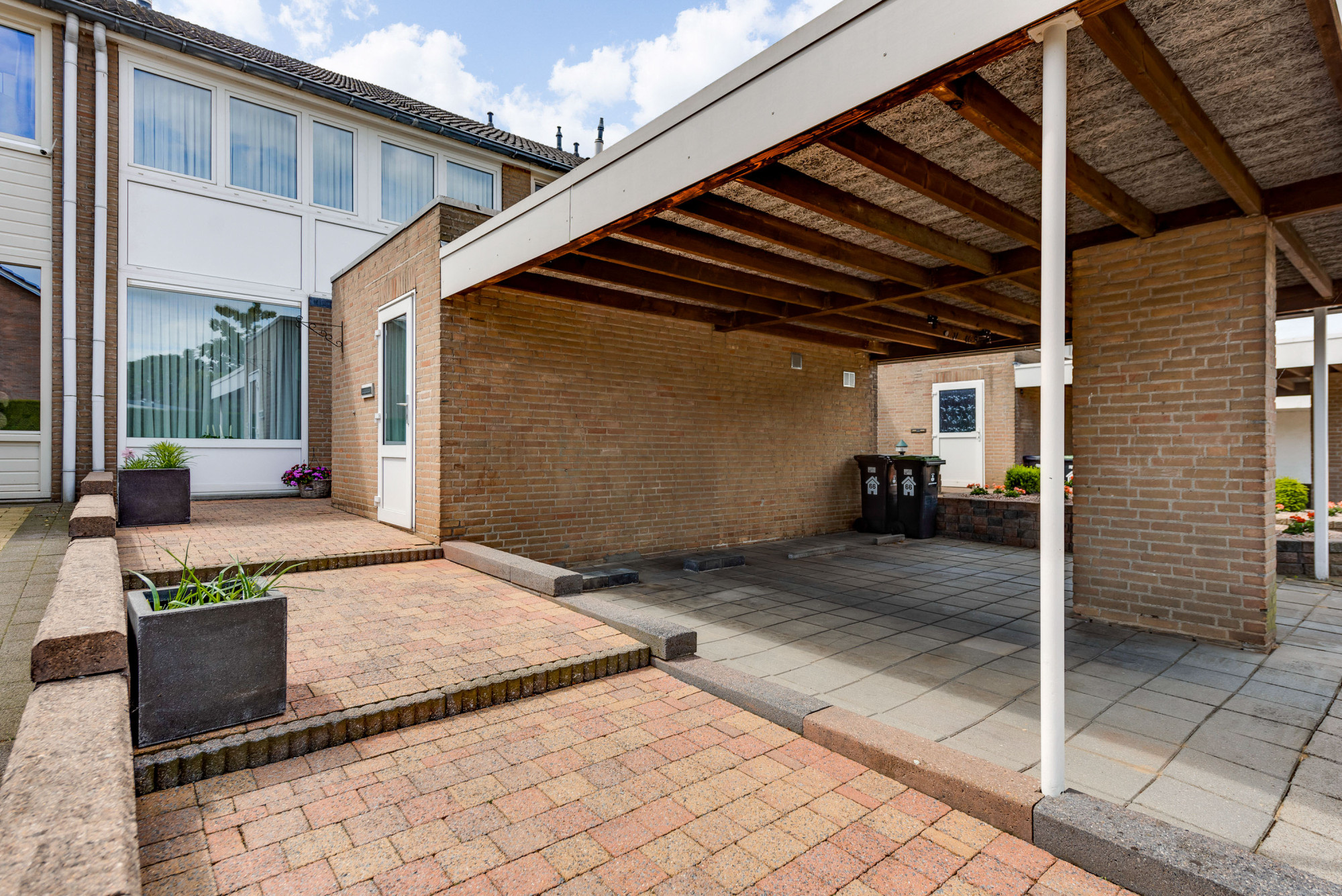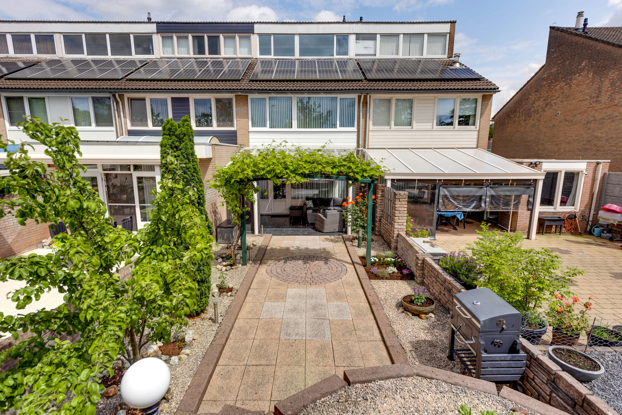 Er is een voortuin met carport en een inpandige berging. De achtertuin, welke is gelegen op het zuidwesten, kent veel privacy en is ingericht met een riante terrasoverkapping, bestrating en borders. Aan de achterzijde is er veel privacy door de directe ligging aan een talud.