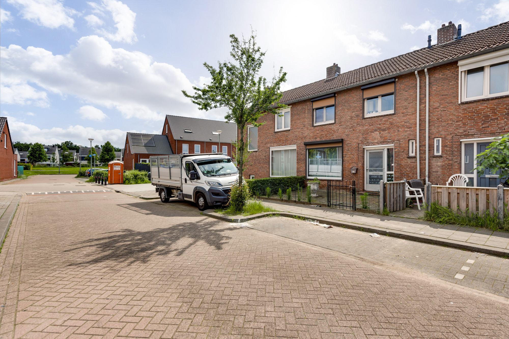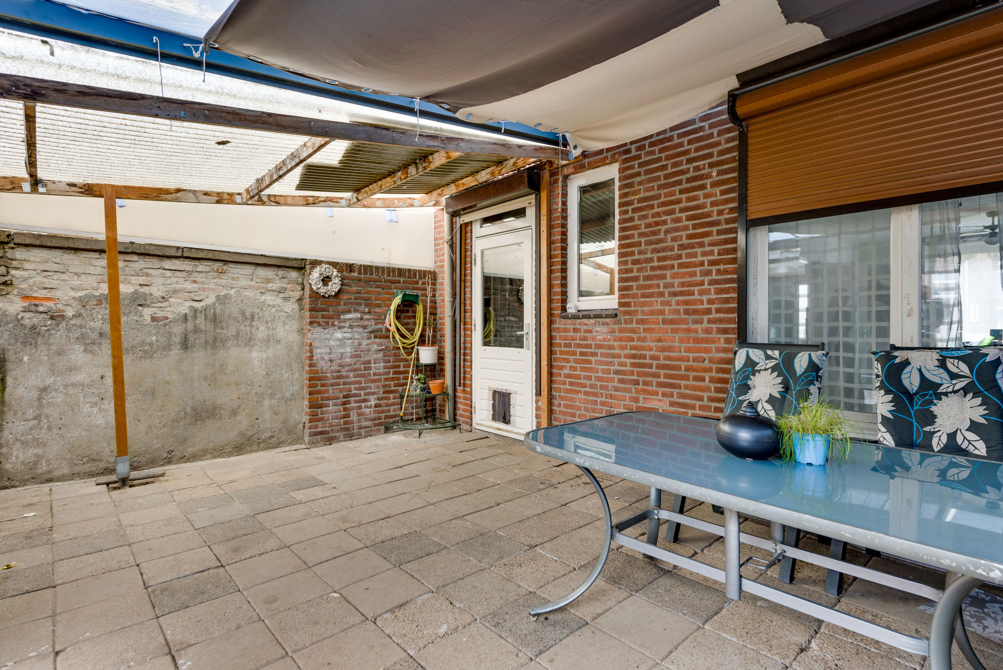 Onderhoudsvriendelijke voor- en achtertuin. De zonnige achtertuin op het zuidwesten beschikt over een overkapping, stenen berging, bestrating en een vrije achterom.