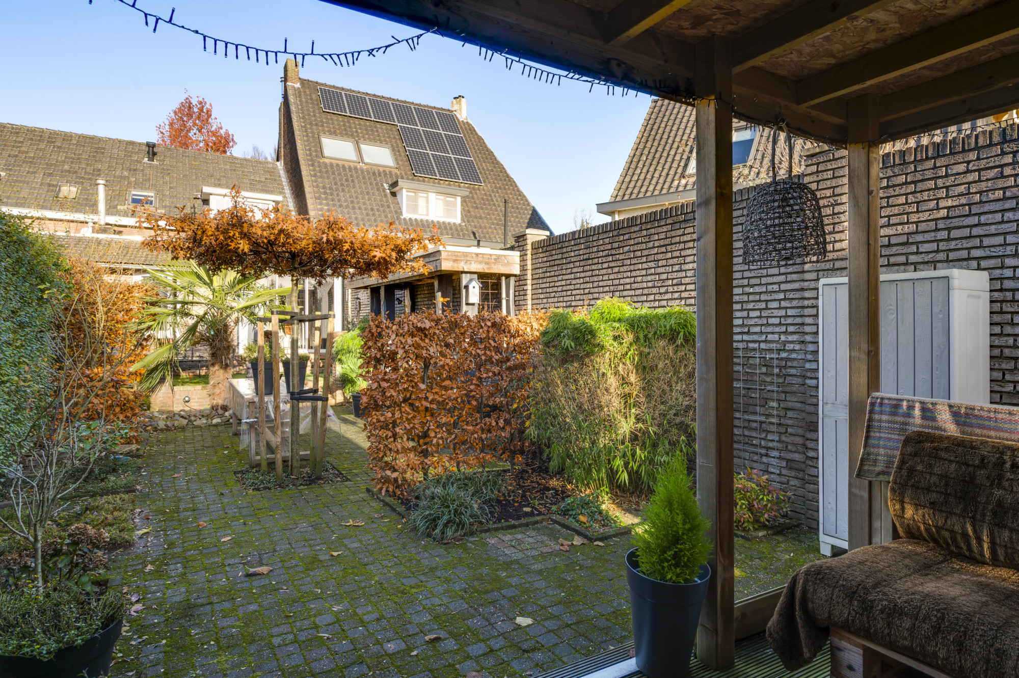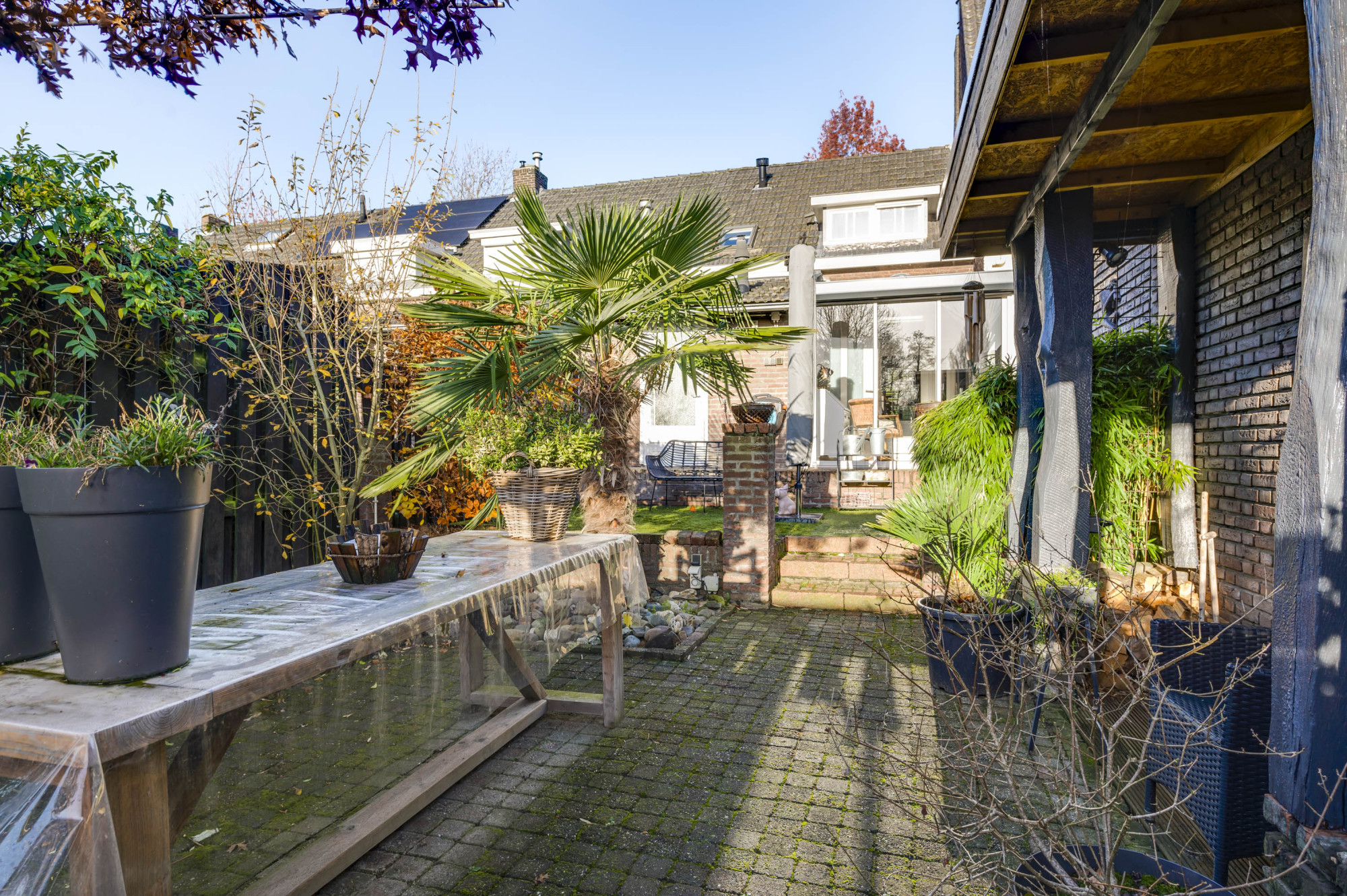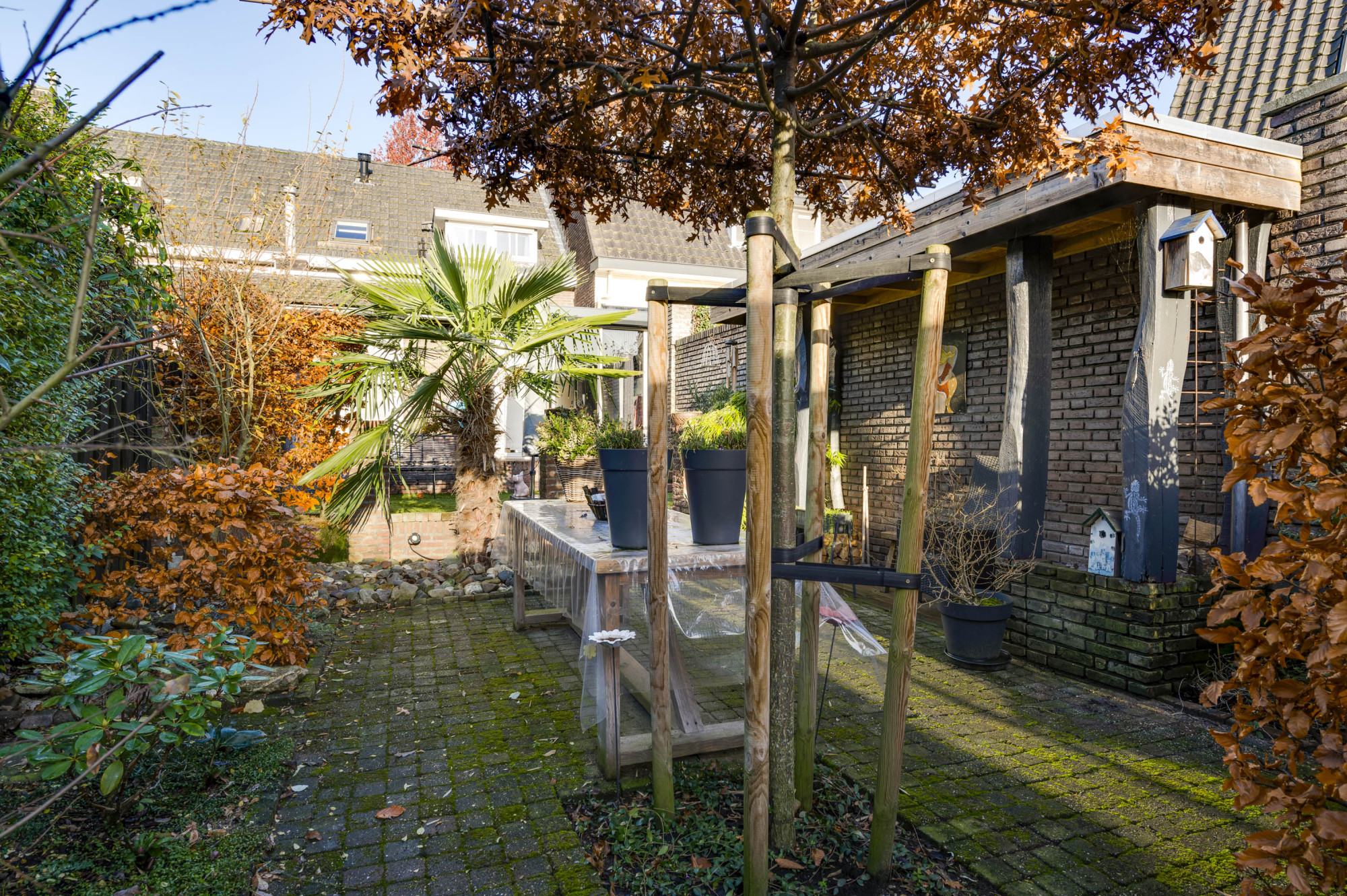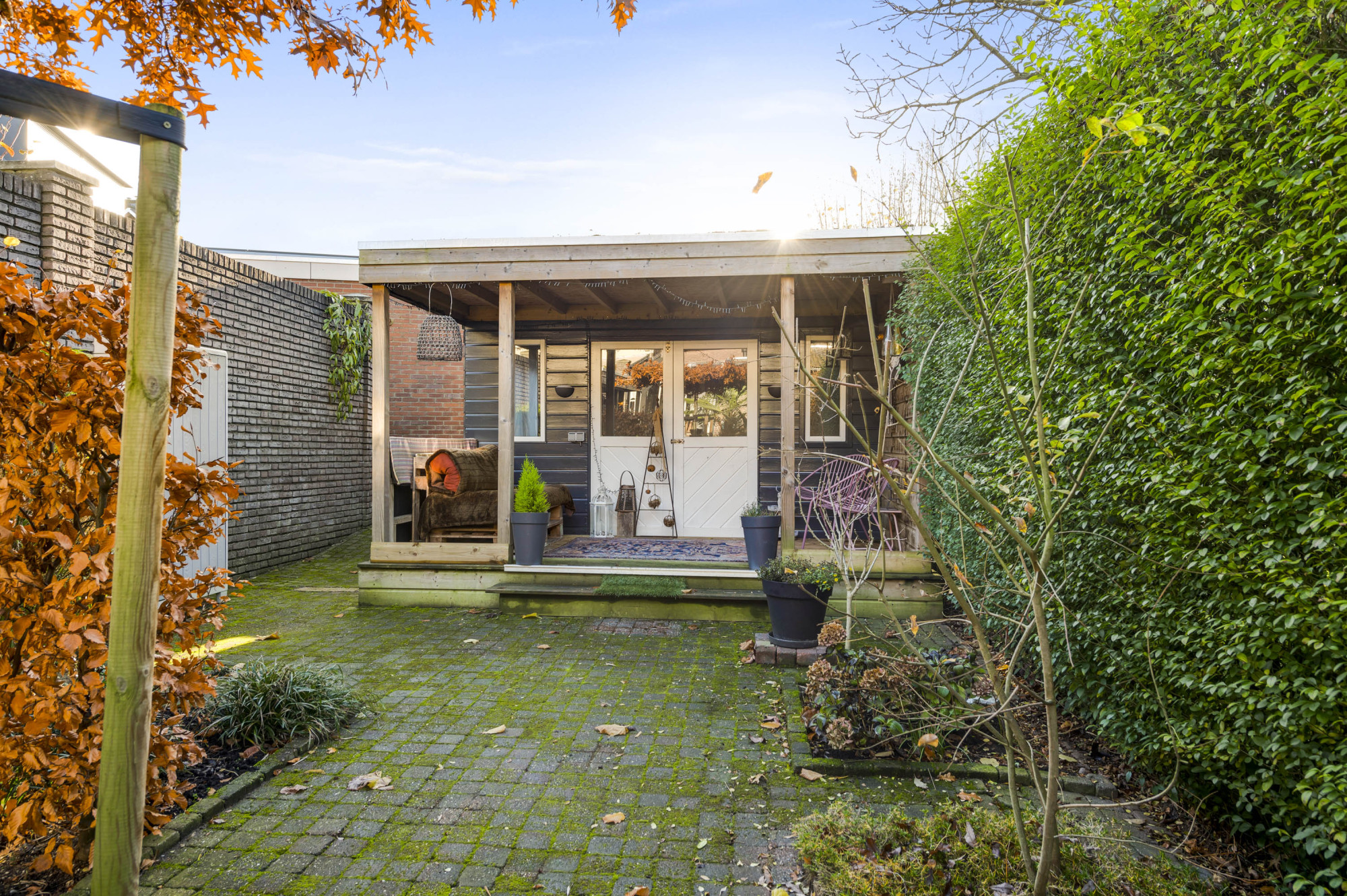 De achtertuin is een waar plaatje. Fraai aangelegd, straalt de tuin rust en sfeer uit. De zonnige ligging op het zuidoosten zorgt ervoor dat u vrijwel de hele dag kunt genieten van de zon, terwijl de royale afmetingen volop ruimte bieden voor diverse indelingen. De tuin is zorgvuldig ingericht met sierlijke borders vol groene beplanting en kleurrijke bloemen, gecombineerd met bestrating die zowel praktisch als esthetisch is. Een houten tuinhuis met overkapping biedt een ideale plek voor opslag, maar ook voor gezellige avonden onder de veranda. Hier kunt u het hele jaar door buiten genieten, ongeacht het weer. De vrije achterom zorgt ervoor dat de tuin eenvoudig bereikbaar is, zonder dat u door de woning hoeft. Dankzij de hoge mate van privacy is dit een plek waar u helemaal tot rust kunt komen, midden in de natuur, maar toch op een steenworp afstand van de stad.