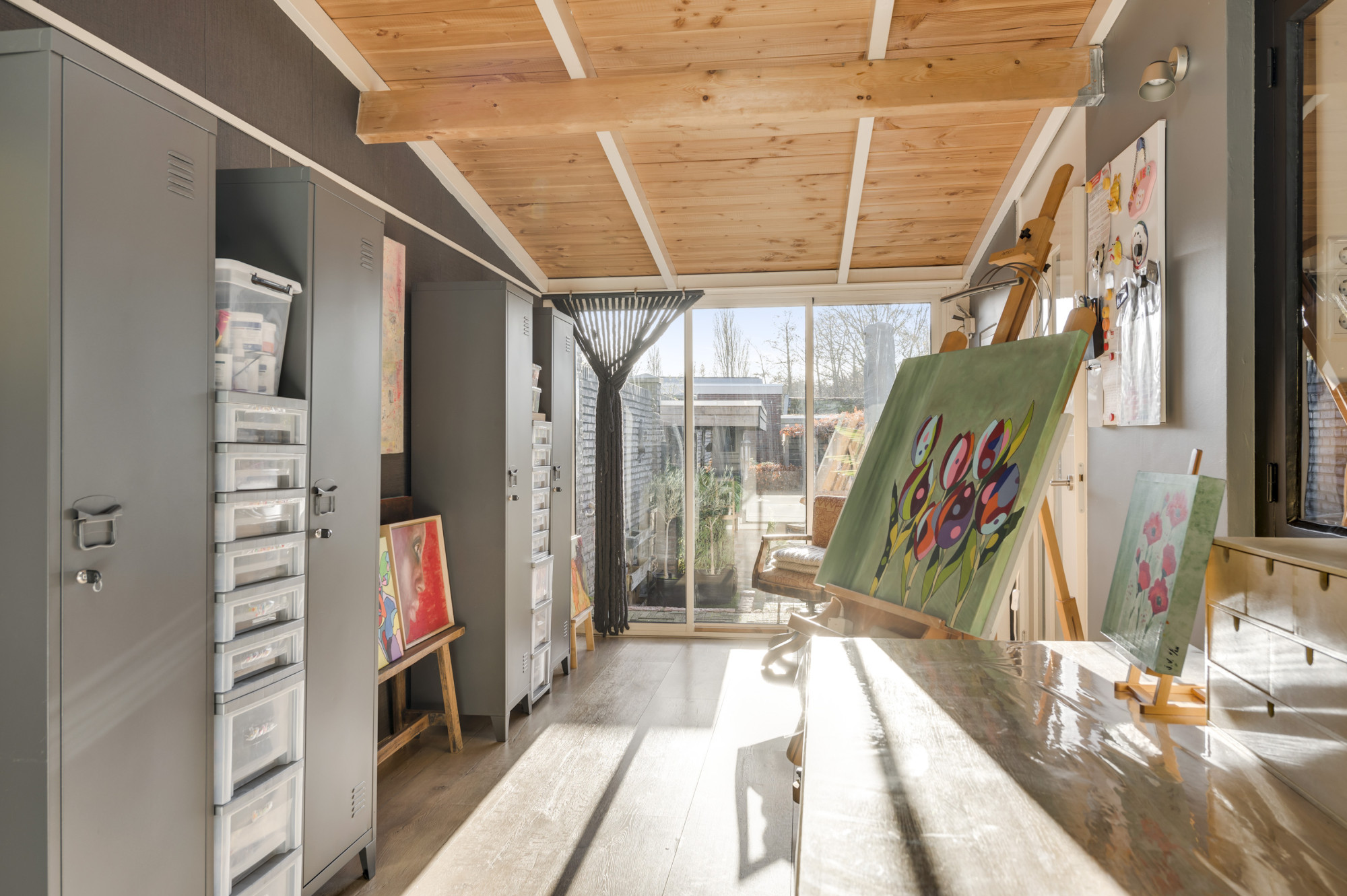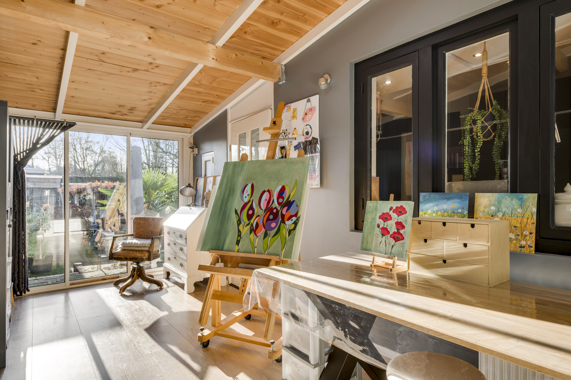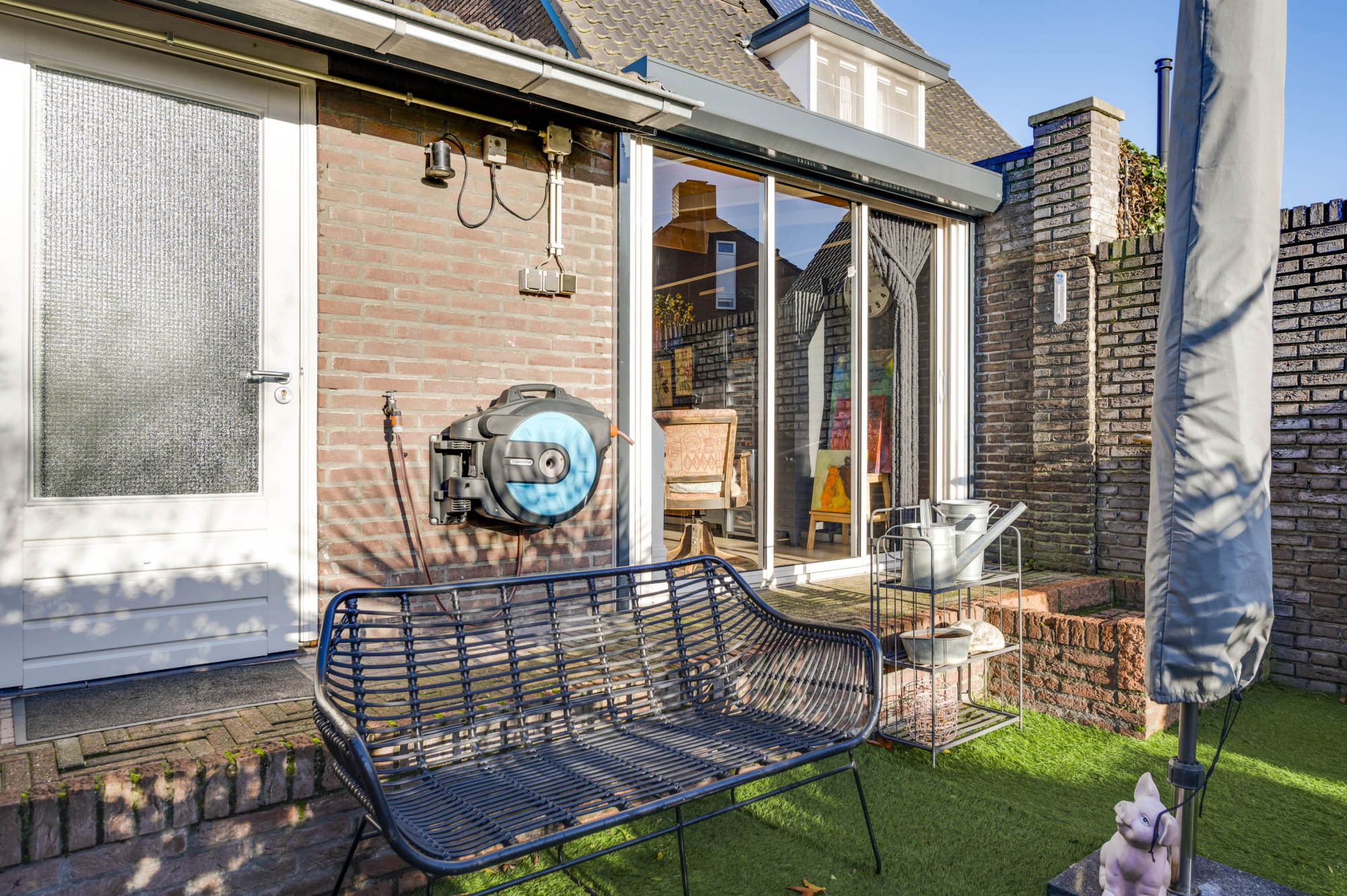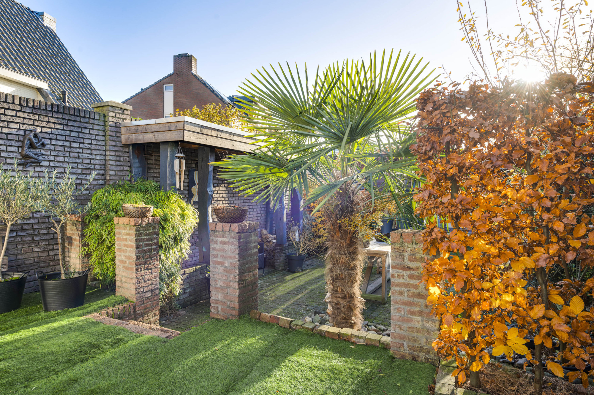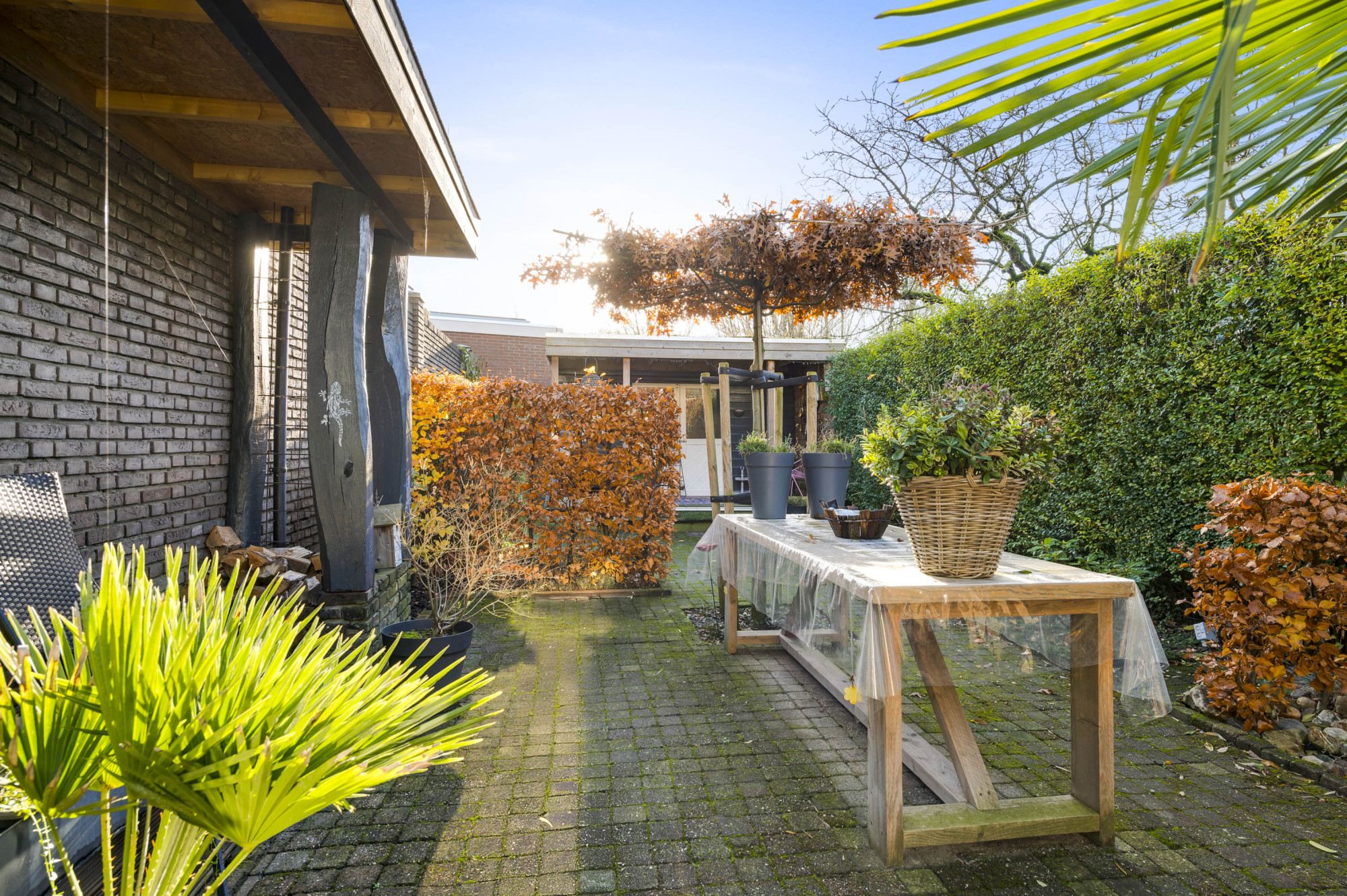 De achtertuin is een waar plaatje. Fraai aangelegd, straalt de tuin rust en sfeer uit. De zonnige ligging op het zuidoosten zorgt ervoor dat u vrijwel de hele dag kunt genieten van de zon, terwijl de royale afmetingen volop ruimte bieden voor diverse indelingen. De tuin is zorgvuldig ingericht met sierlijke borders vol groene beplanting en kleurrijke bloemen, gecombineerd met bestrating die zowel praktisch als esthetisch is. Een houten tuinhuis met overkapping biedt een ideale plek voor opslag, maar ook voor gezellige avonden onder de veranda. Hier kunt u het hele jaar door buiten genieten, ongeacht het weer. De vrije achterom zorgt ervoor dat de tuin eenvoudig bereikbaar is, zonder dat u door de woning hoeft. Dankzij de hoge mate van privacy is dit een plek waar u helemaal tot rust kunt komen, midden in de natuur, maar toch op een steenworp afstand van de stad.