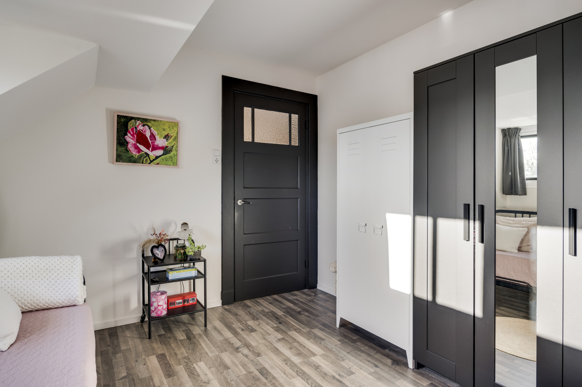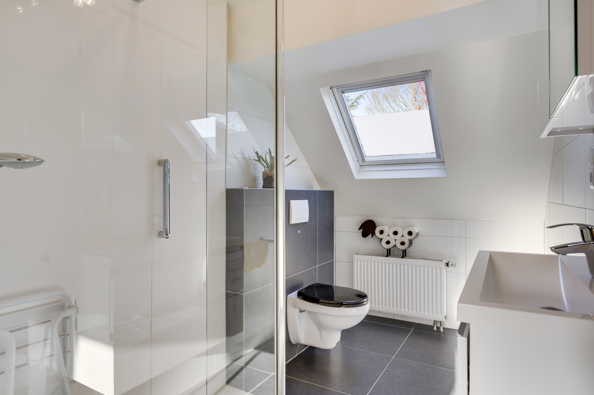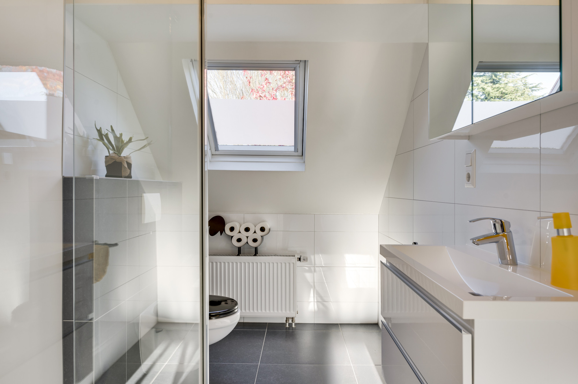 De overloop op de eerste verdieping geeft toegang tot twee royale slaapkamers, beide uitgerust met een dakkapel, wat zorgt voor extra licht en ruimte. De badkamer is modern ingericht met een ruime douche, een stijlvol wastafelmeubel en een zwevend toilet.