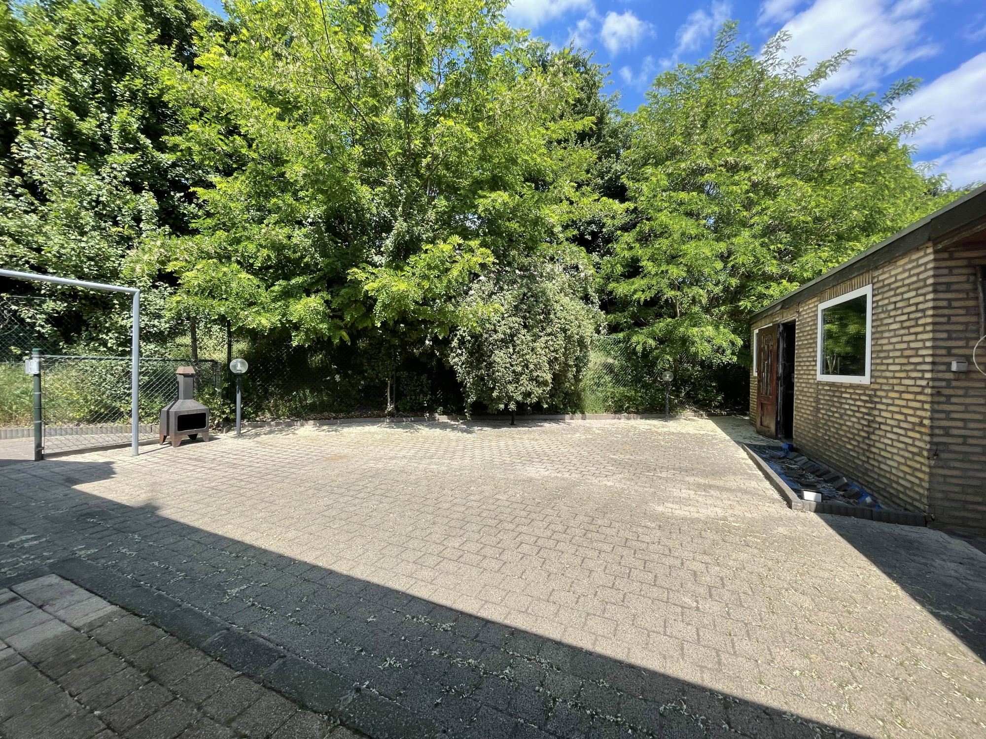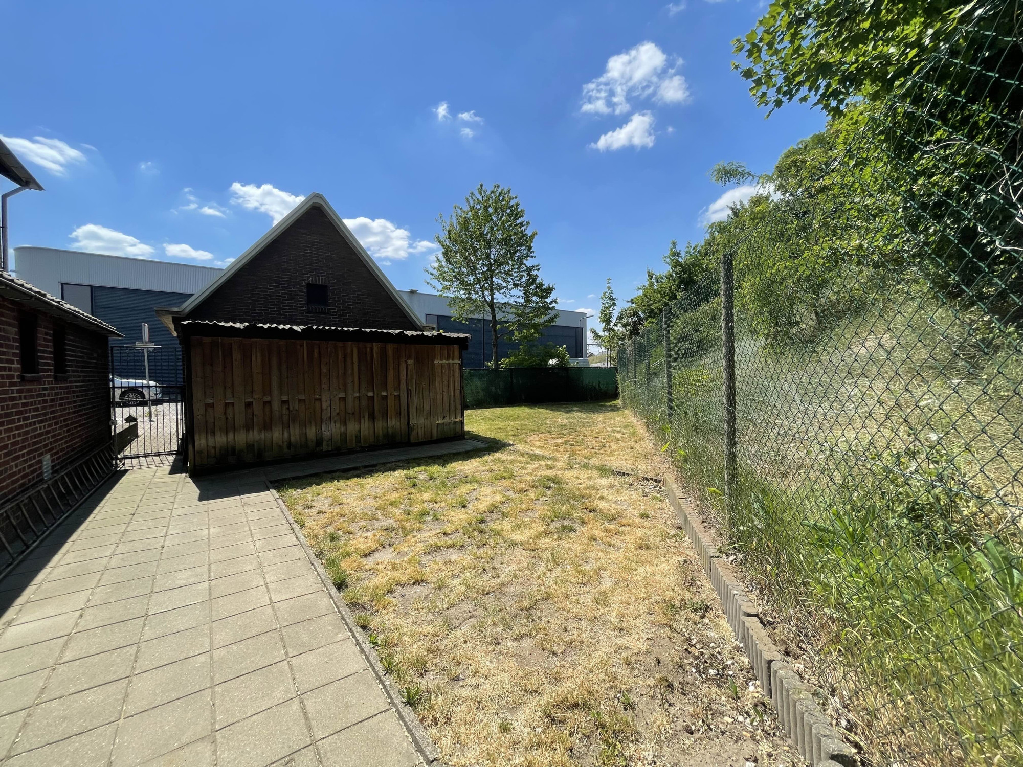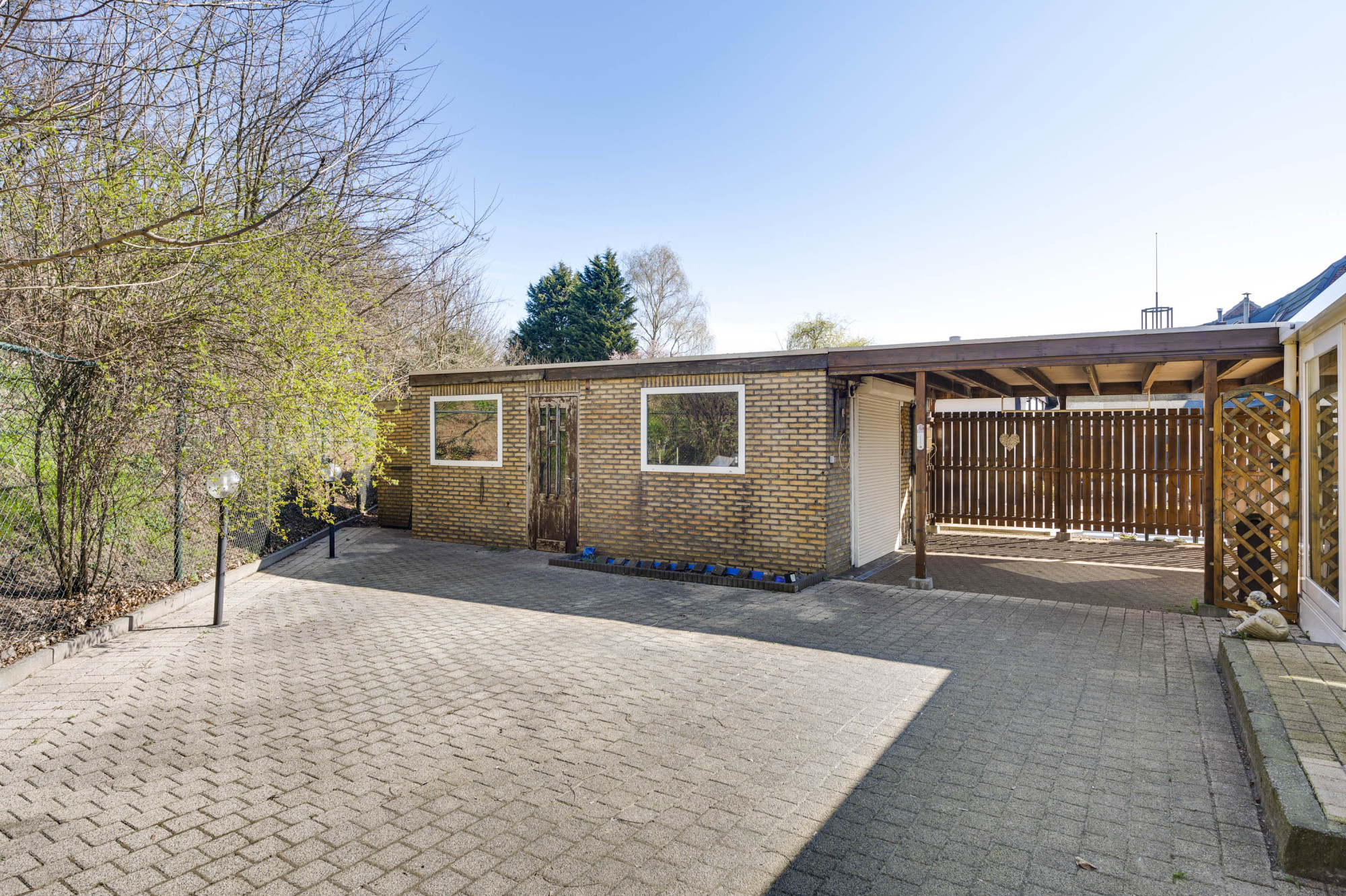 Er is een onderhoudsvriendelijke voortuin en een riante oprit, toegankelijk via een poort, die ruimte biedt aan meerdere voertuigen. De achter- en zijtuin is eveneens onderhoudsvriendelijk ingericht met bestrating en gazon en herbergt een vrijstaande garage, een aangebouwde berging en een voorgelegen carport. De garage is uitgerust met een smeerput, diverse krachtstroomaansluitingen, een elektrisch rolluik en een loopdeur naar de tuin. Tevens is er nog een houten schuurtje aanwezig.