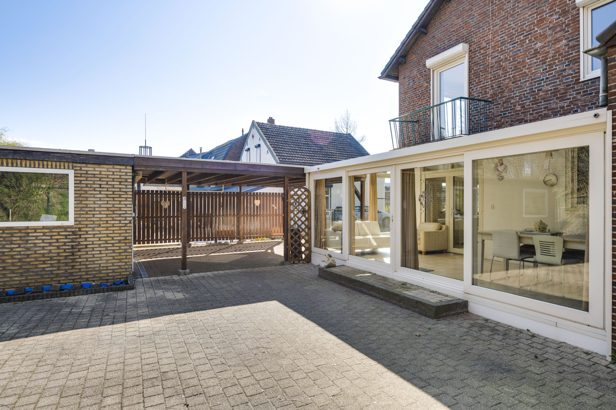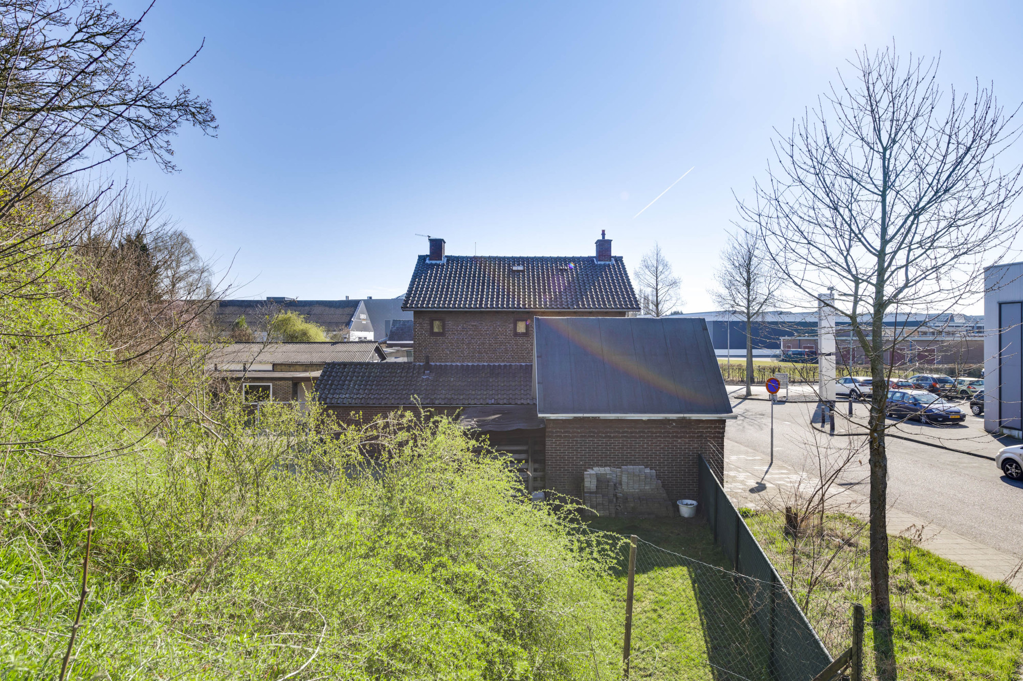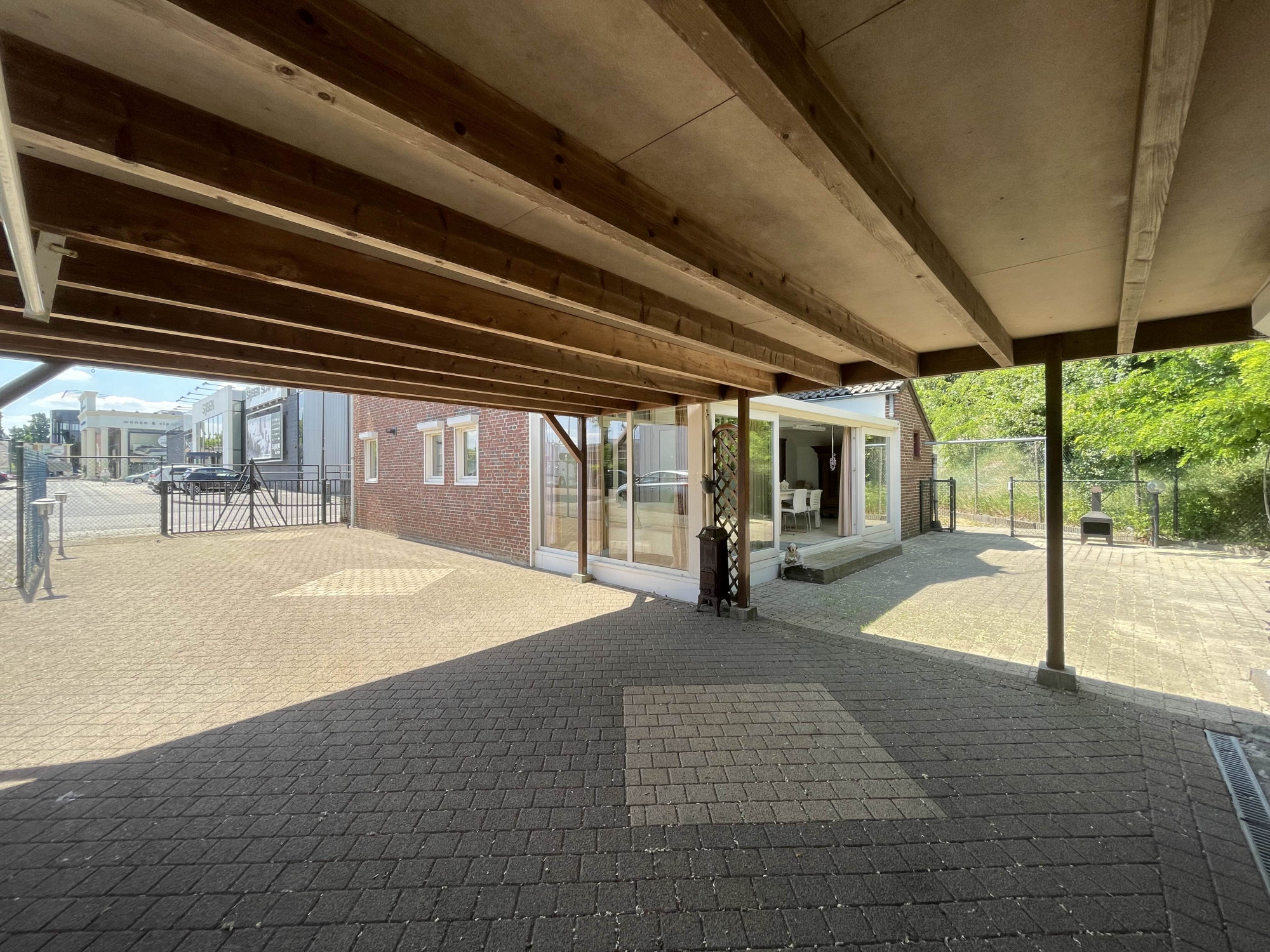 Er is een onderhoudsvriendelijke voortuin en een riante oprit, toegankelijk via een poort, die ruimte biedt aan meerdere voertuigen. De achter- en zijtuin is eveneens onderhoudsvriendelijk ingericht met bestrating en gazon en herbergt een vrijstaande garage, een aangebouwde berging en een voorgelegen carport. De garage is uitgerust met een smeerput, diverse krachtstroomaansluitingen, een elektrisch rolluik en een loopdeur naar de tuin. Tevens is er nog een houten schuurtje aanwezig.