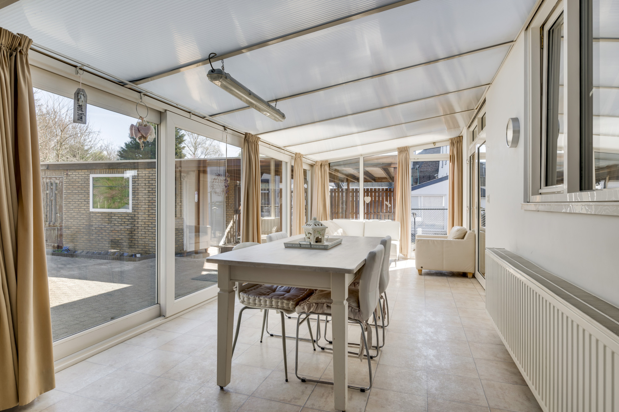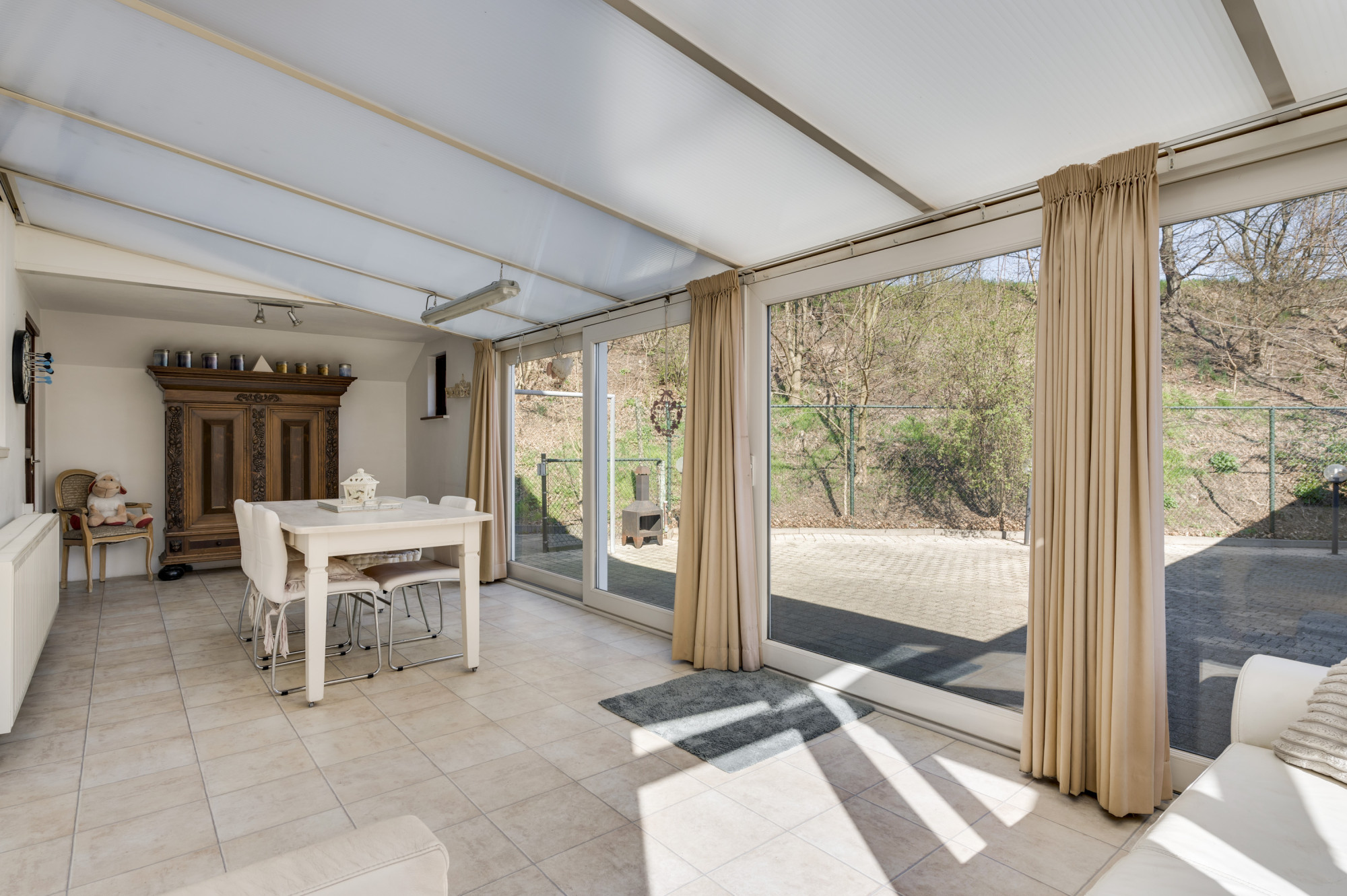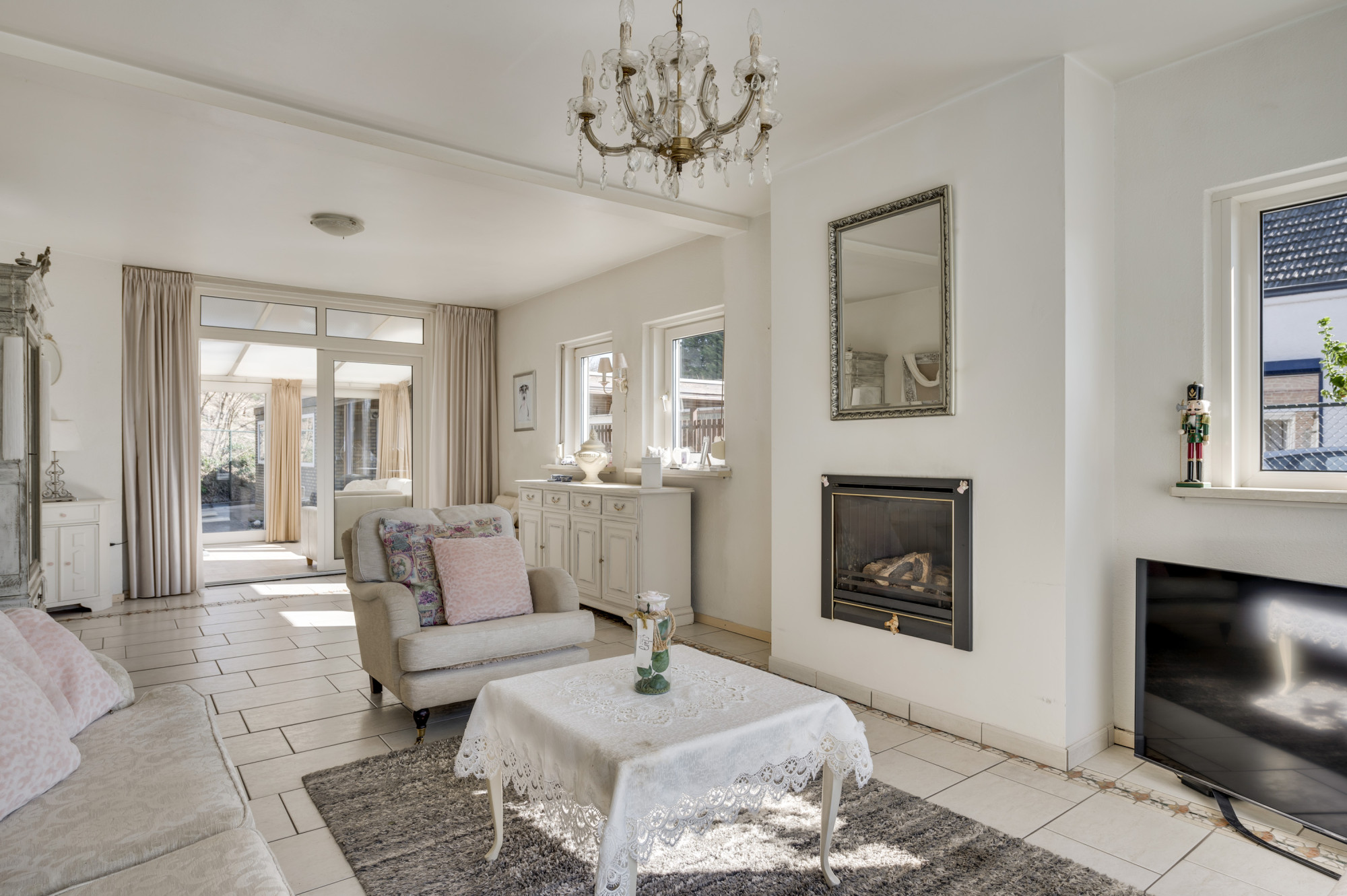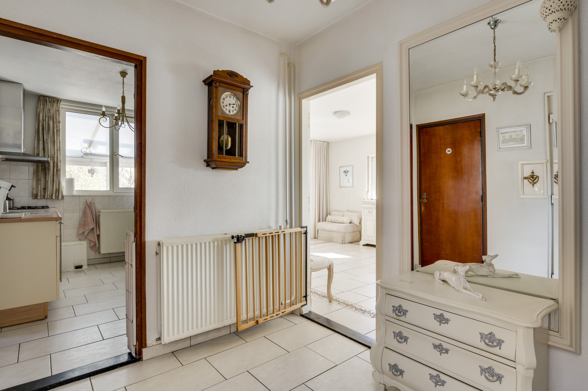Via de ruime hal, waar zich de trapopgang naar de eerste verdieping, de toiletruimte en de toegangen tot de kelder, keuken en woonkamer bevinden, ervaart u direct de functionele indeling van de woning. De woonkamer, voorzien van comfortabele vloerverwarming en een sfeervolle gashaard, profiteert van veel natuurlijk daglicht dankzij de grote raampartijen. Middels openslaande deuren bereikt u de ruime multifunctionele extra kamer (nu in gebruik als eetkamer) als verlengstuk van de woonkamer, waar het dankzij de schuifpui naar de tuin het hele jaar door heerlijk vertoeven is. Aangrenzend bevindt zich de praktische bijkeuken met witgoedaansluitingen, de opstelling van de cv-ketel (Vaillant Ecotec Plus VHR, huur, ca. 2020) en een wastafel. De keuken beschikt over een eenvoudige maar nette opstelling met een gasfornuis en een afzuigkap. De gehele begane grond is voorzien van een tegelvloer.