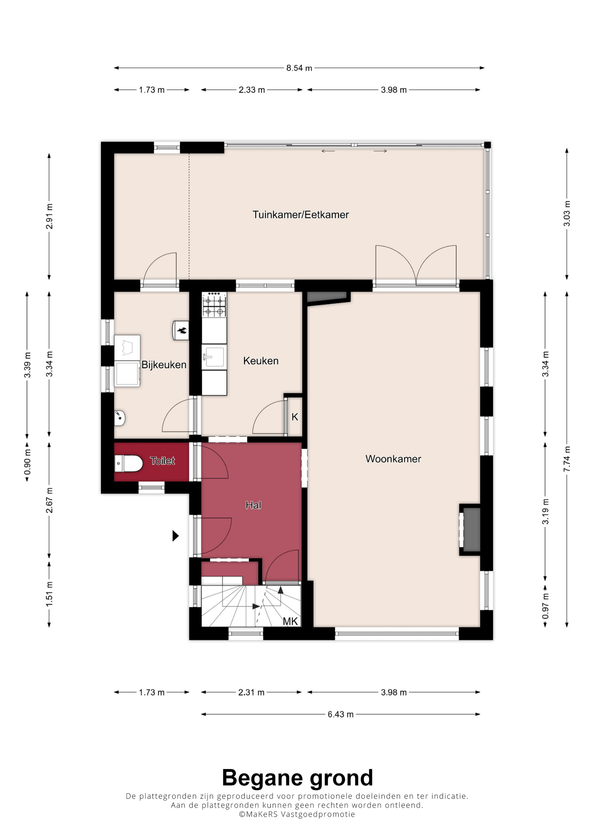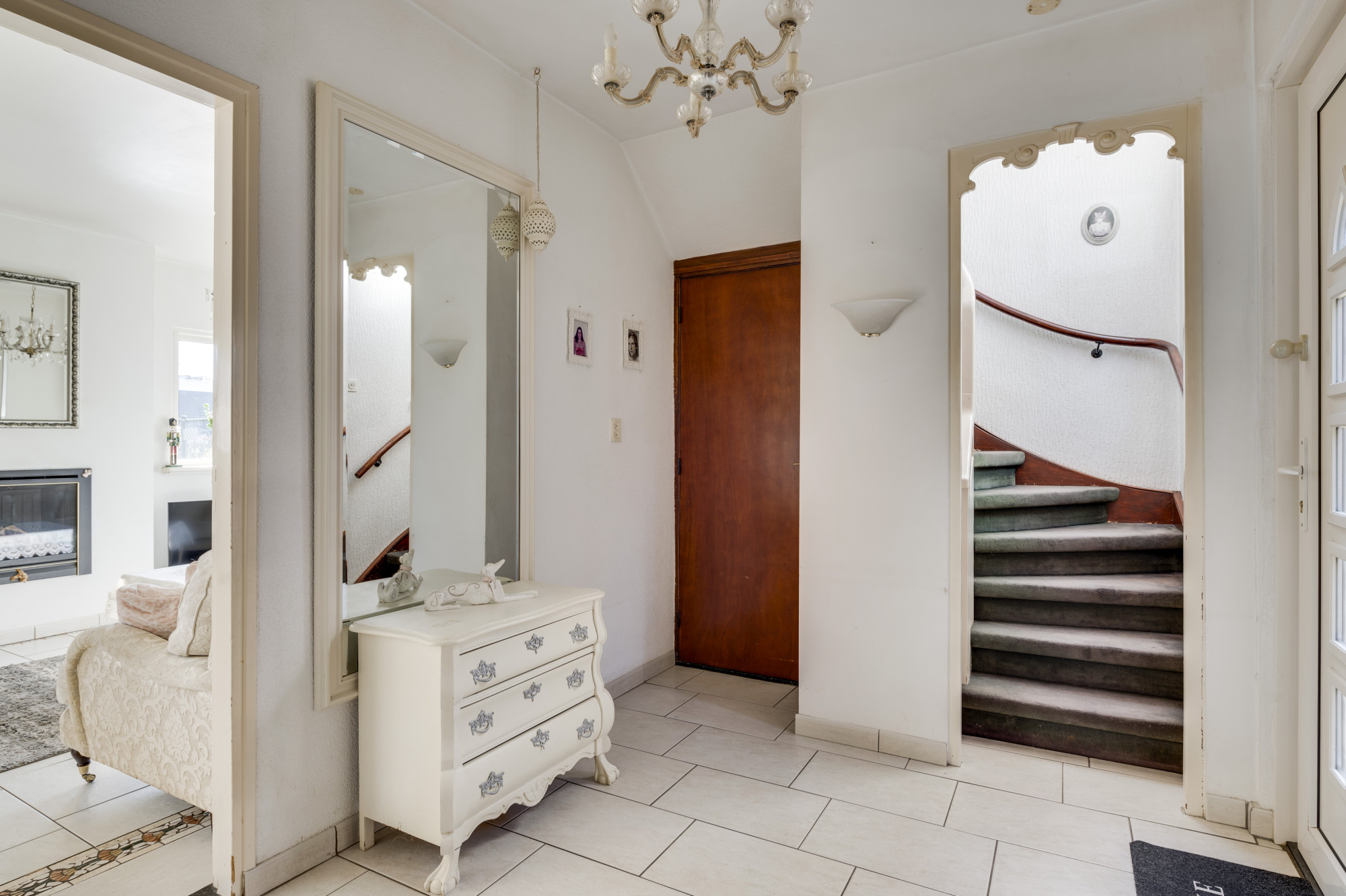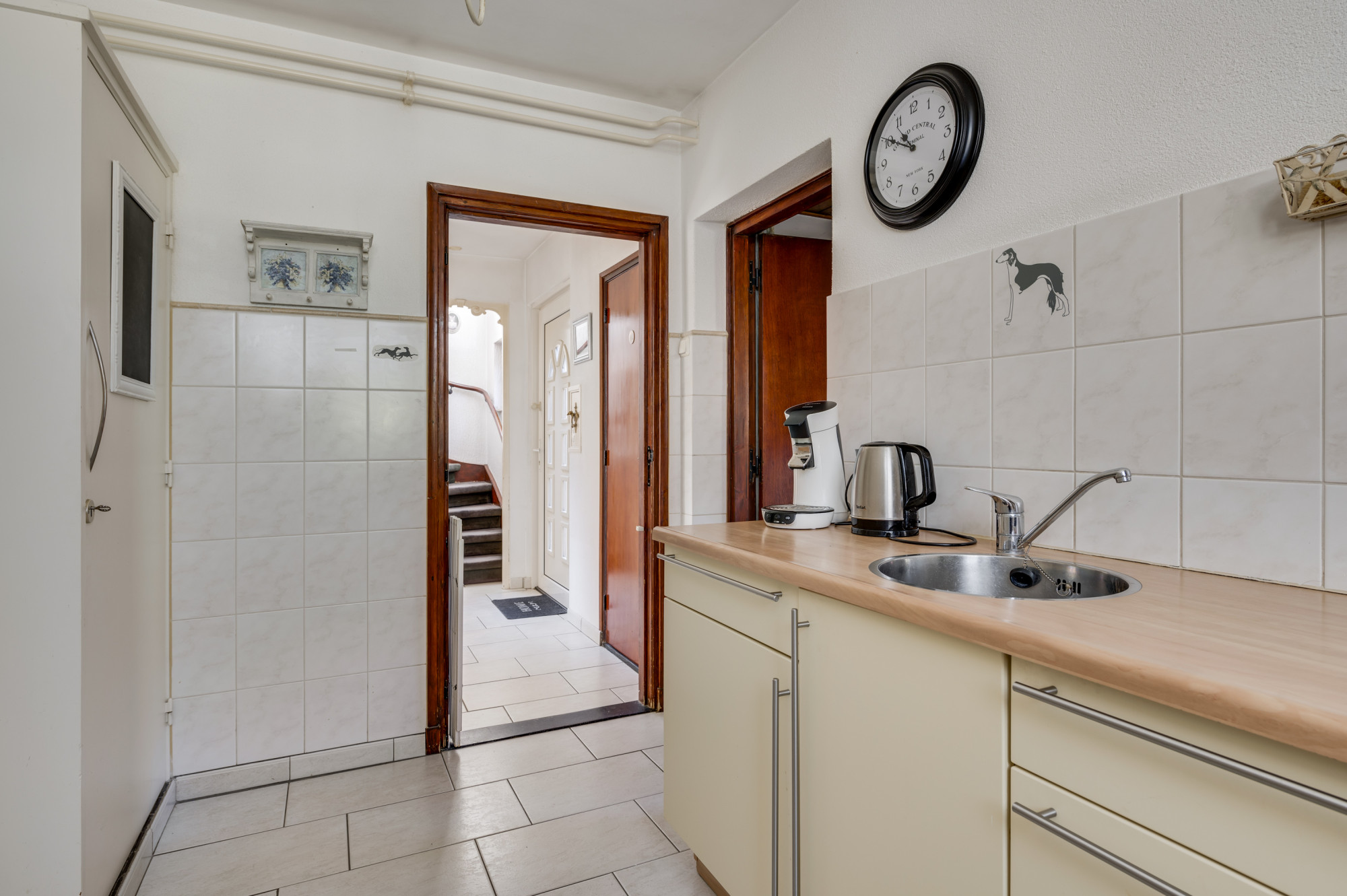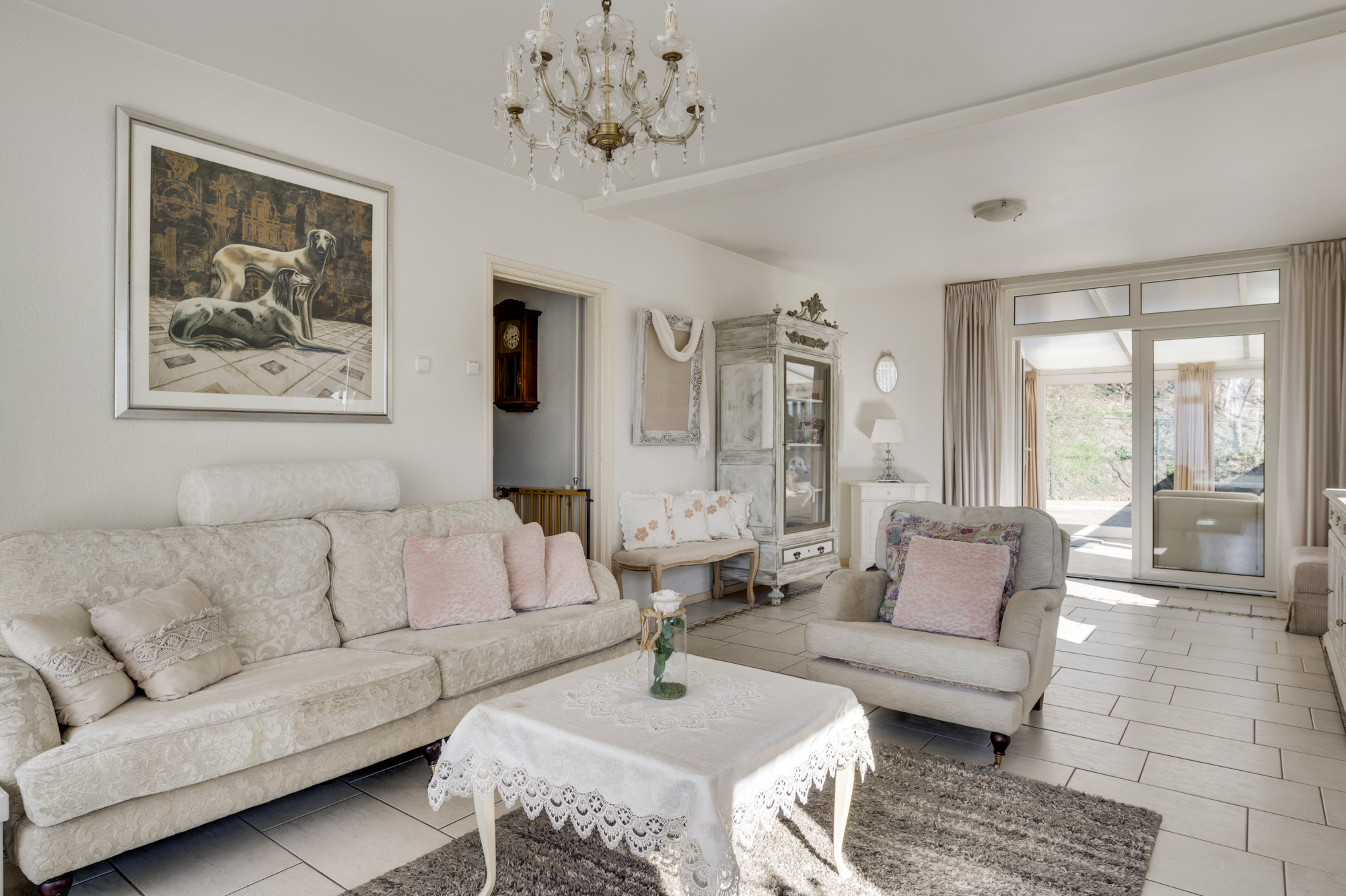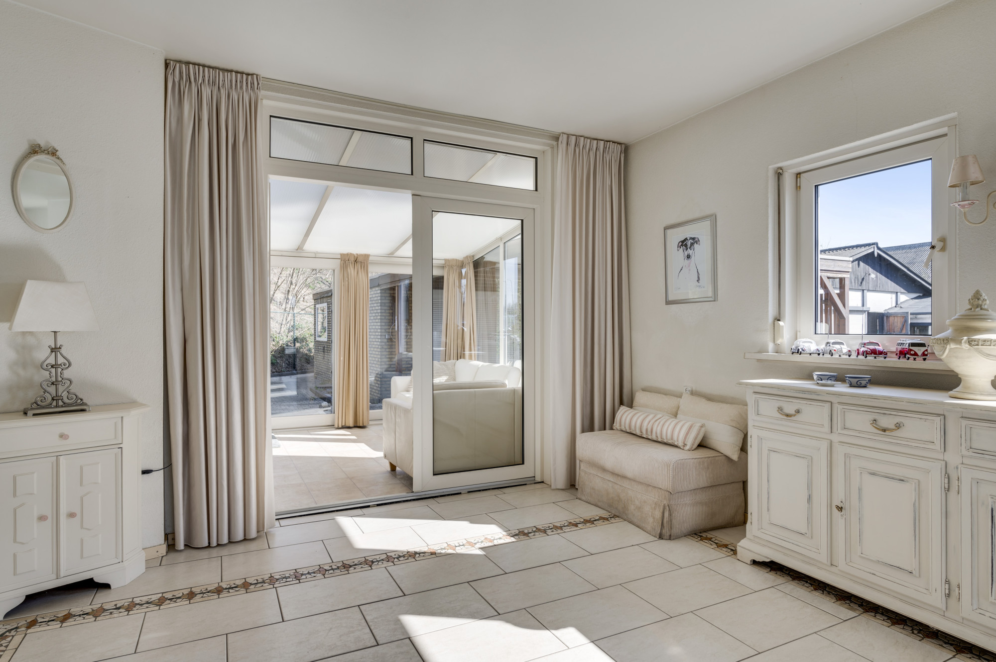 Via de ruime hal, waar zich de trapopgang naar de eerste verdieping, de toiletruimte en de toegangen tot de kelder, keuken en woonkamer bevinden, ervaart u direct de functionele indeling van de woning. De woonkamer, voorzien van comfortabele vloerverwarming en een sfeervolle gashaard, profiteert van veel natuurlijk daglicht dankzij de grote raampartijen. Middels openslaande deuren bereikt u de ruime multifunctionele extra kamer (nu in gebruik als eetkamer) als verlengstuk van de woonkamer, waar het dankzij de schuifpui naar de tuin het hele jaar door heerlijk vertoeven is. Aangrenzend bevindt zich de praktische bijkeuken met witgoedaansluitingen, de opstelling van de cv-ketel (Vaillant Ecotec Plus VHR, huur, ca. 2020) en een wastafel. De keuken beschikt over een eenvoudige maar nette opstelling met een gasfornuis en een afzuigkap. De gehele begane grond is voorzien van een tegelvloer.