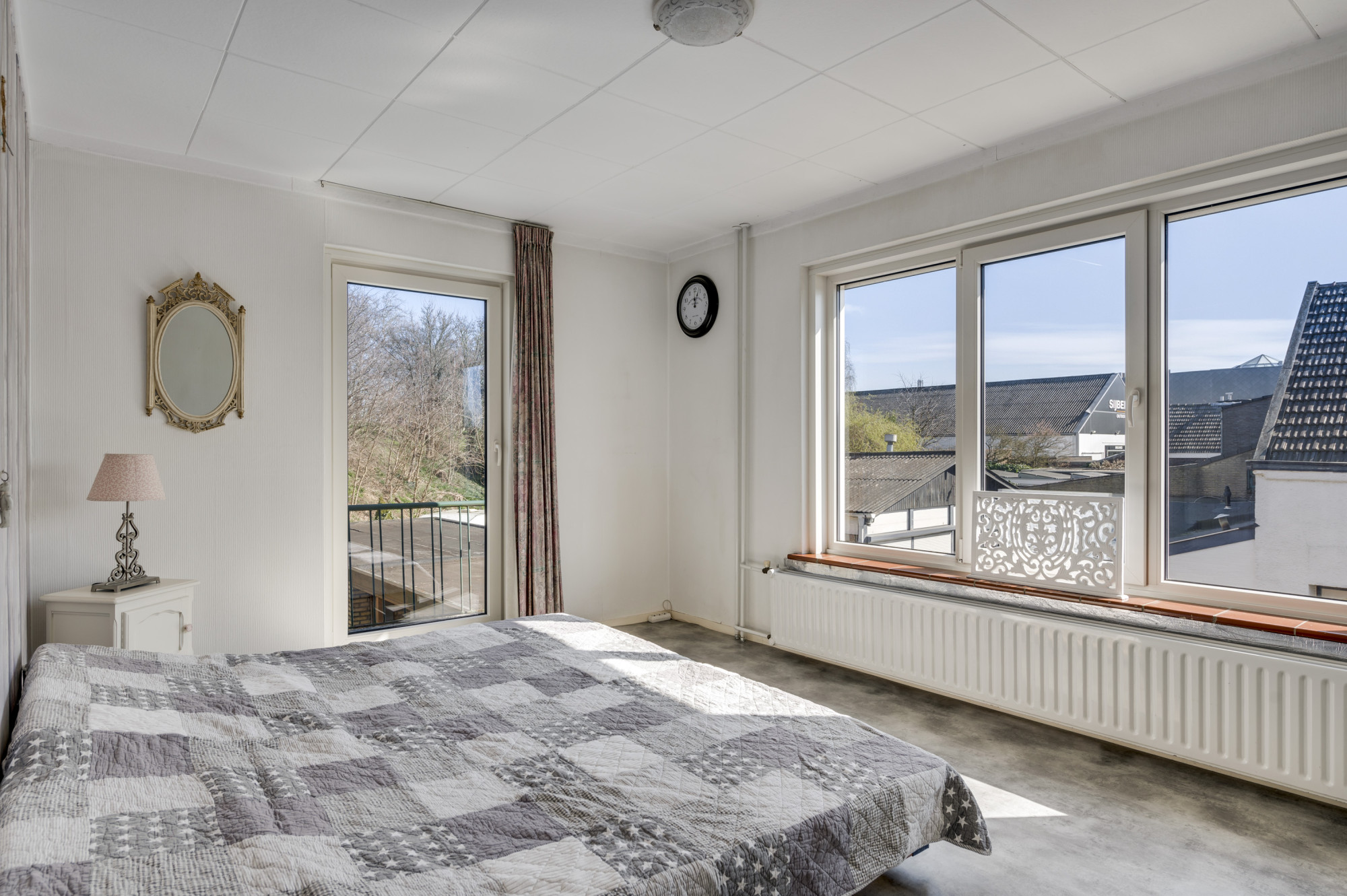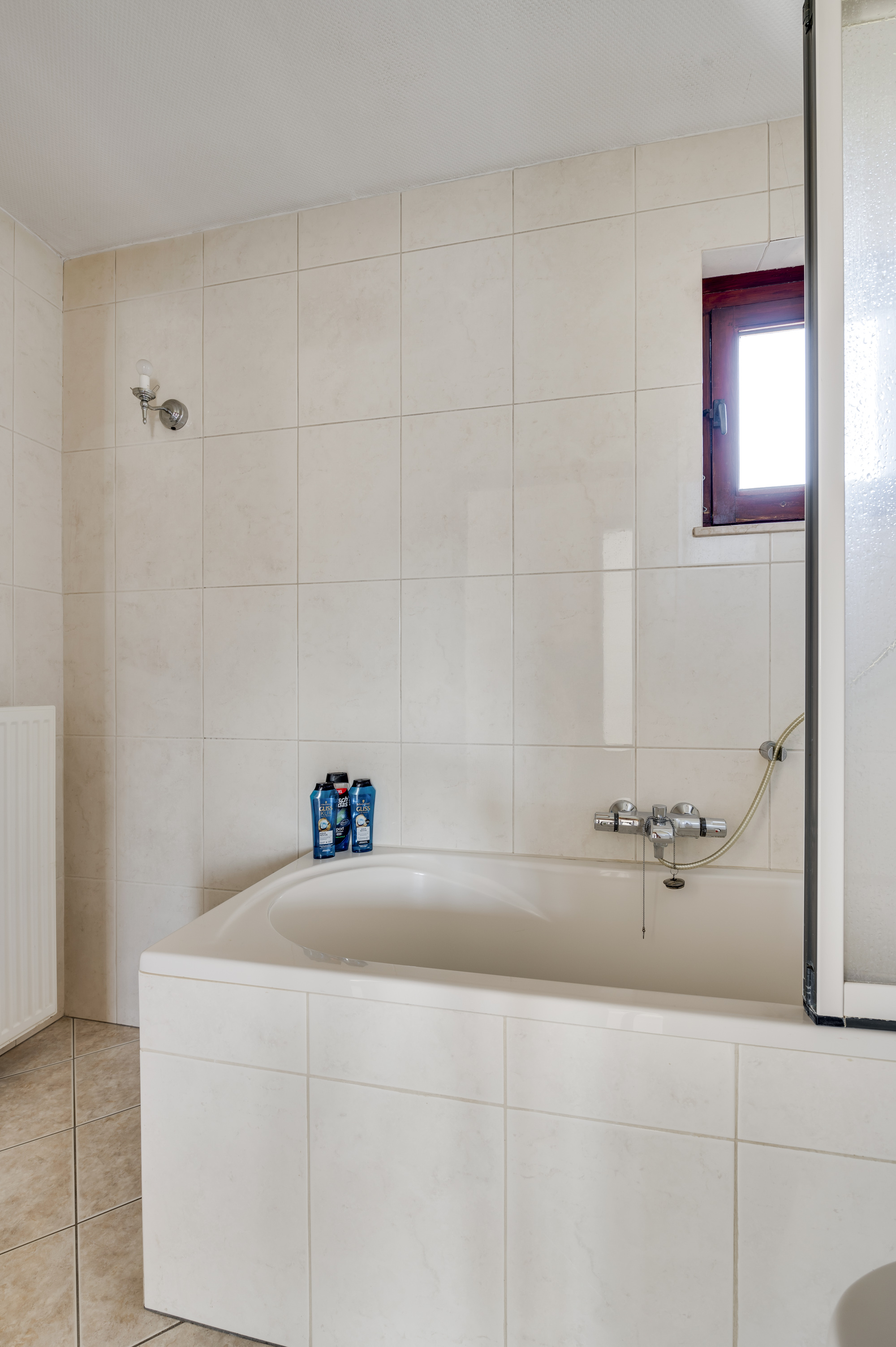 De overloop met vide biedt toegang tot drie slaapkamers, allen uitgerust met praktische muurkasten. Eén slaapkamer beschikt over een wastafel met meubel, terwijl een andere toegang biedt tot het balkon. De badkamer is voorzien van een ligbad/douchecombinatie en een toilet.