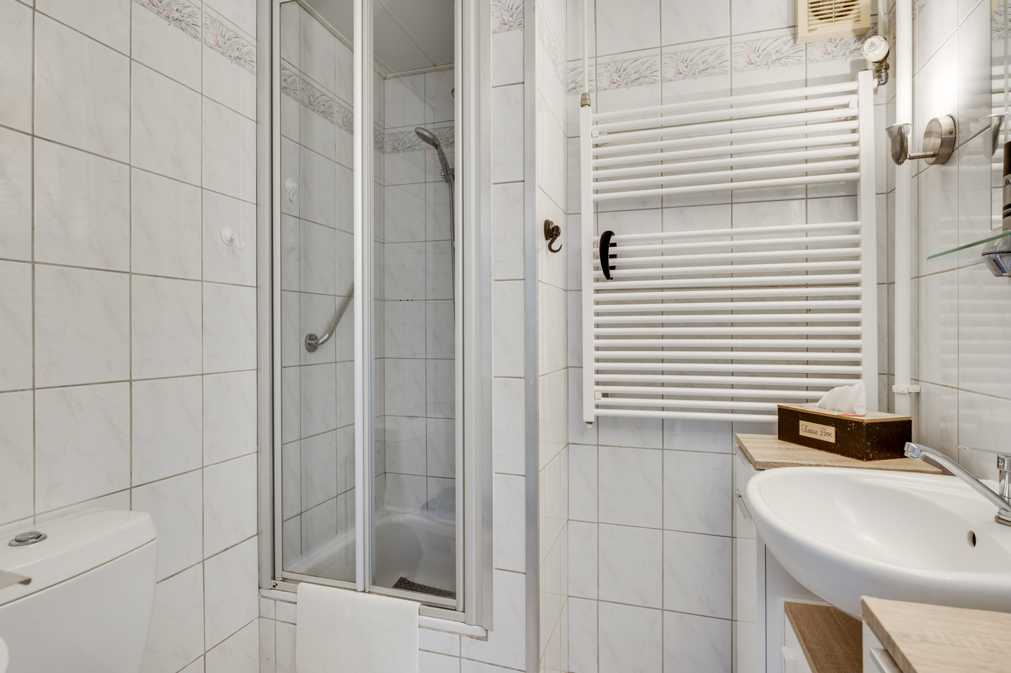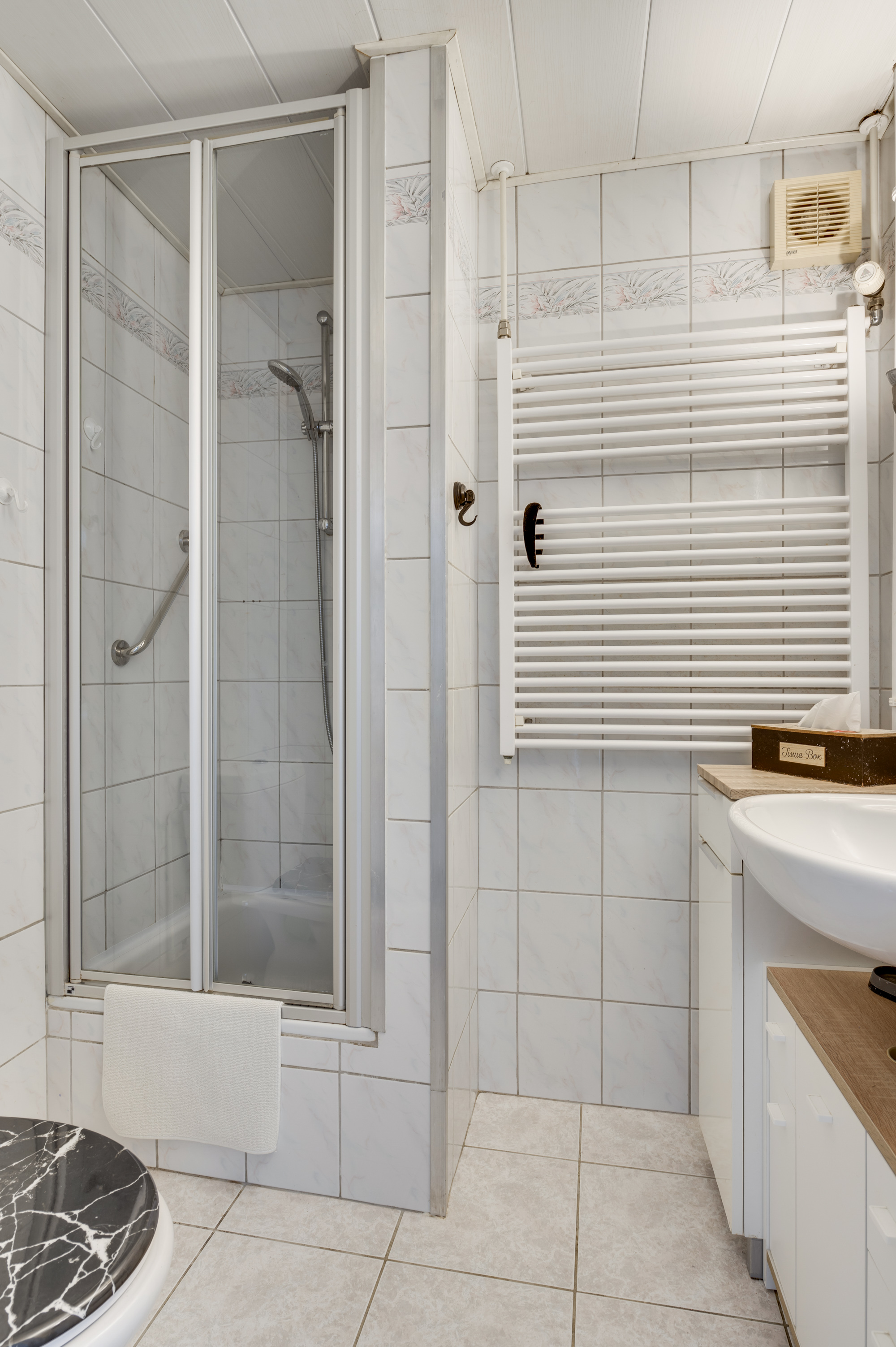 De overloop biedt toegang tot 4 slaapkamers waarvan 1 voorzien is van airconditioning en 2 voorzien zijn van een muurkast. De geheel betegelde badkamer is voorzien van een toilet, douche, wastafel, design radiator en mechanische ventilatie.