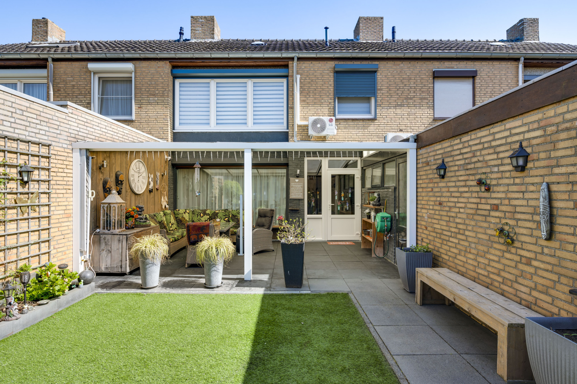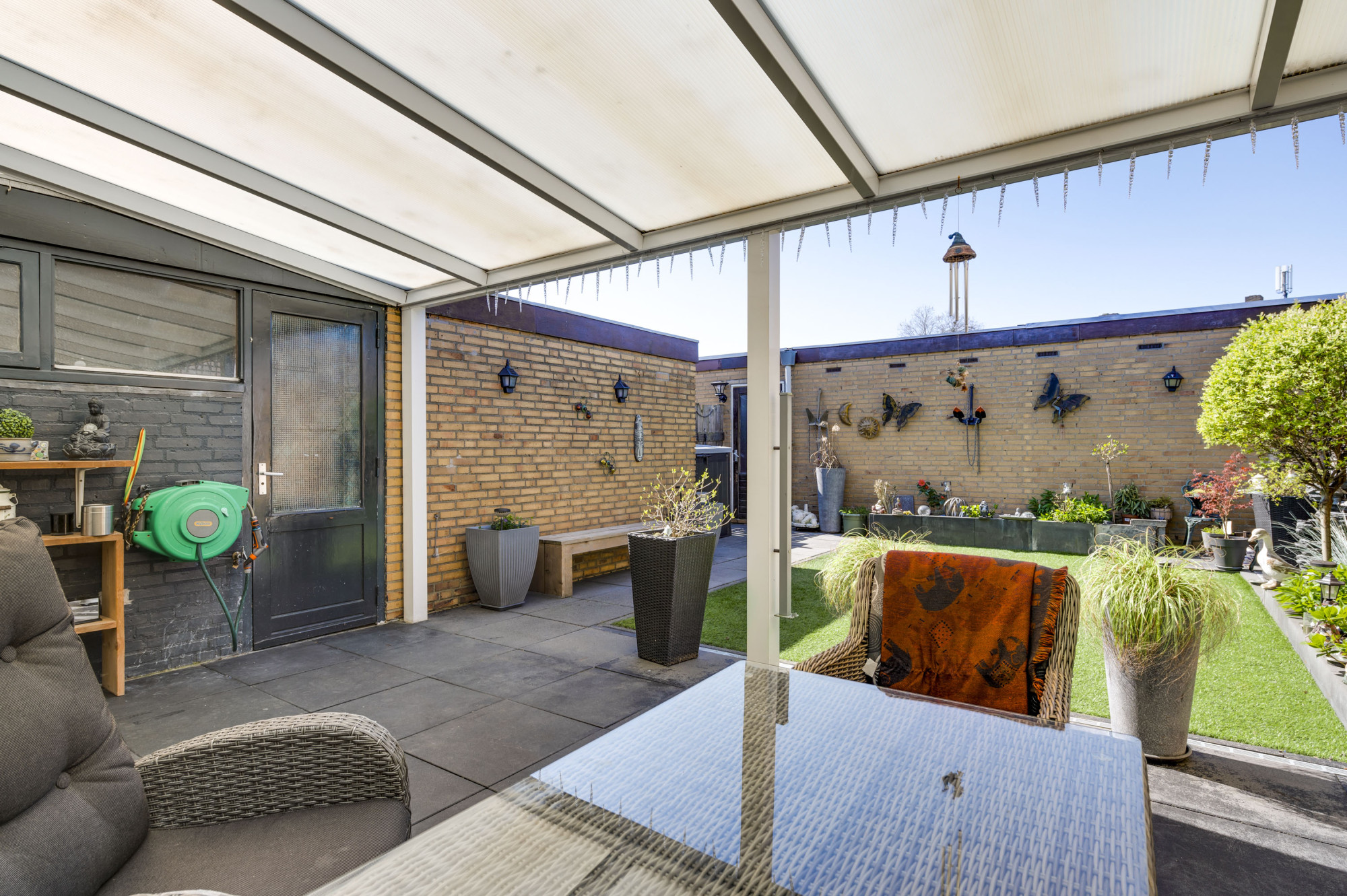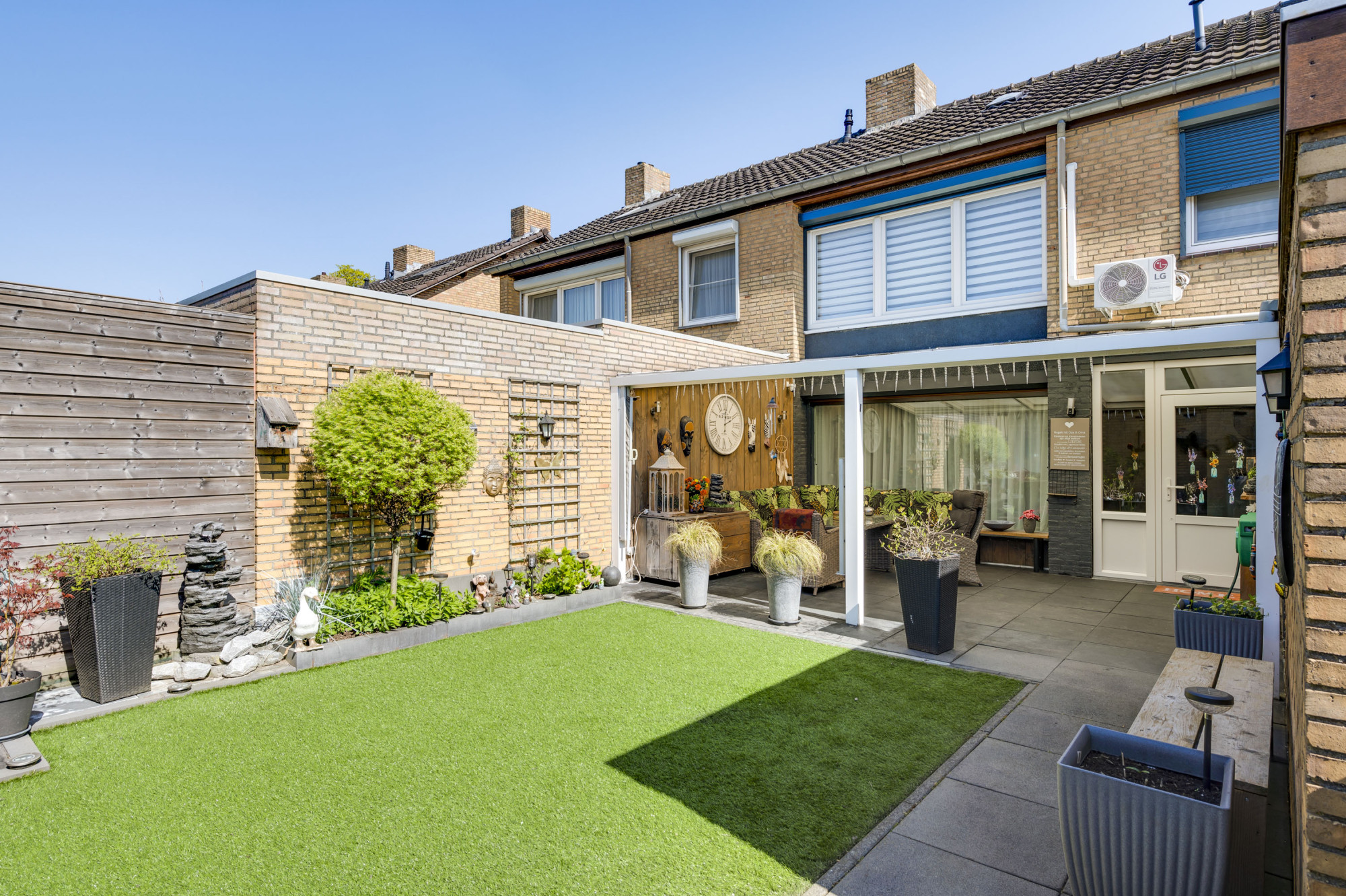 De voor- en achtertuin zijn mooi aangelegd, waarvan de zonnige achtertuin is voorzien van een terras met hoogwaardige overkapping, kunstgazon, borders, berging en een vrije achterom! Verder is er nog, direct vanuit de eigen tuin, toegang tot de garage met elektrische sectionaalpoort die leidt naar het achter terrein.