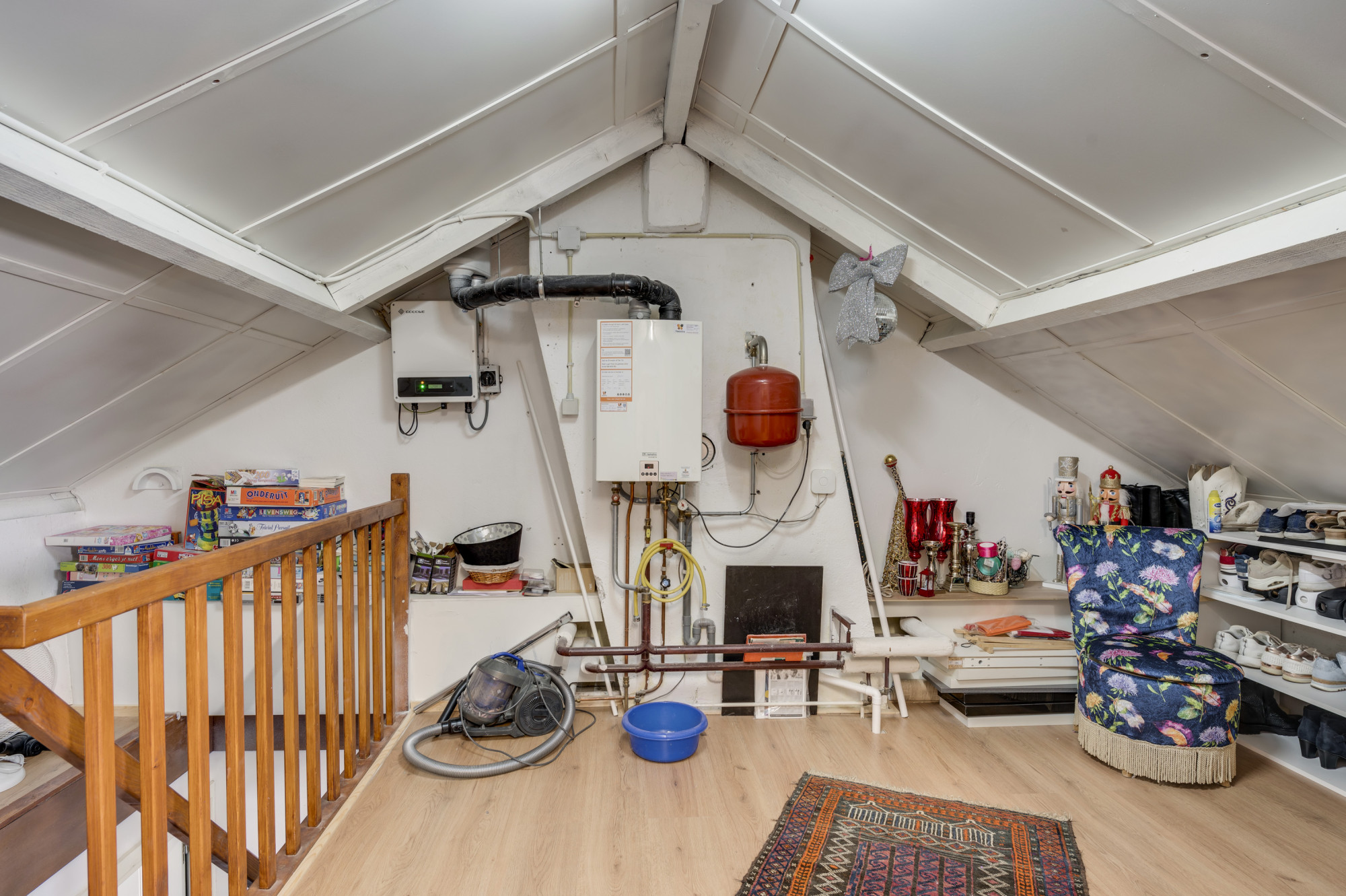 Te bereiken via een vaste trap (vanuit de 4e slaapkamer); een ruime extra (5e) zolderkamer met hoge nokhoogte met in het voorportaal extra bergruimte en de opstelling van de CV-combiketel (Remeha Avanta HR, 2003, eigendom).