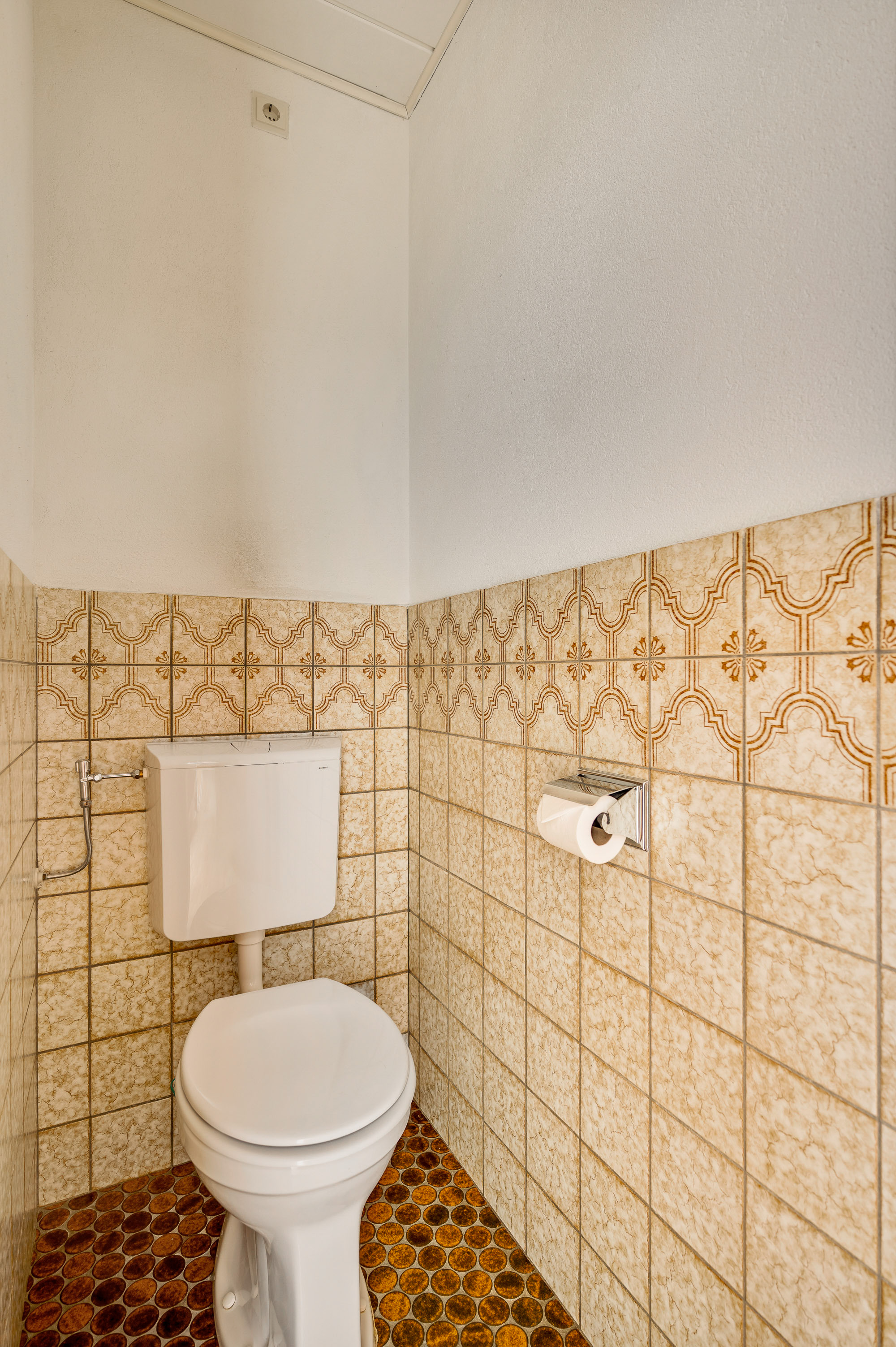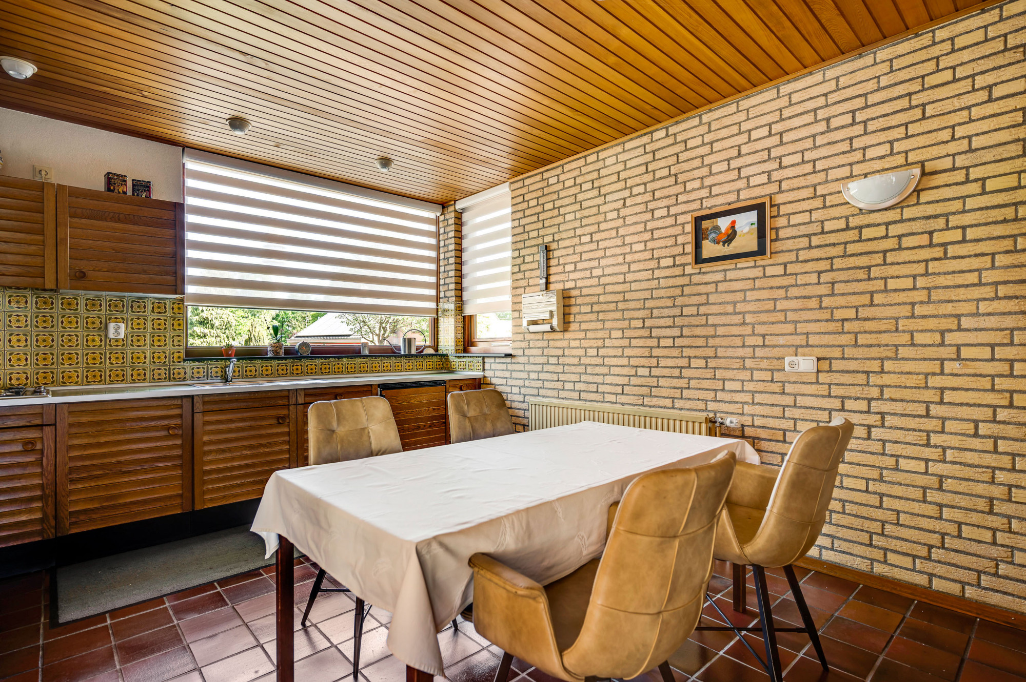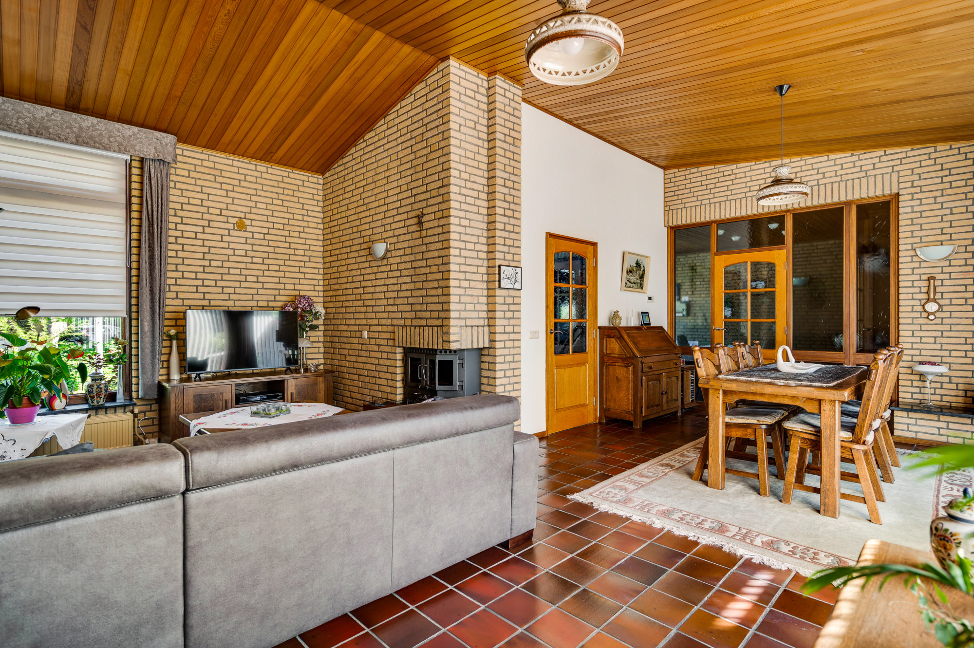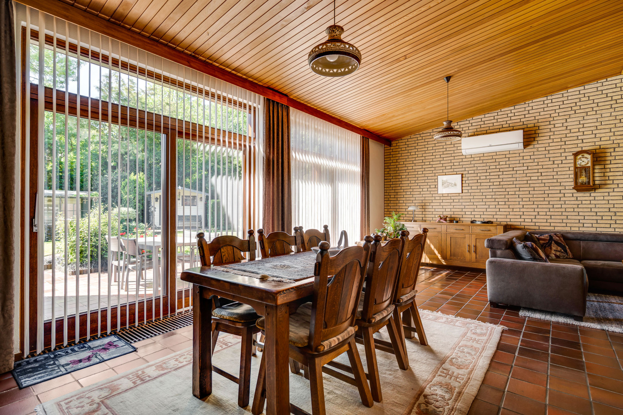 U betreedt de woning via de hal, met toegang tot de woonkamer, de woonkeuken en een moderne toiletruimte voorzien van een zwevend toilet en fonteintje. De riante L-vormige woonkamer biedt een prettige lichtinval en een directe verbinding met de tuin via een dubbele schuifpui. Hier komt het buitenleven letterlijk naar binnen. Een sfeervolle open haard en airconditioning zorgen voor extra comfort in elk seizoen. De woonkeuken is ook vanuit de woonkamer bereikbaar en beschikt over een eenvoudige keukenopstelling met diverse inbouwapparatuur, waaronder een gasfornuis, afzuigkap en koelkast. Middels een tussenportaal is de verdieping toegankelijk.