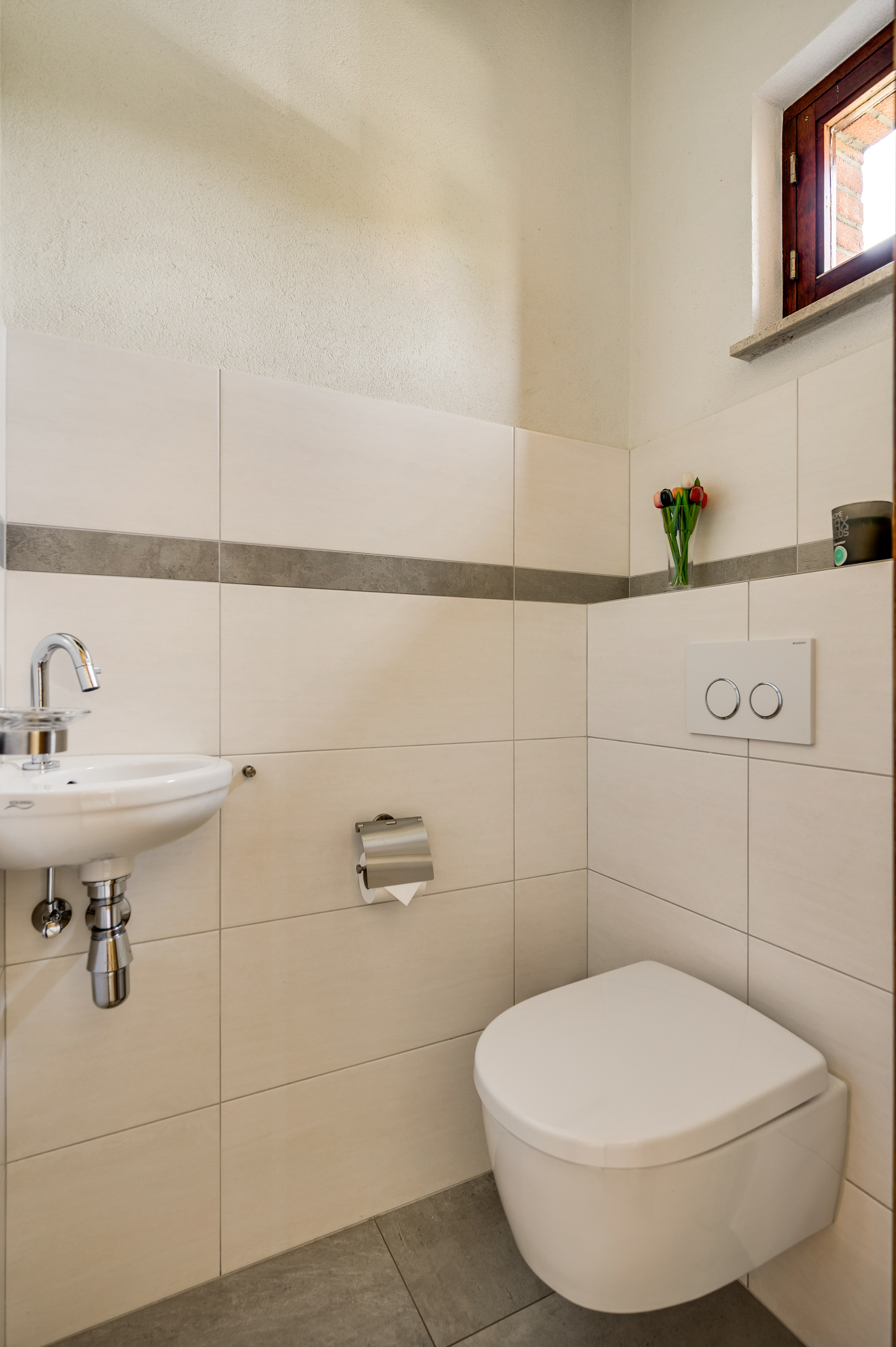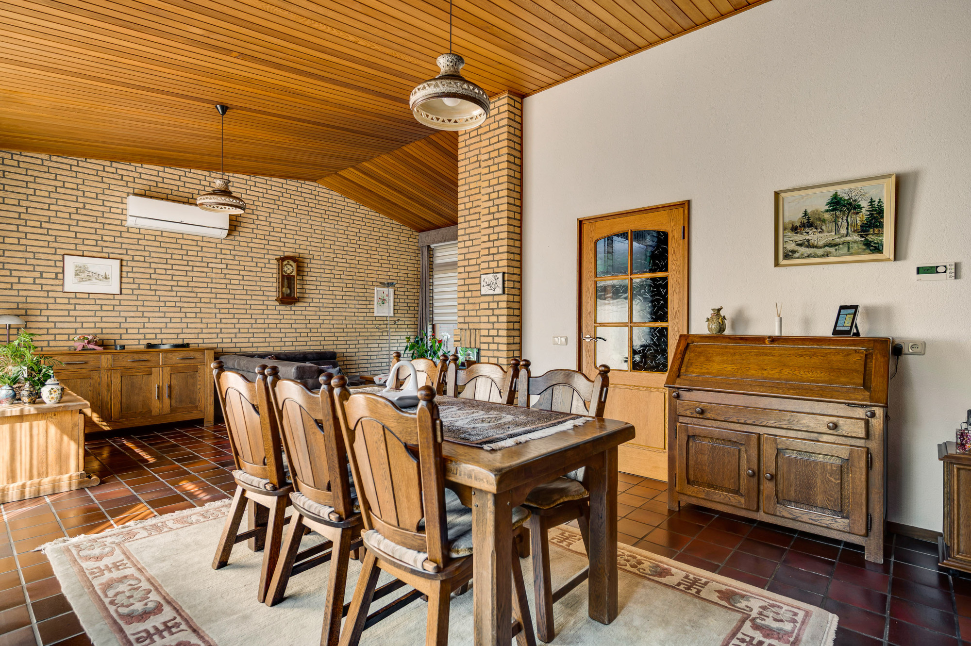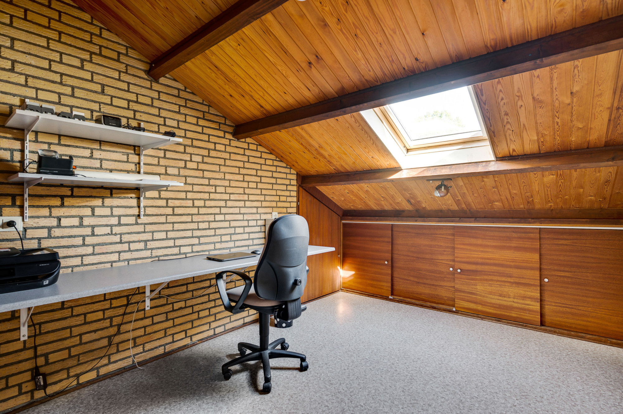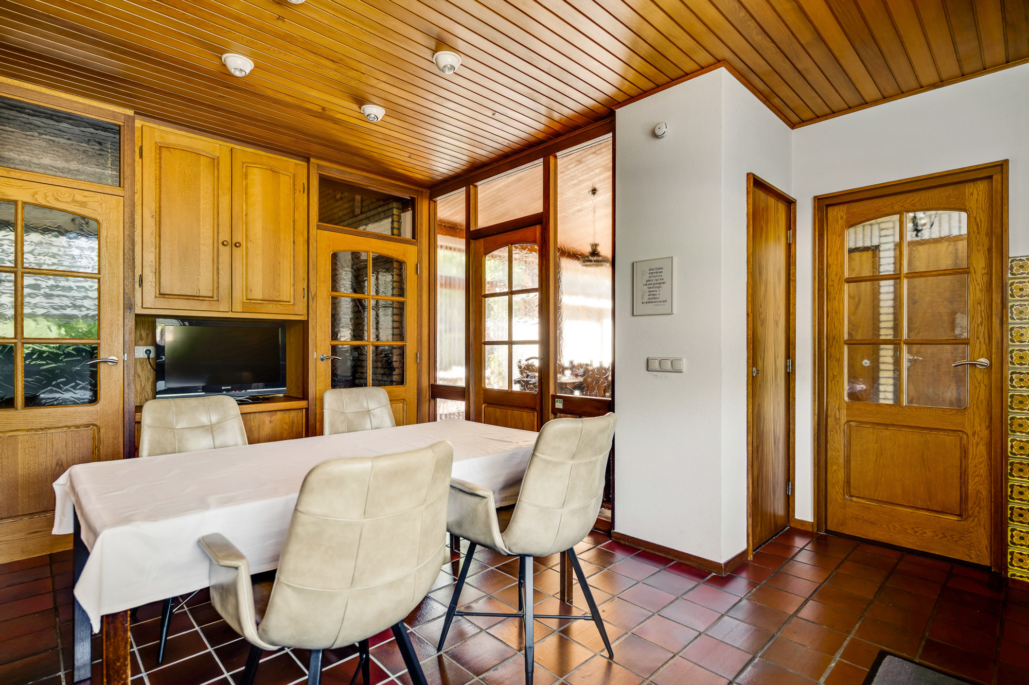 U betreedt de woning via de hal, met toegang tot de woonkamer, de woonkeuken en een moderne toiletruimte voorzien van een zwevend toilet en fonteintje. De riante L-vormige woonkamer biedt een prettige lichtinval en een directe verbinding met de tuin via een dubbele schuifpui. Hier komt het buitenleven letterlijk naar binnen. Een sfeervolle open haard en airconditioning zorgen voor extra comfort in elk seizoen. De woonkeuken is ook vanuit de woonkamer bereikbaar en beschikt over een eenvoudige keukenopstelling met diverse inbouwapparatuur, waaronder een gasfornuis, afzuigkap en koelkast. Middels een tussenportaal is de verdieping toegankelijk.