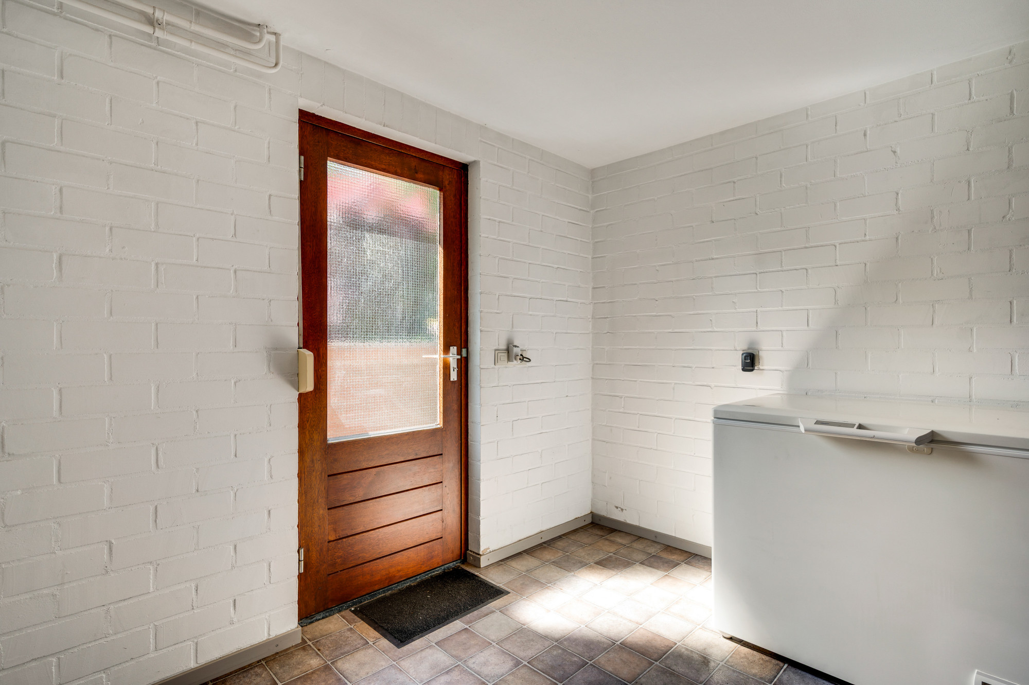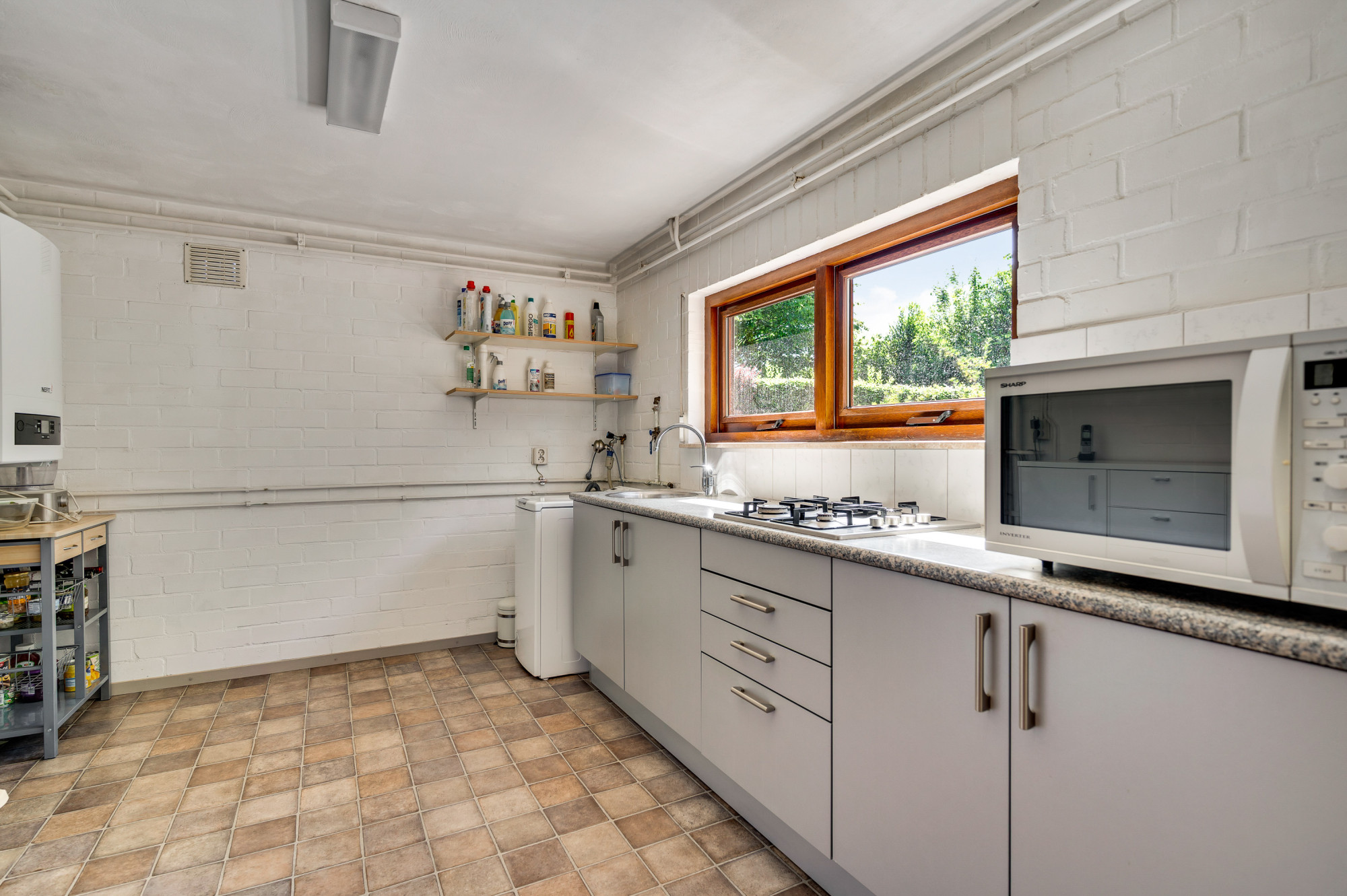 Middels een tussenportaal is middels enkele treden het verdiepte souterrain te bereiken met verrassend veel extra ruimte; waaronder een portaal met bergruimte, de inpandige garage en de bijkeuken, allen met daglichttoetreding. De bijkeuken is voorzien van een tweede keukenopstelling met gasfornuis, witgoedaansluitingen en de opstelling van de cv-combiketel (Nefit Trendline II HRC30 CW5, eigendom, ca. 2016). Heel praktisch is vanuit het portaal ook de tuin te bereiken. Het souterrain is afgewerkt met een tegelvloer.