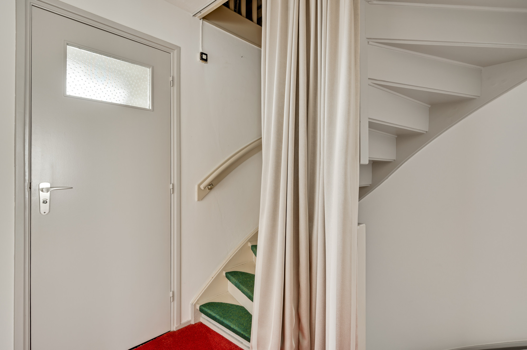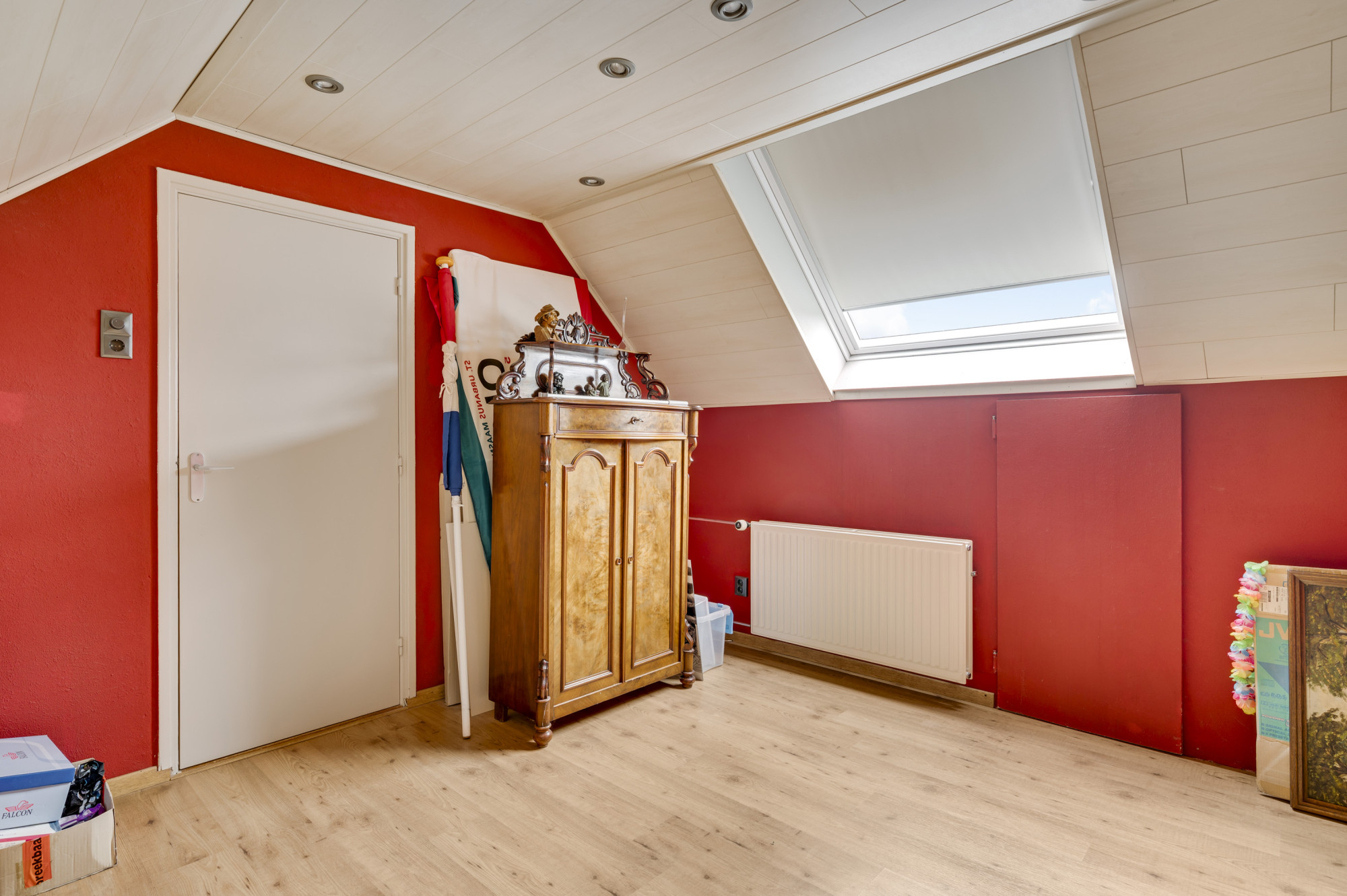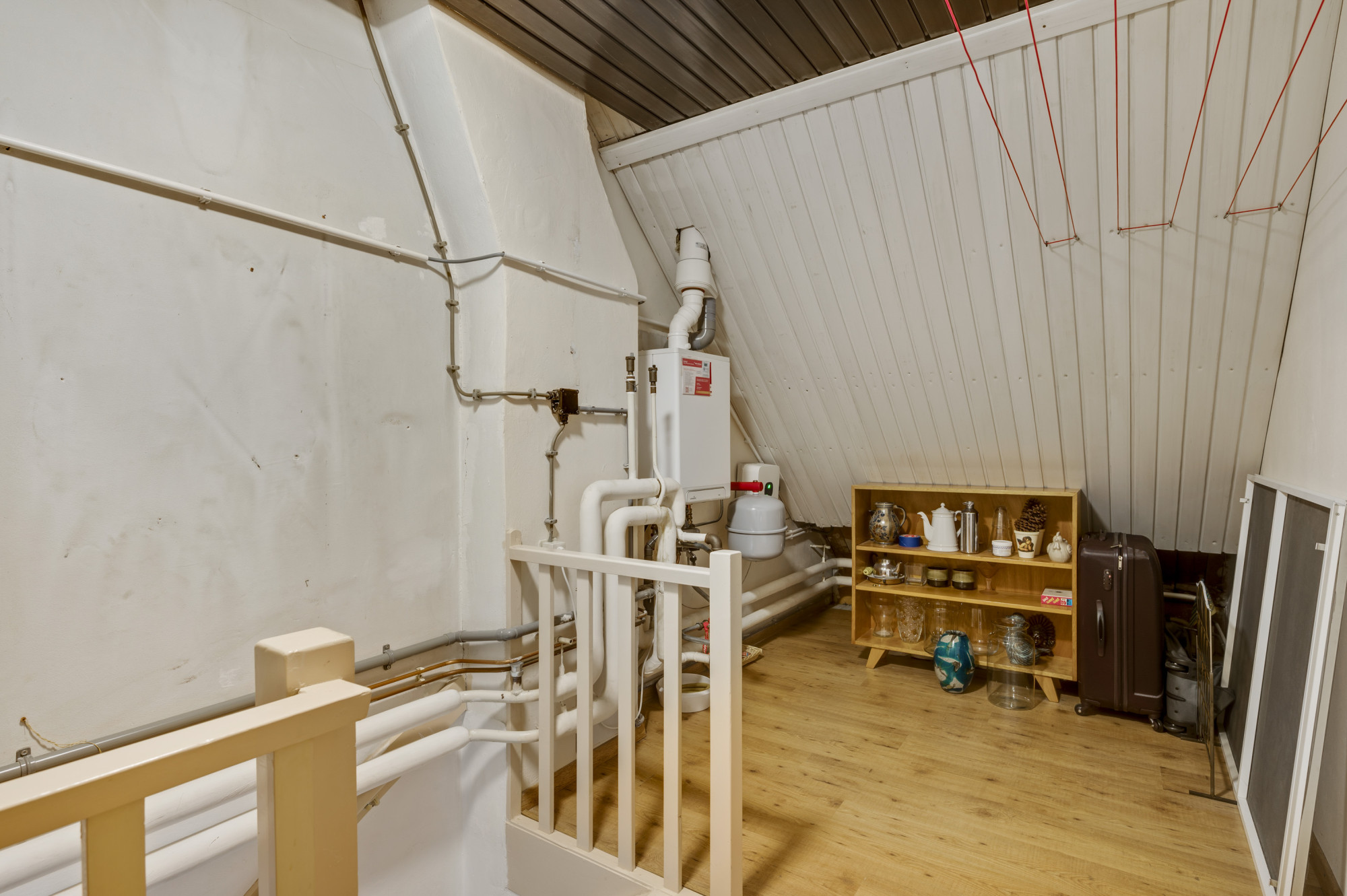 De tweede verdieping is bereikbaar via een vaste trap. Hier vindt u een ruime overloop met de aansluitingen voor wasmachine en droger, de opstelling van de cv-ketel (Intergas HR, ca. 2016, huur) en toegang tot de vierde slaapkamer. Deze kamer beschikt over een dakraam en extra bergruimte in het knieschot, ideaal als logeer- of werkkamer.