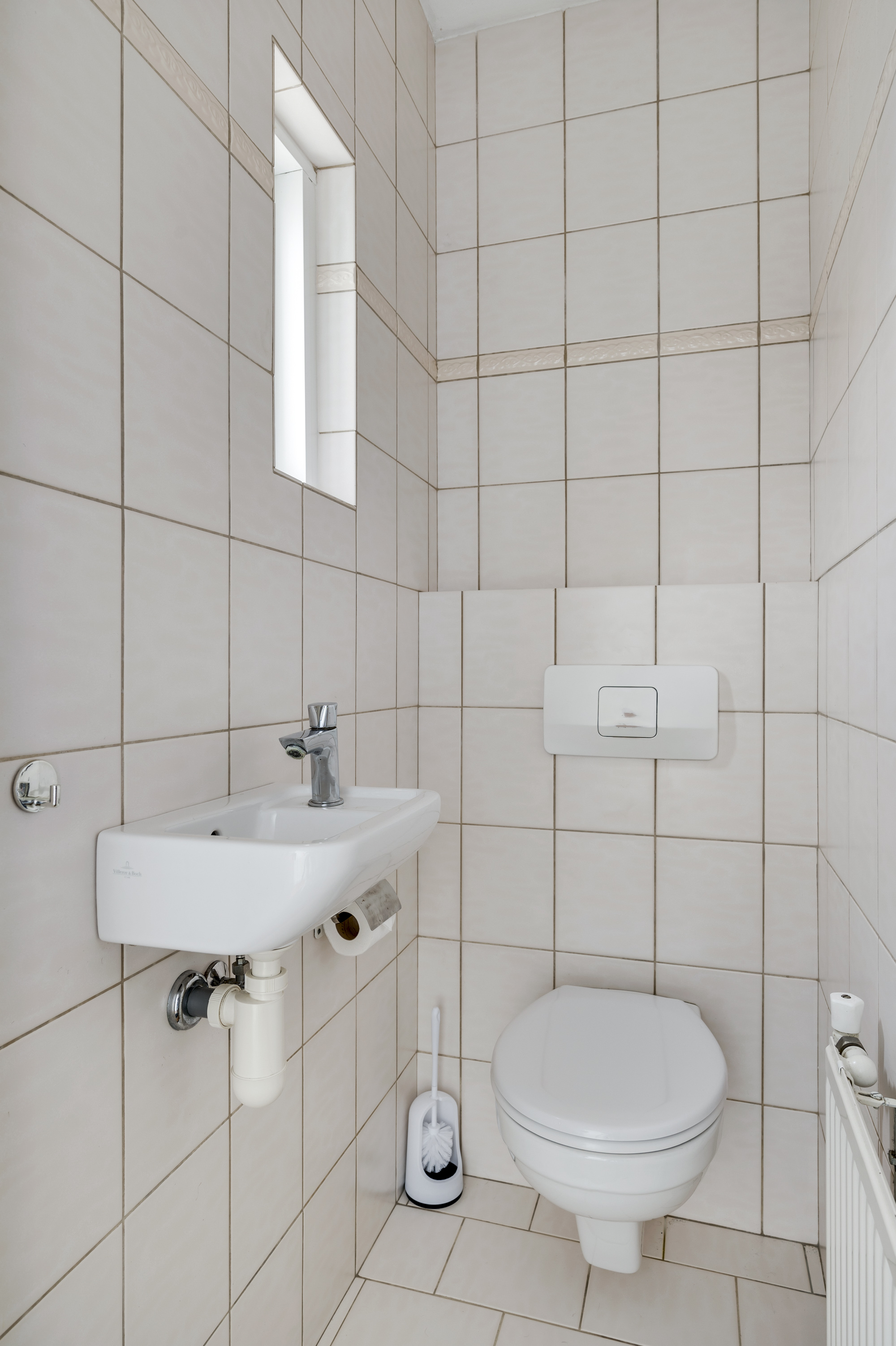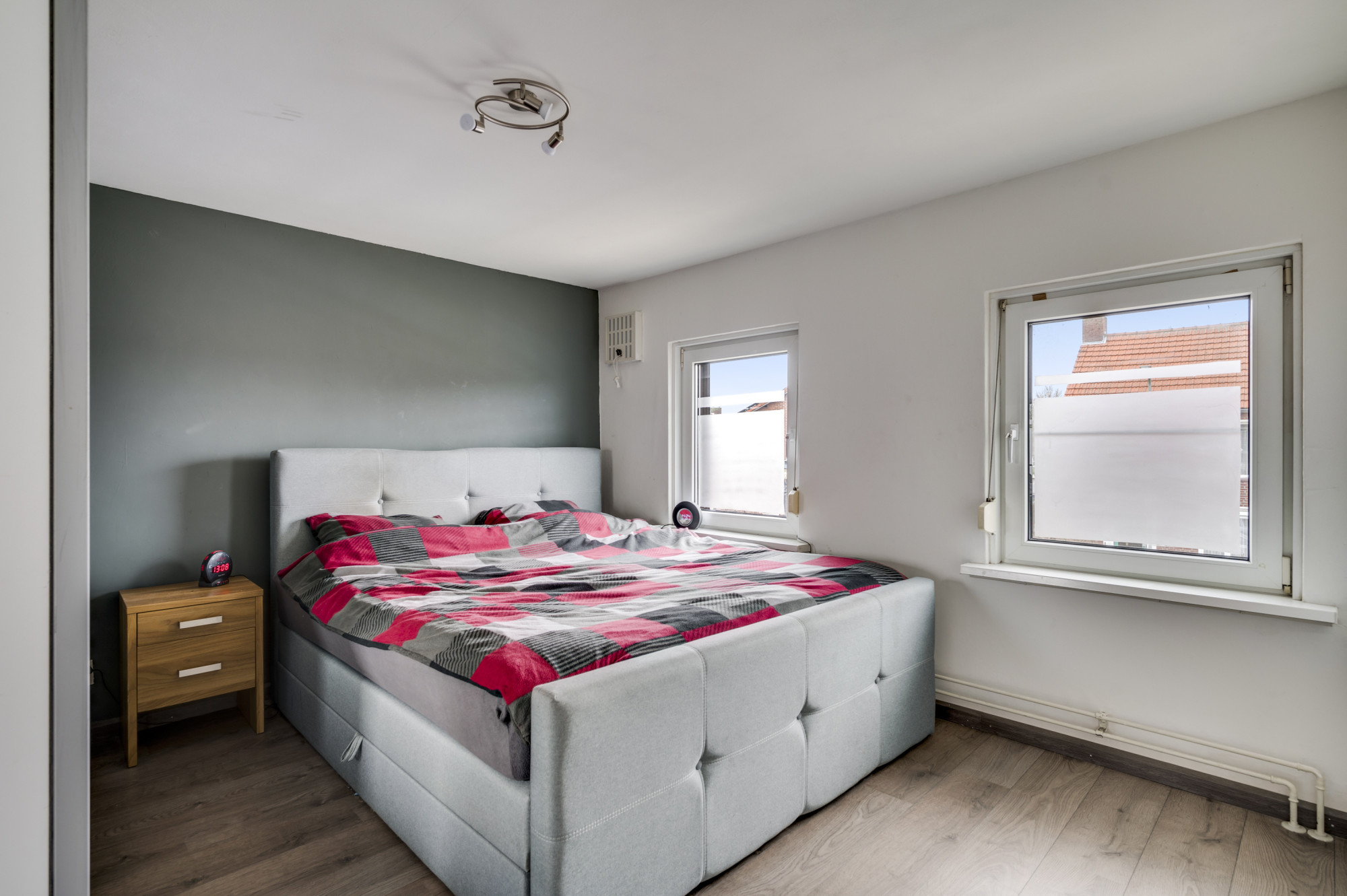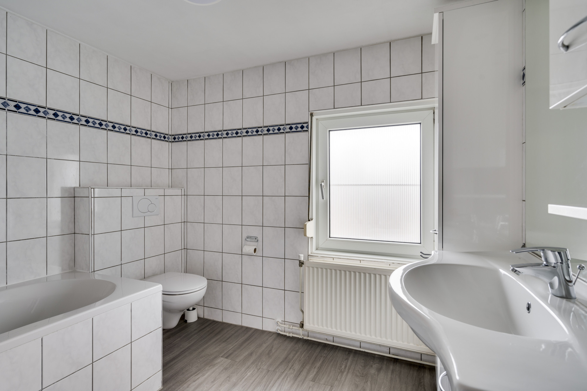 De overloop geeft hier toegang tot 3 slaapkamers, allen voorzien van een fraaie doorlopende laminaatvloer. De badkamer is uitgerust met een nette pvc-vloer en een ligbad, douche, badkamermeubel met wastafel en een zwevend toilet en hier bevindt zich de wasmachineaansluiting.