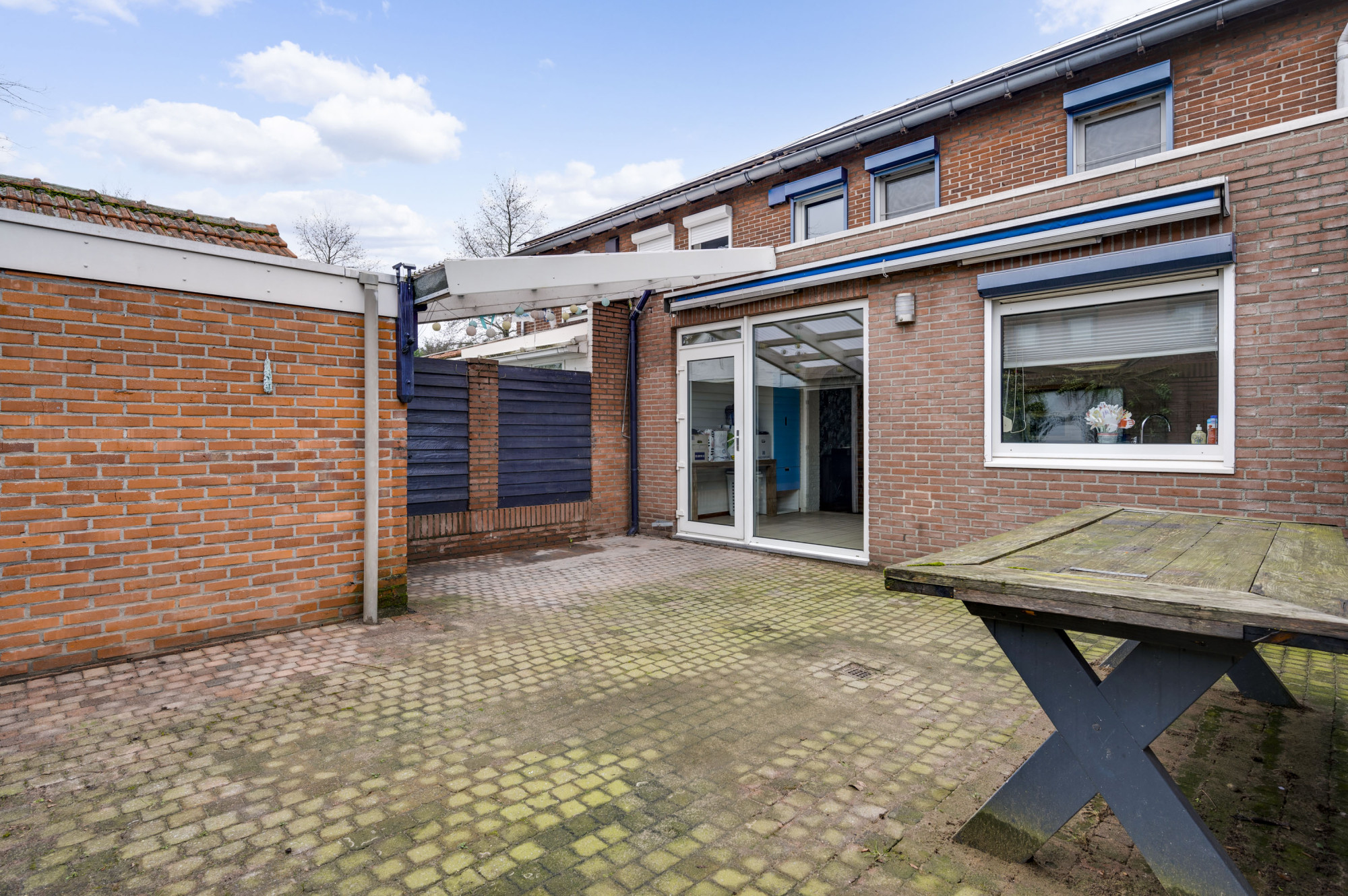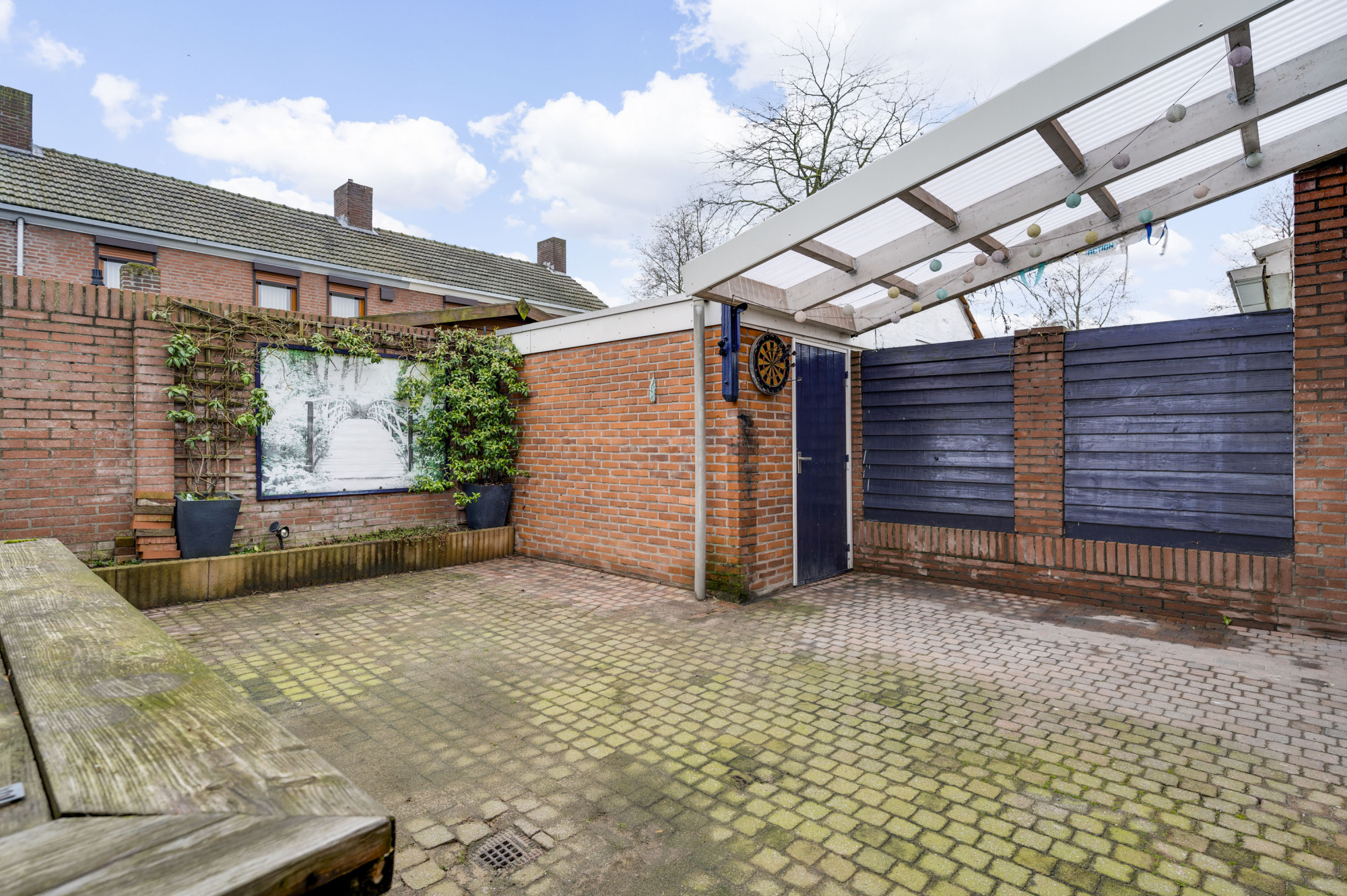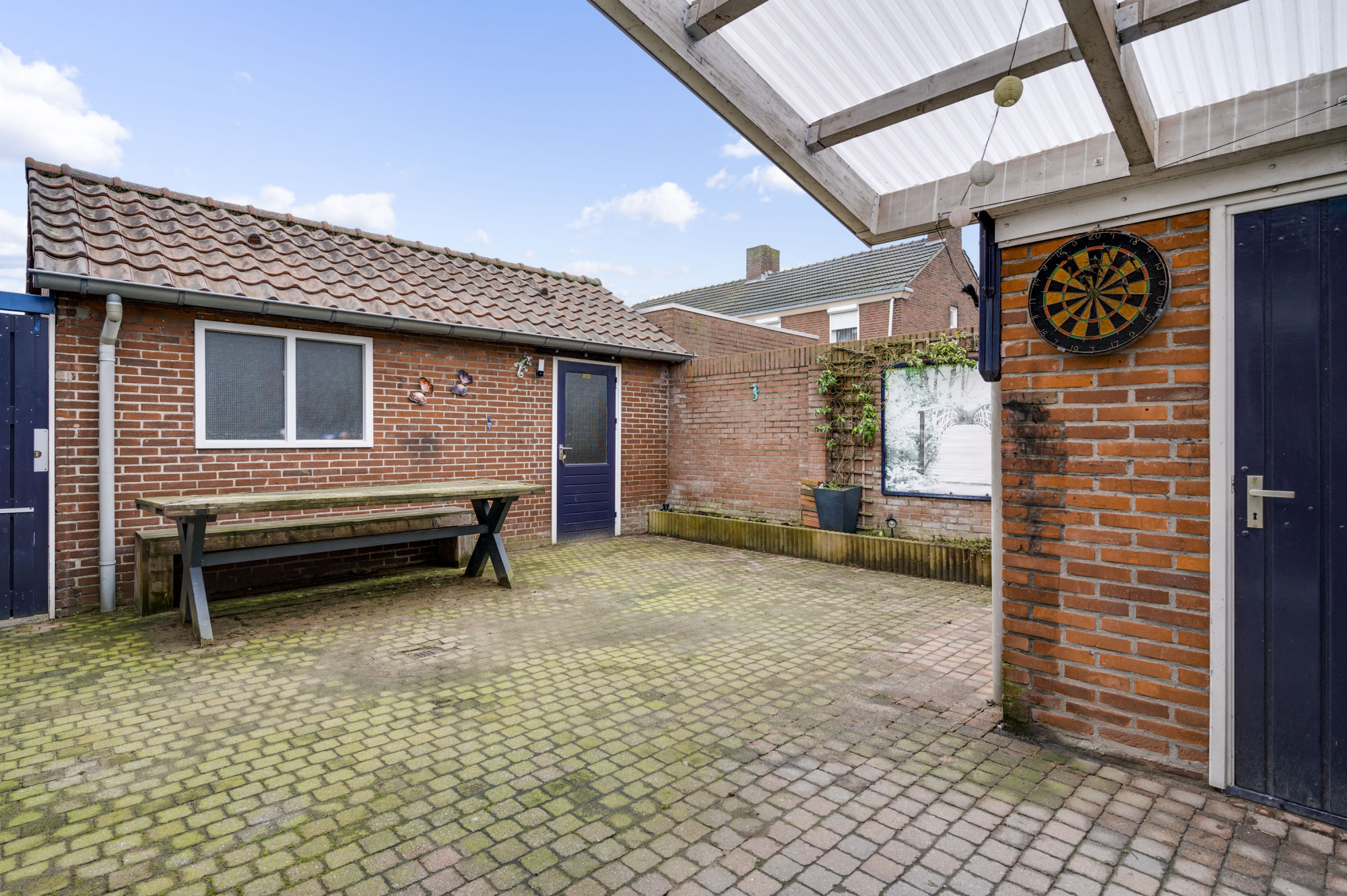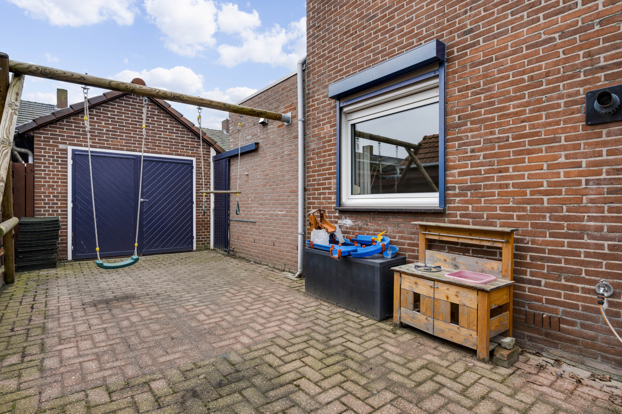 Aan de voorzijde is een voortuin aanwezig en een oprit, waarvan een gedeelte door de handig geplaatste poort in gebruik is als extra zijtuin. Tevens is er een garage toegankelijk en separaat een stenen berging. De garage is voorzien van een houten poort. De berging is via een overkapping vanuit de woning toegankelijk. Aan de achterzijde is de woning voorzien van een sfeervolle, beklinkerde tuin en een zonnescherm.