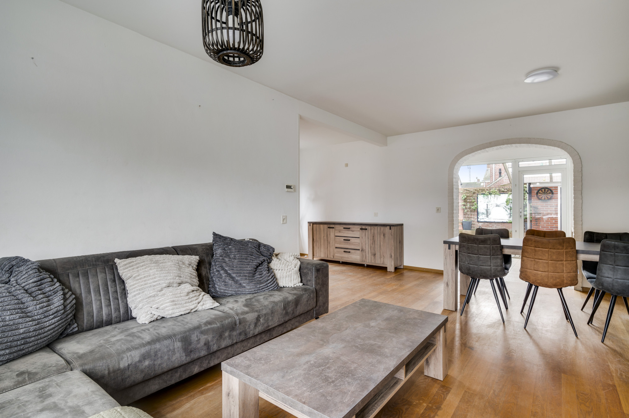 Via de hal/entree met meterkast en toilet voorzien van zwevend closet en fonteintje is de ruime L-vormige woonkamer toegankelijk. Deze is voorzien van een parketvloer en geeft veel daglichttoetreding. In de aanbouw is de keuken gerealiseerd met de navolgende inbouwapparatuur; vaatwasser, combi-magnetron, 4-pits gaskookplaat, rvs-afzuigkap en koelkast). De deels overdekte achtertuin is via een loopdeur vanuit de aanbouw toegankelijk.