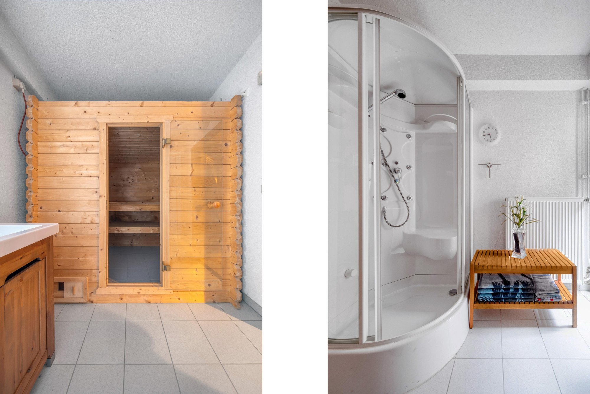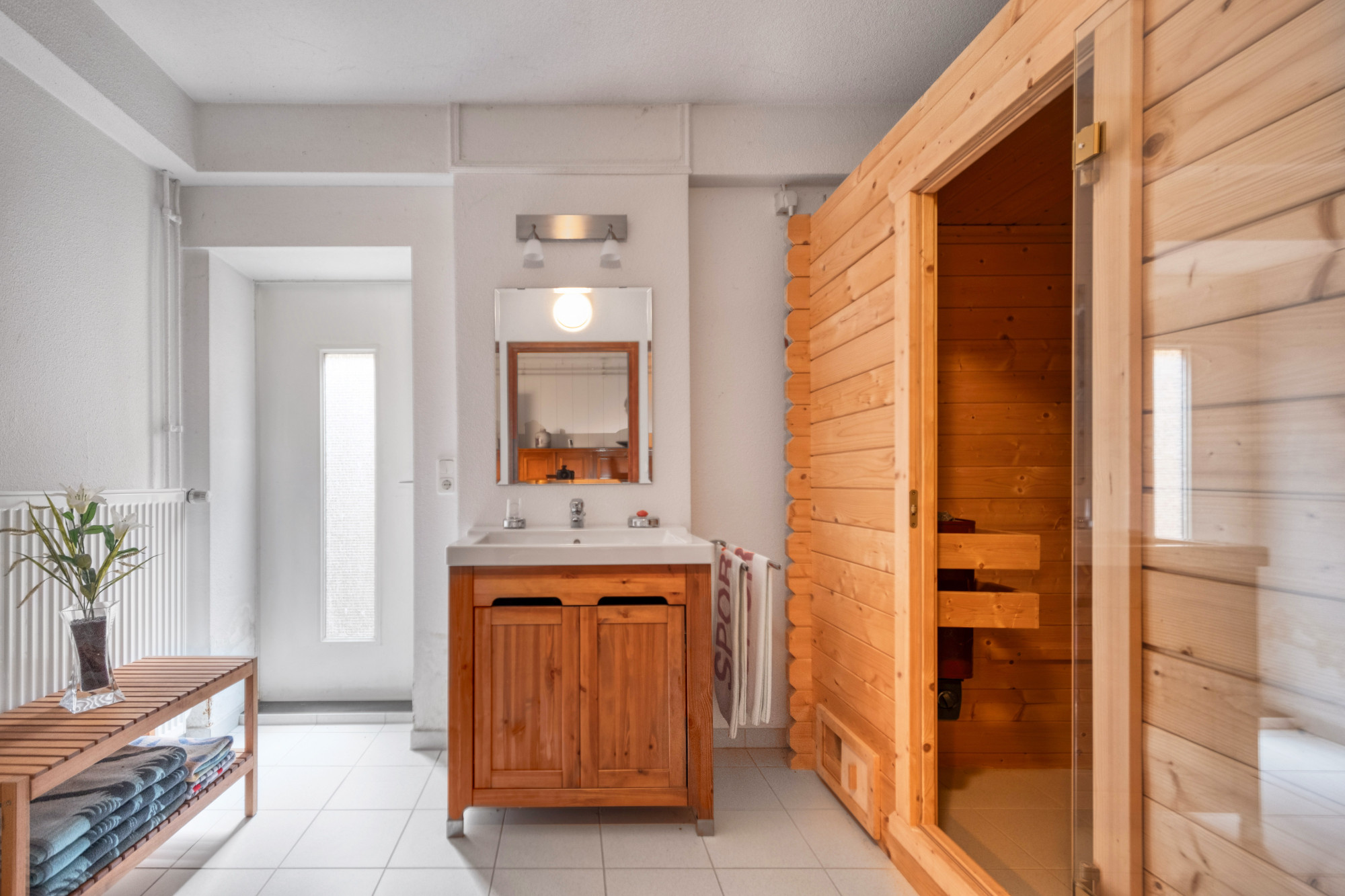 Hobbyruimte (4.17mx2.18m) met sauna, vaste wastafel en douche.