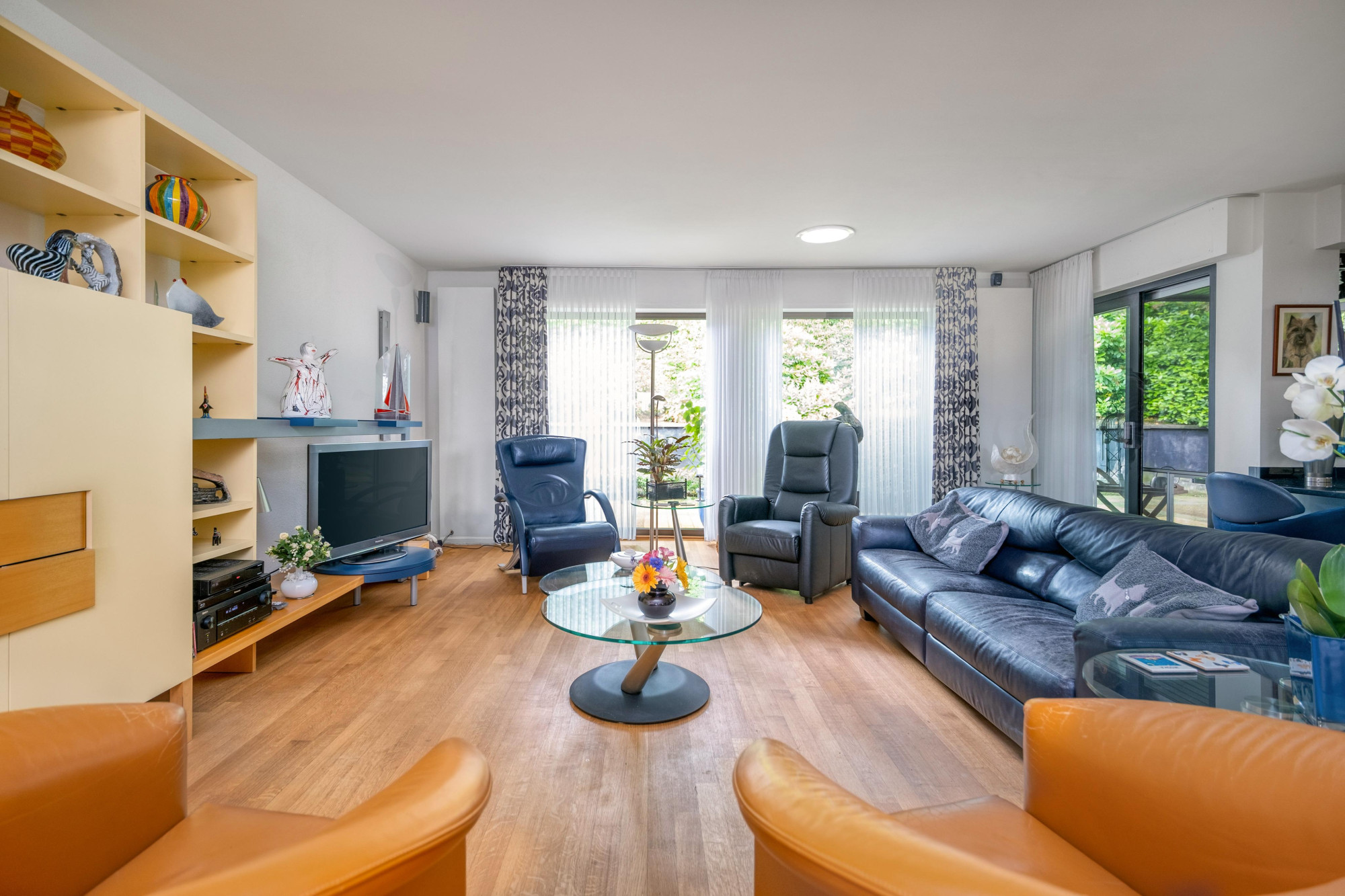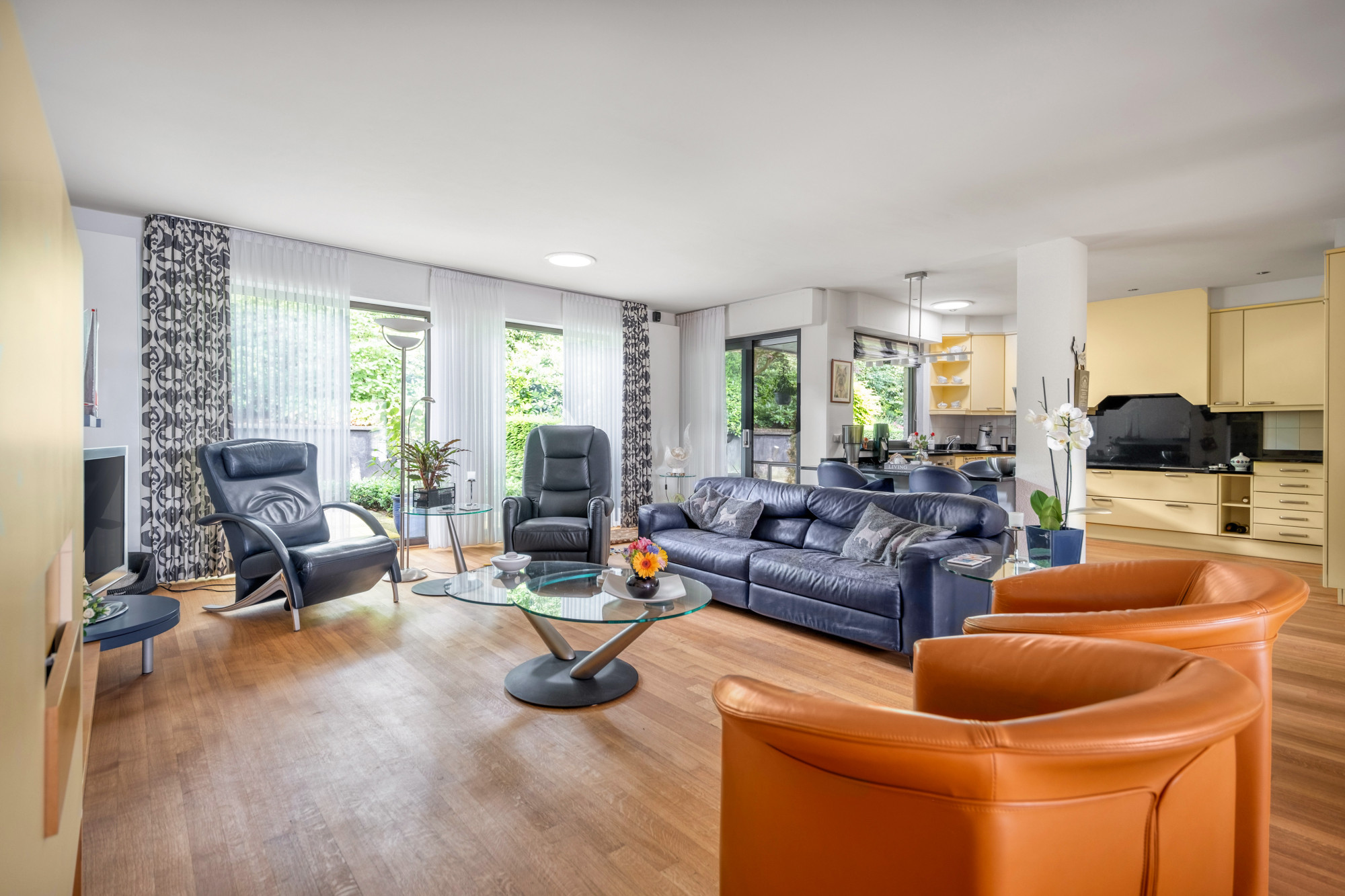 L- woonkamers (10.65mx2.80mx5.78m) met parketvloer en gezellige zithoek, tuindeur naar terras.