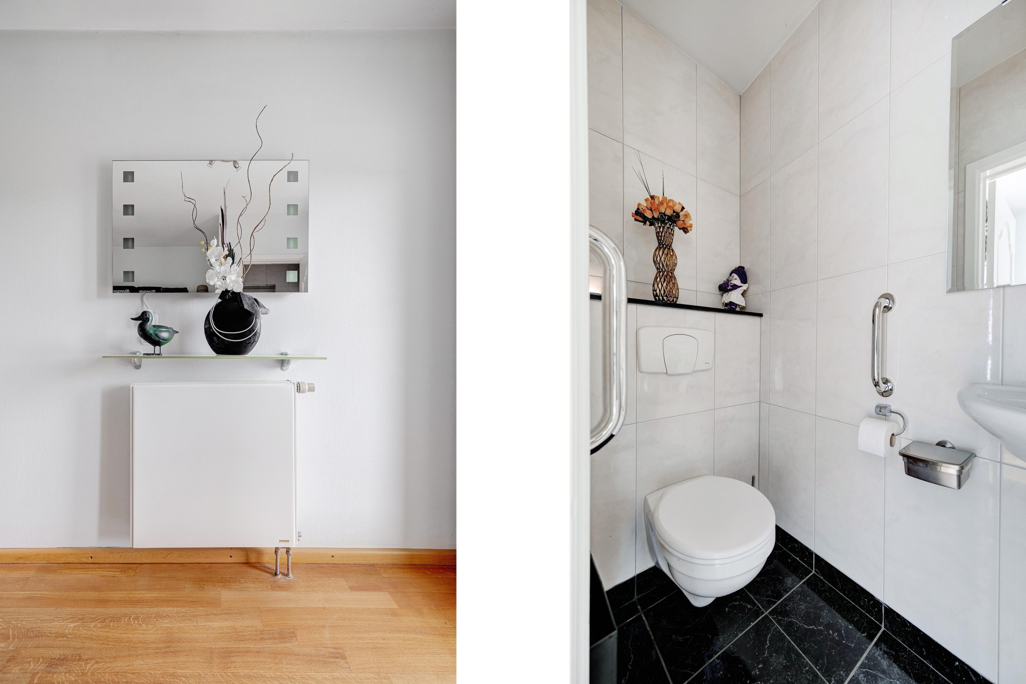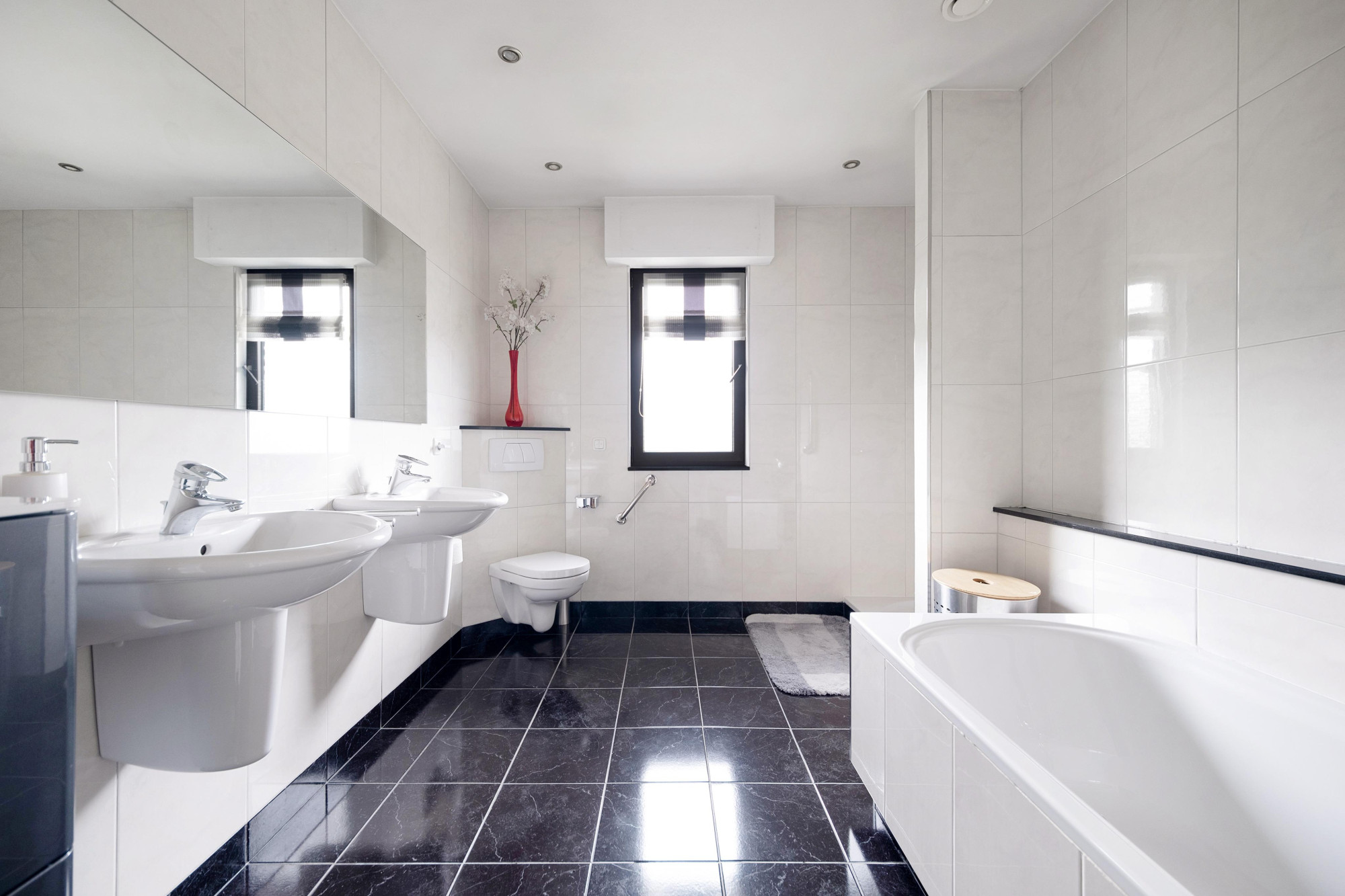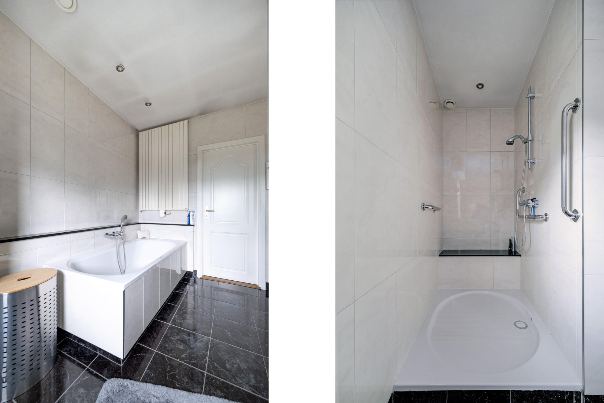 Mooie volledig betegelde badkamer(3.56mx2.53m). dubbel vaste wastafel en zwevend toilet, aparte douche en groot ligbad.