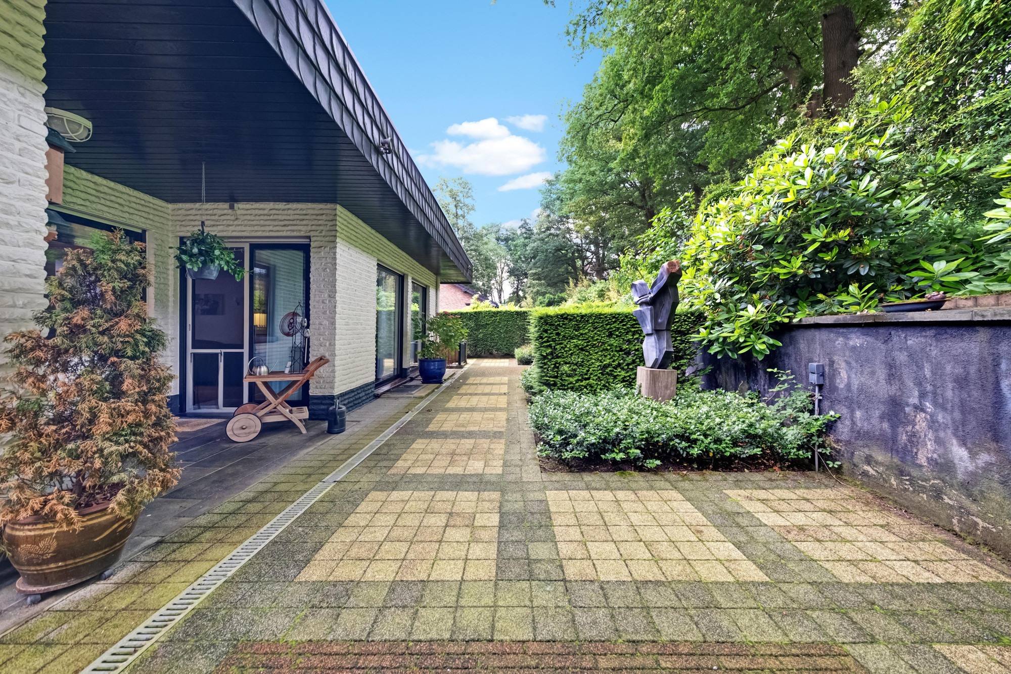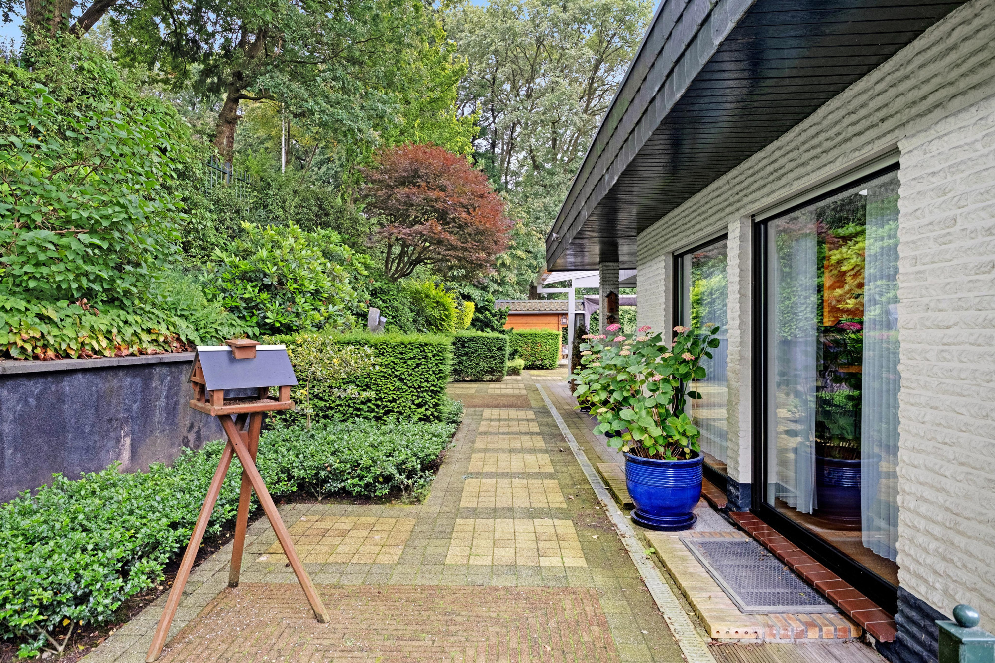Weelderig begroeide achtertuin met bomen, struiken en perken. De tuin biedt veel privacy.