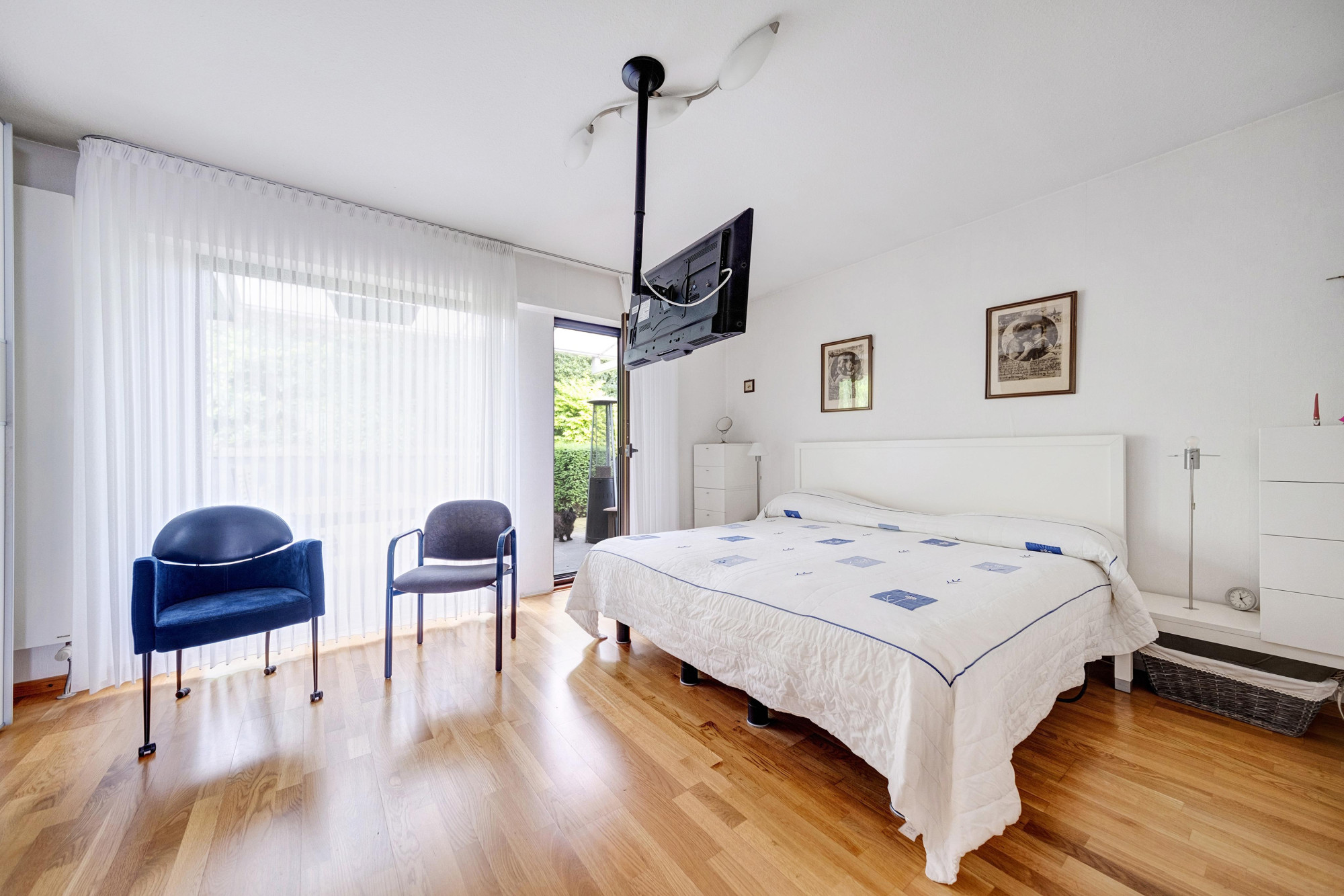 Slaapkamer (4.95mx3.66 m) met parketvloer tuindeur naar buiten.