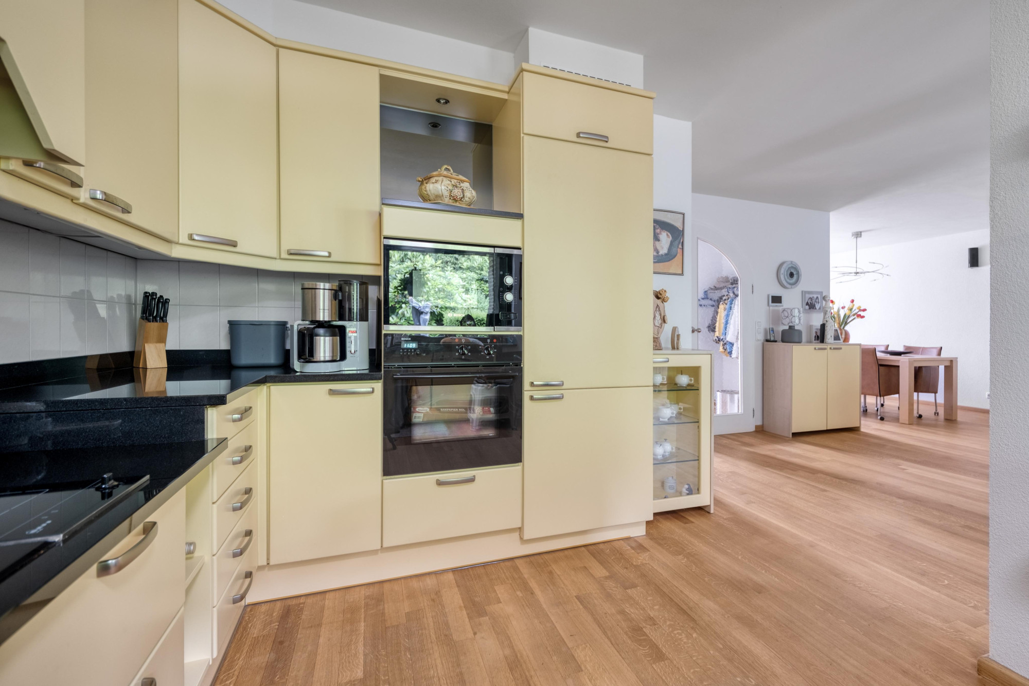 Open woonkeuken (3.86mx2.53m) met aanbouwkeuken met een zitbar, magnetron, oven, vaatwasser, koelkast met diepvriesvak,(1jr oud) inductiekookplaat en afzuigkap.