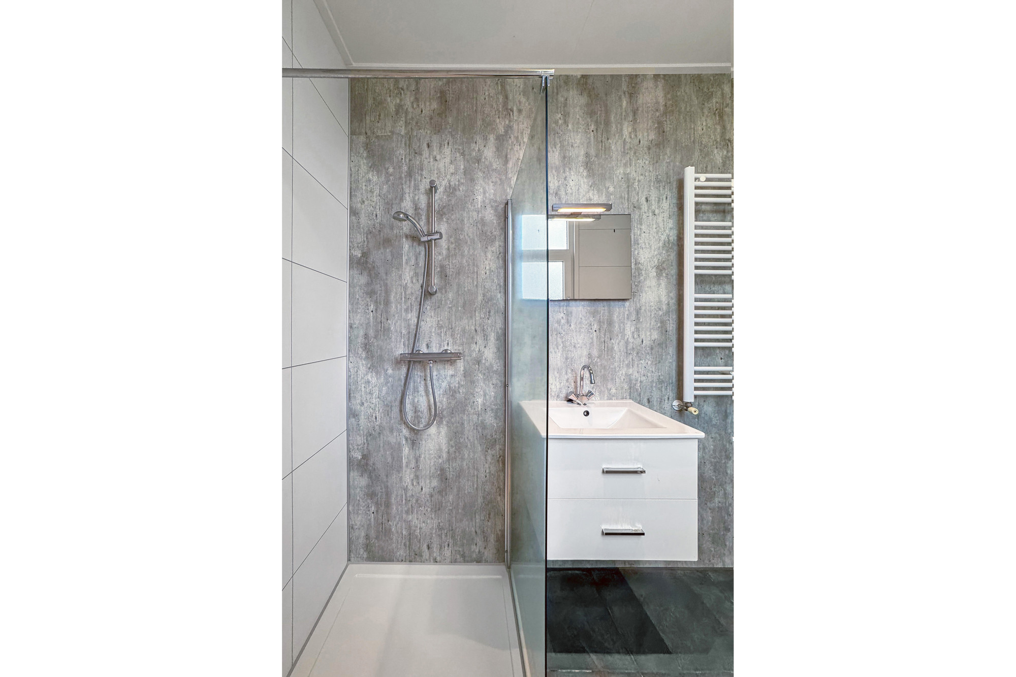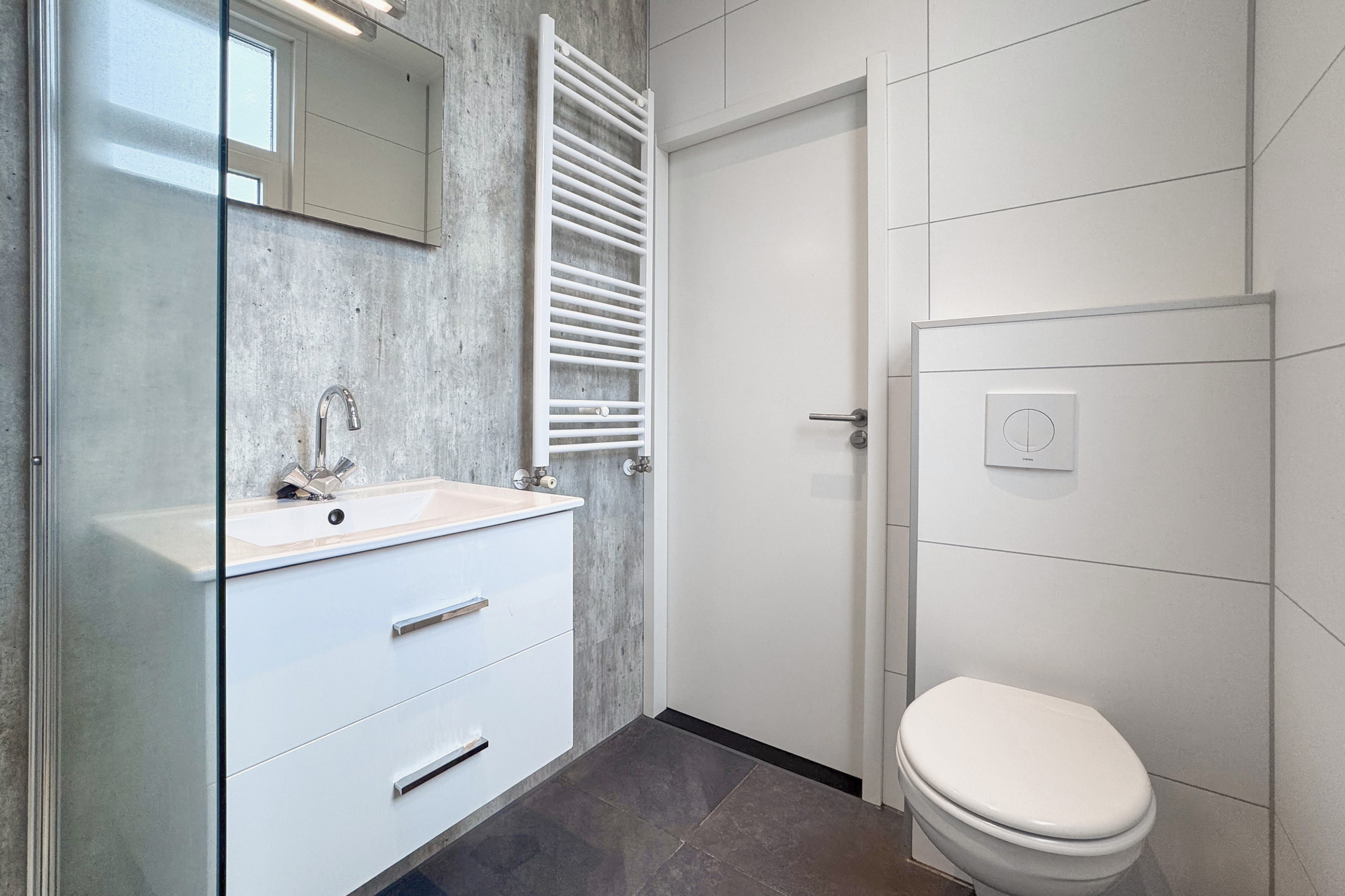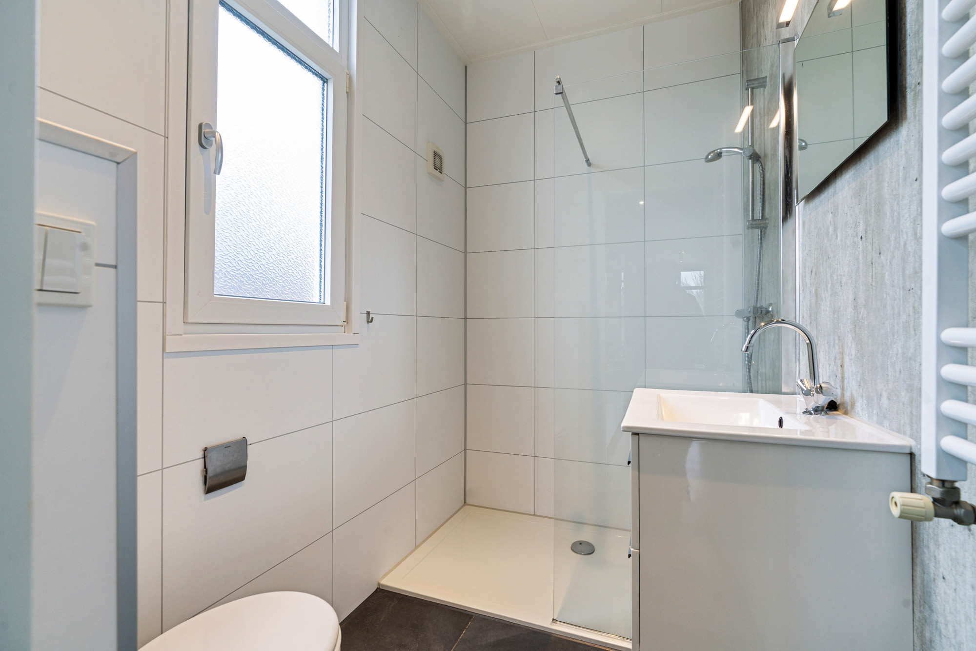 De moderne badkamer is voorzien van een douche, wastafel en toilet wat bijdraagt aan het comfort van de woning.