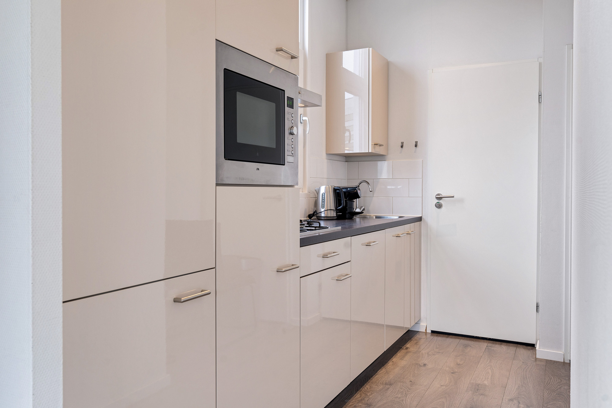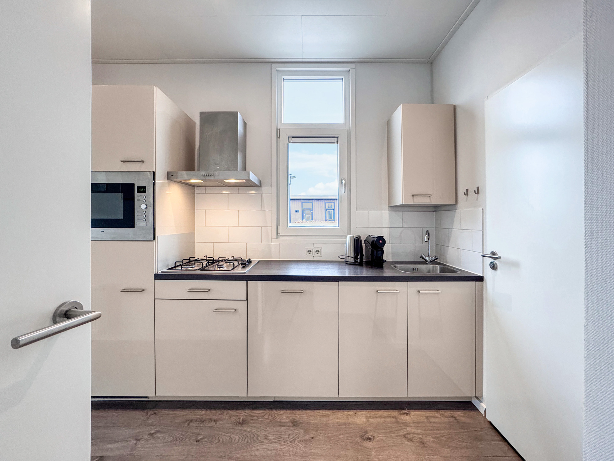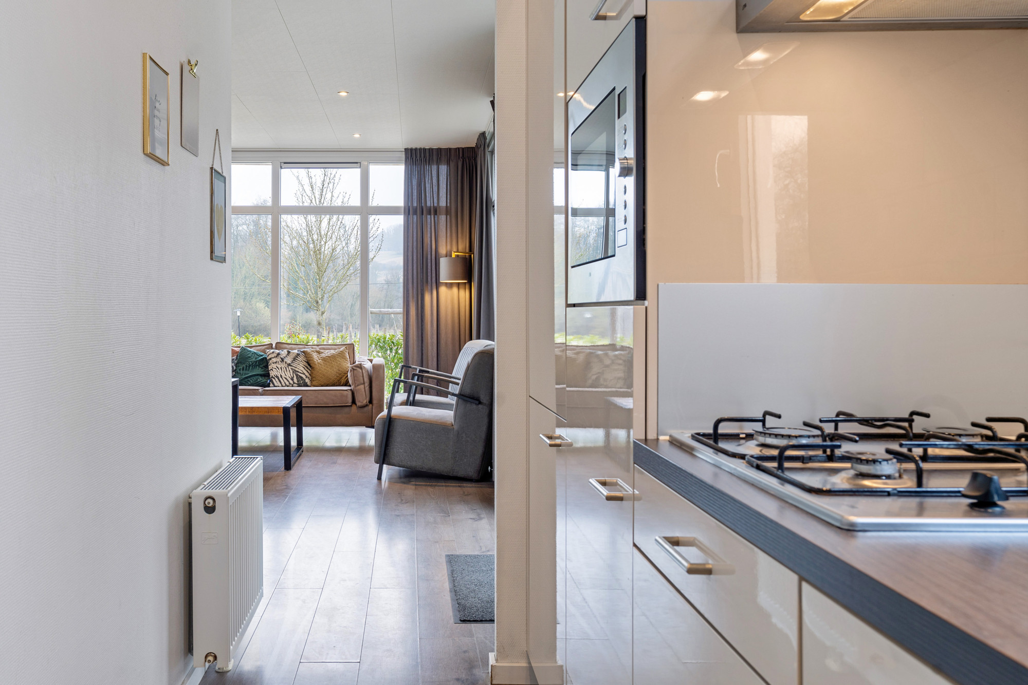 Bij binnenkomst betreed je de moderne woonkamer van ca. 3,87 m breed en 5,41 m diep. De open keuken is voorzien van een gaskookplaat, oven, afzuigkap, koelkast en een vaatwasser.