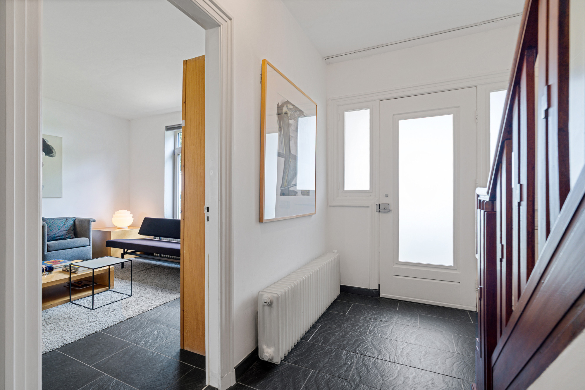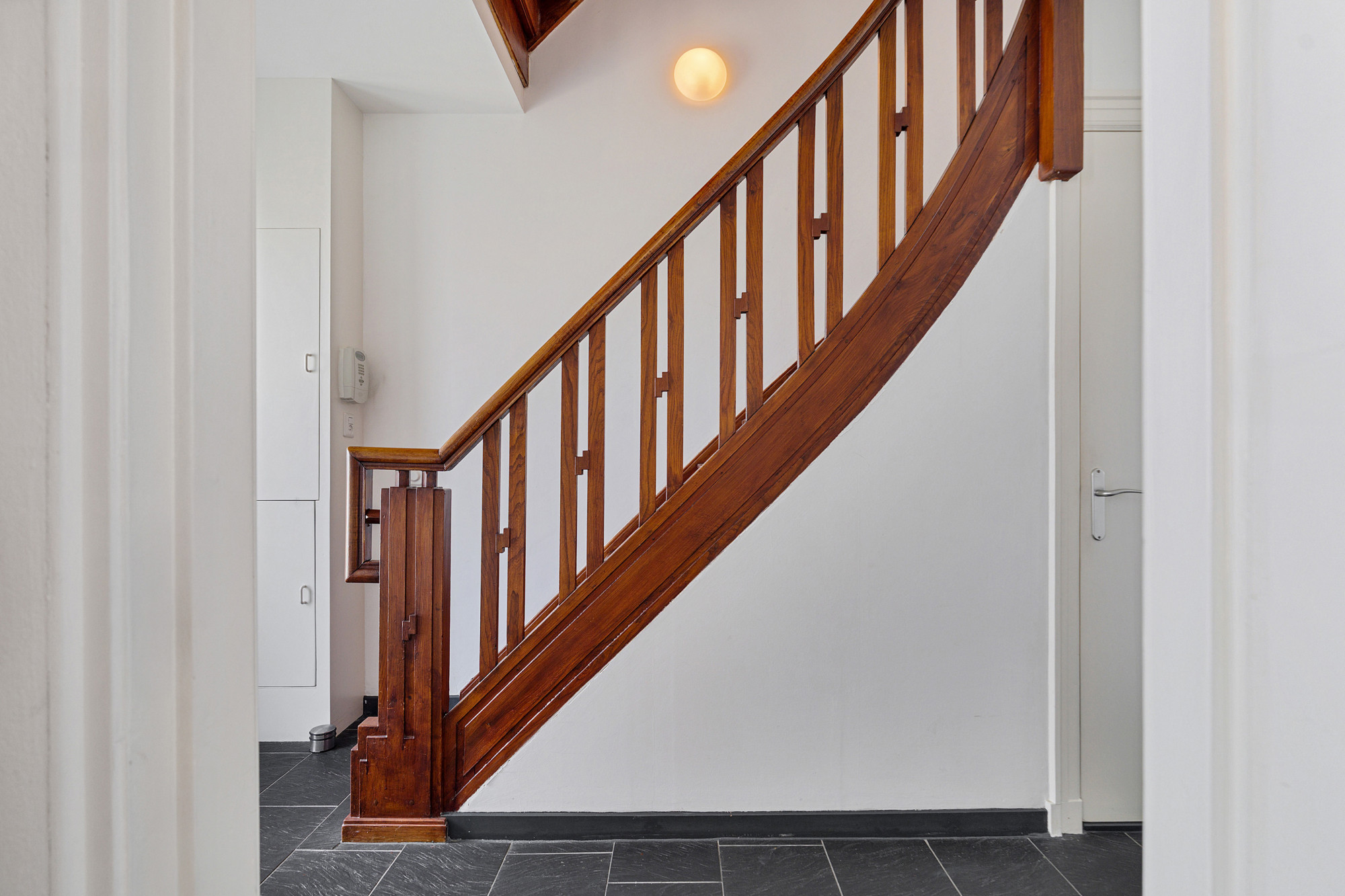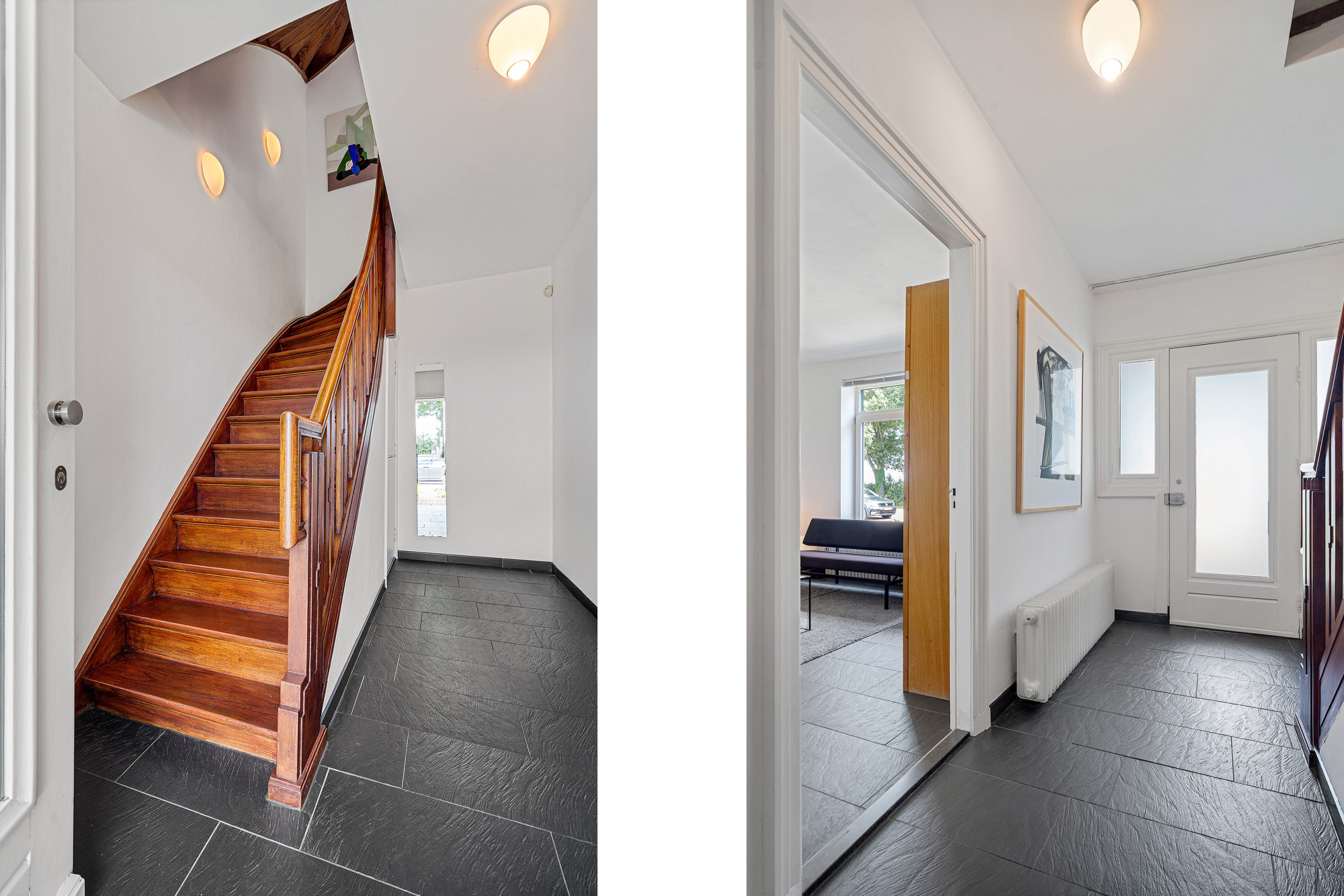 Bij binnenkomst via de voordeur betreed je de hal, waar je links de meterkast en brievenbusdeur aantreft. Vanuit hier heb je toegang tot de vaste trap naar de eerste verdieping, de woonkamer en het souterrain.