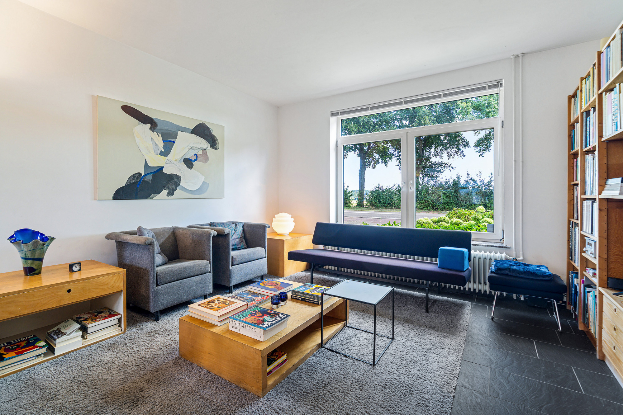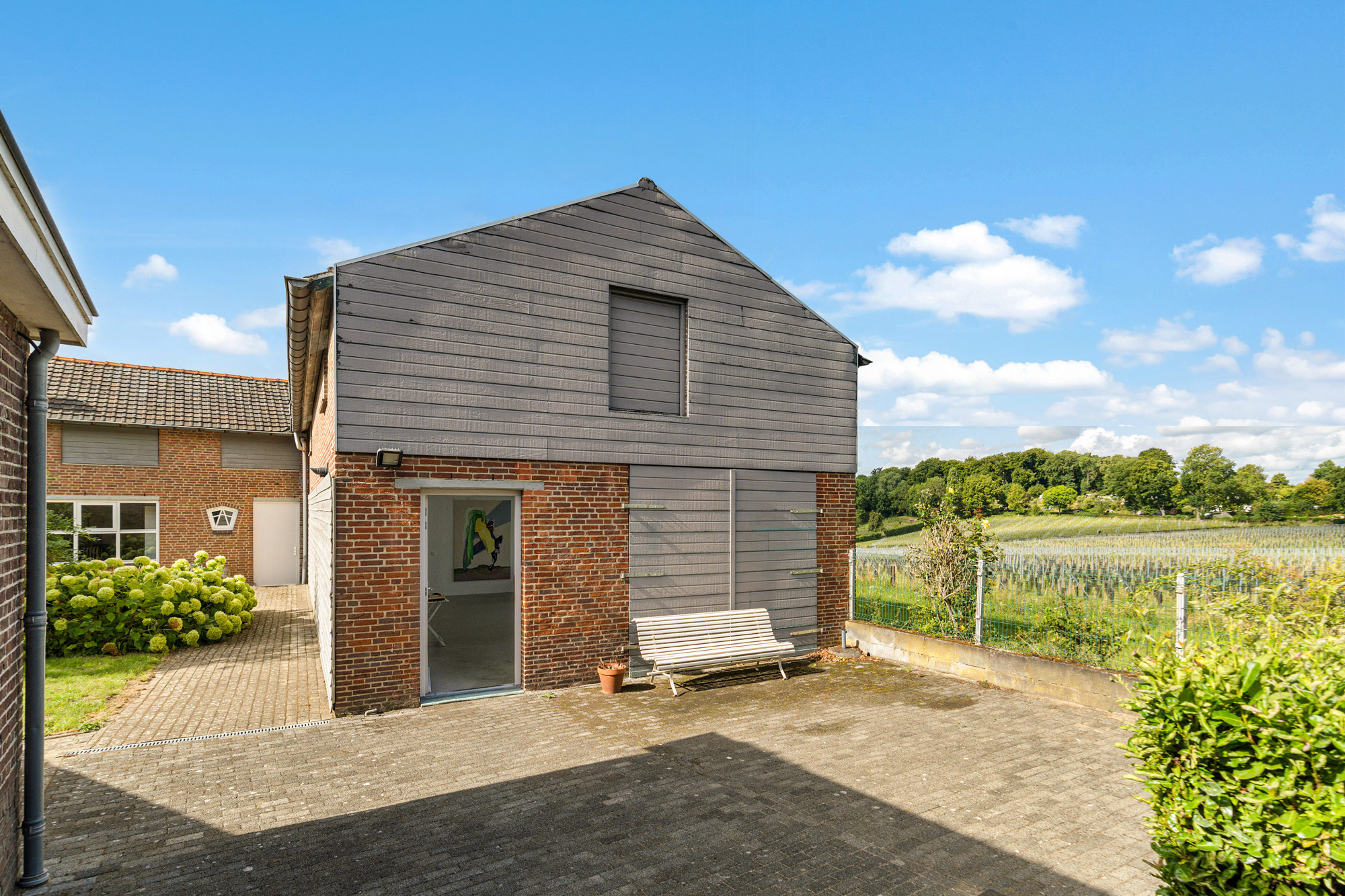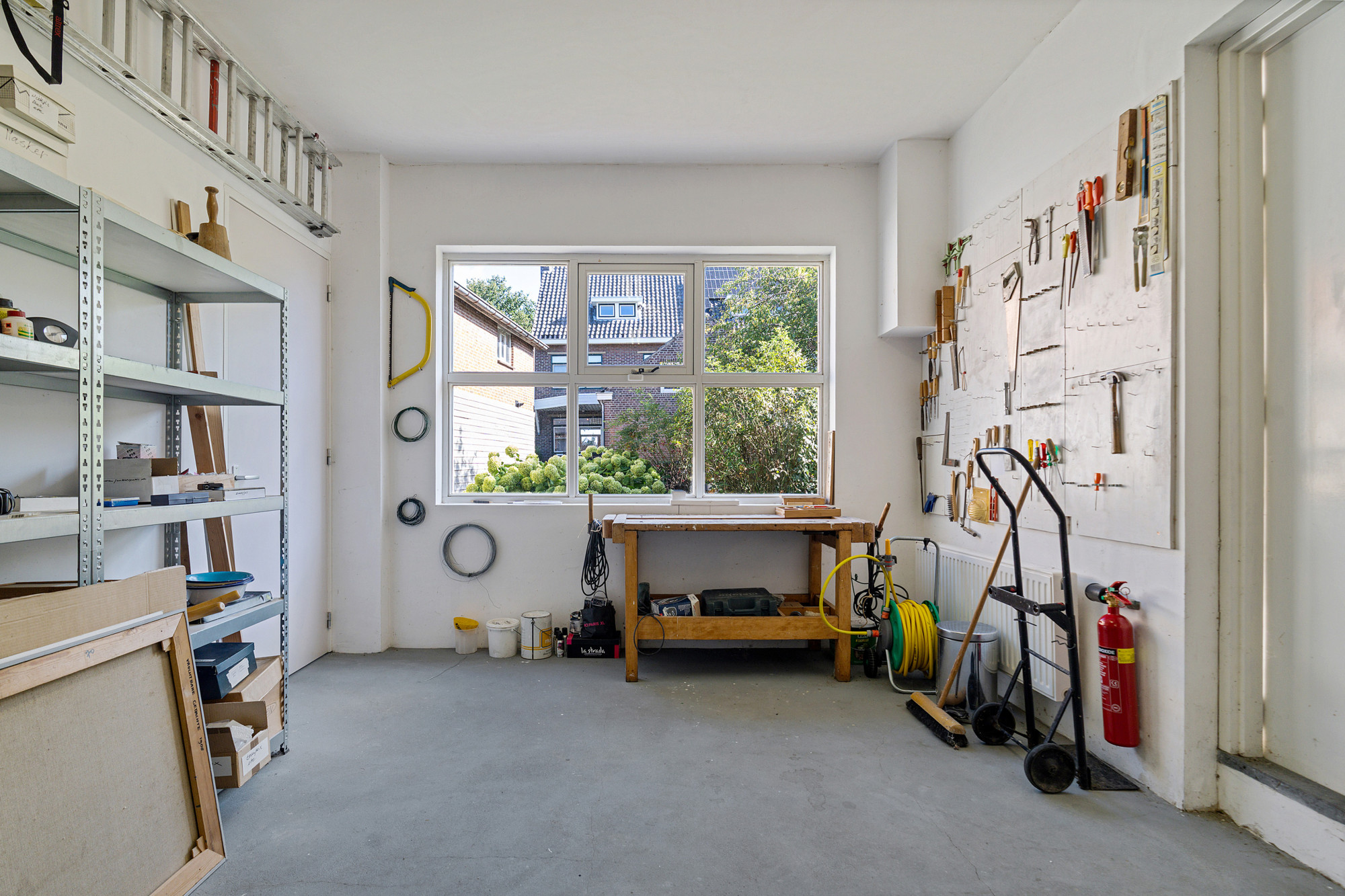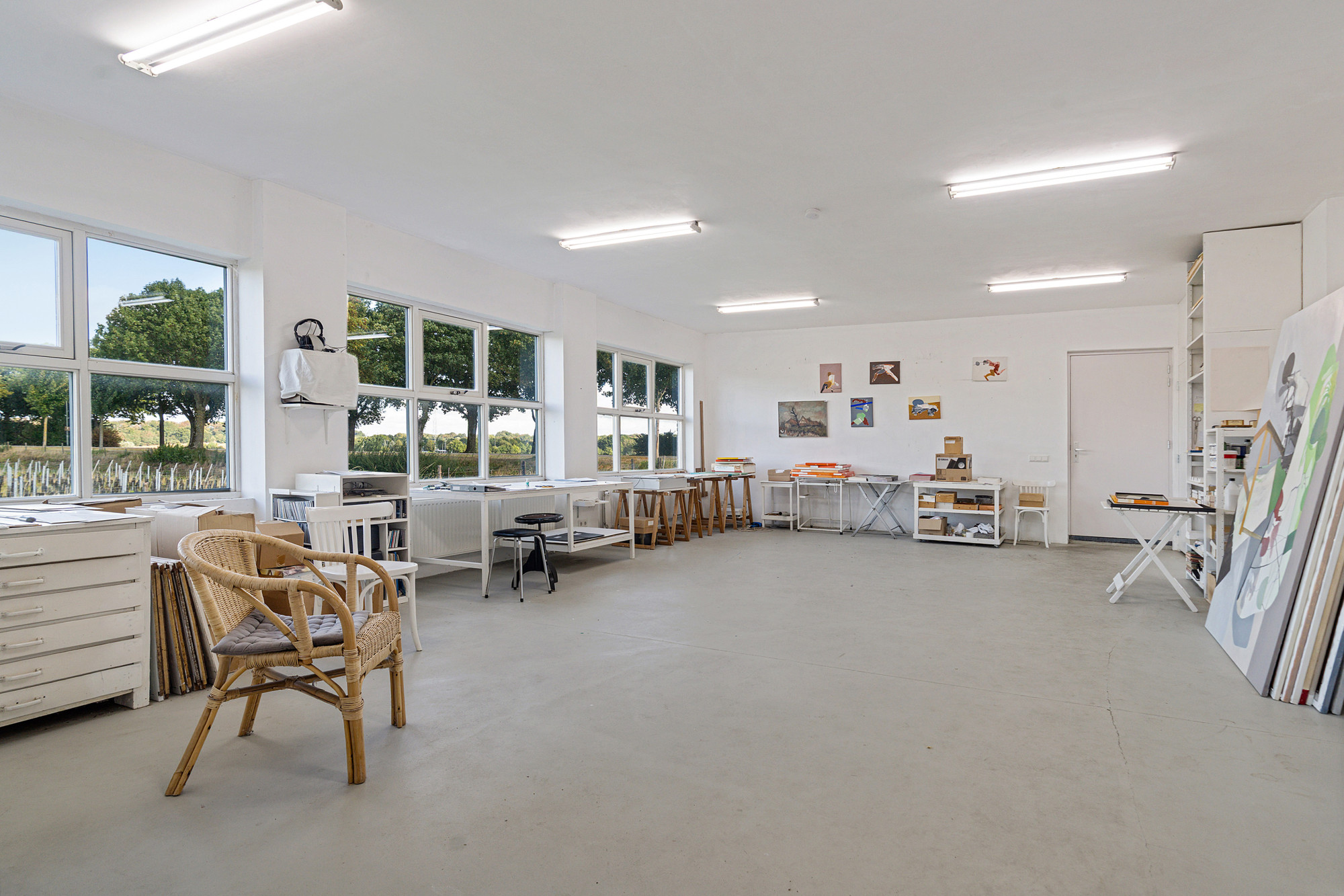 Een absoluut pluspunt is het grote, vrijstaande atelier in de tuin. Dit atelier, bereikbaar via drie ingangen, is verdeeld in vier lichte ruimtes.