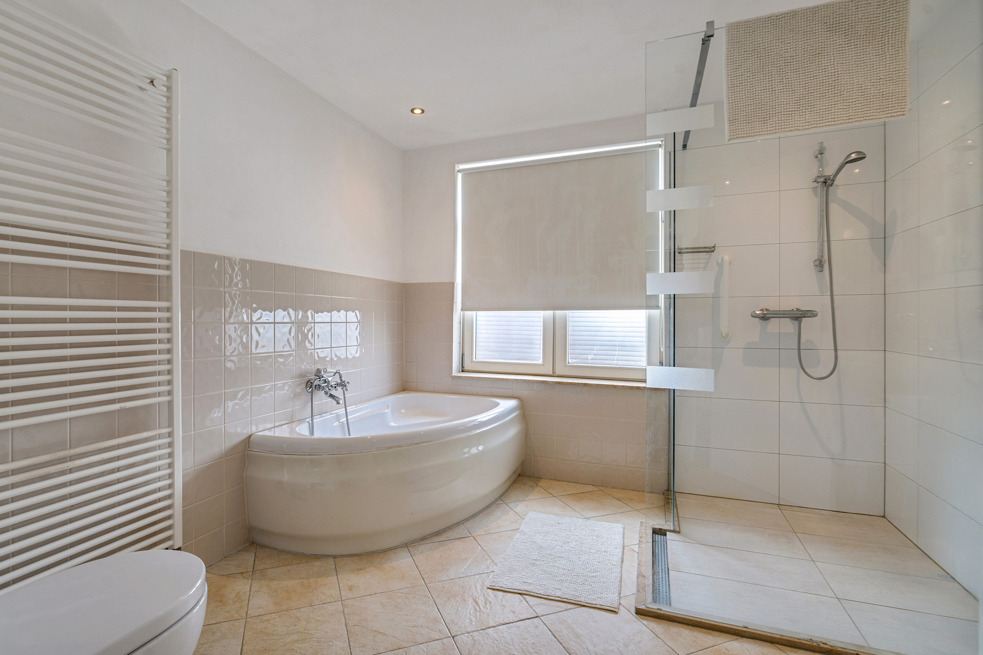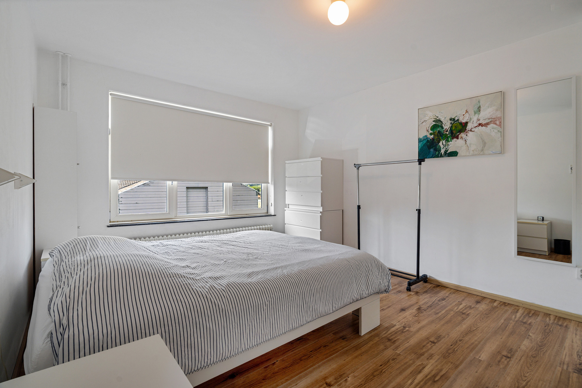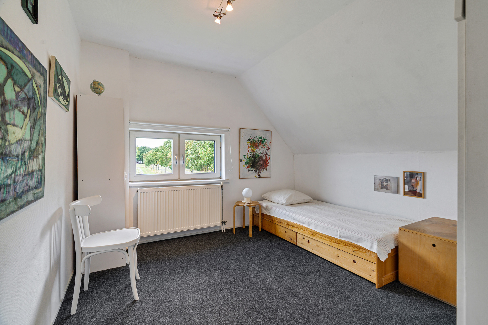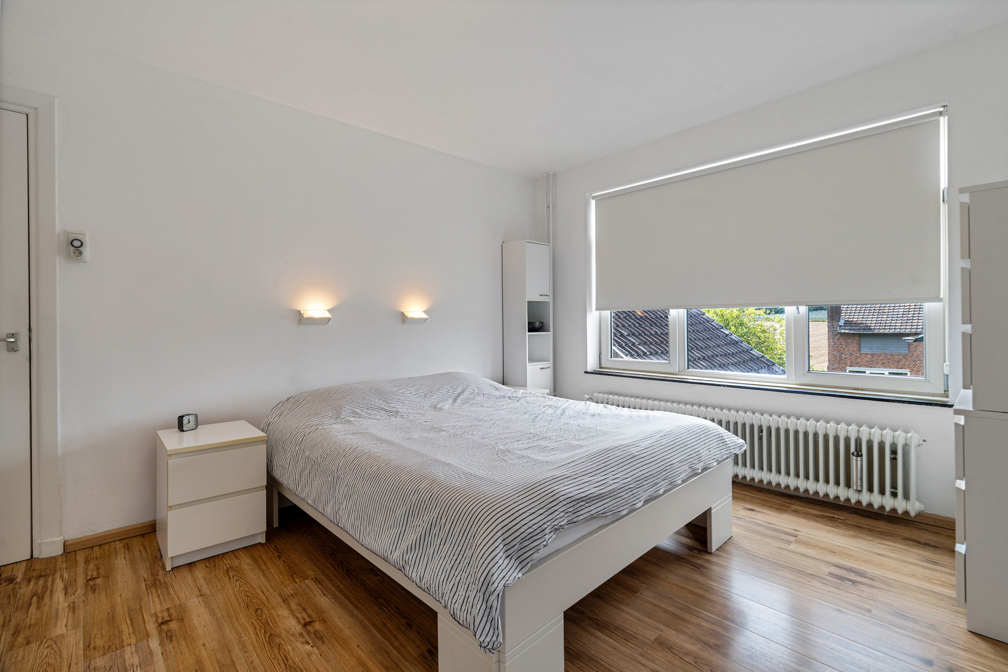 Vanaf de hal brengt de vaste trap je naar de eerste verdieping. Op de overloop vind je twee slaapkamers, waarvan één momenteel als hobby- of leeskamer wordt gebruikt. De badkamer is half betegeld en voorzien van een toilet, designradiator, hoekbad, inloopdouche en wastafel.