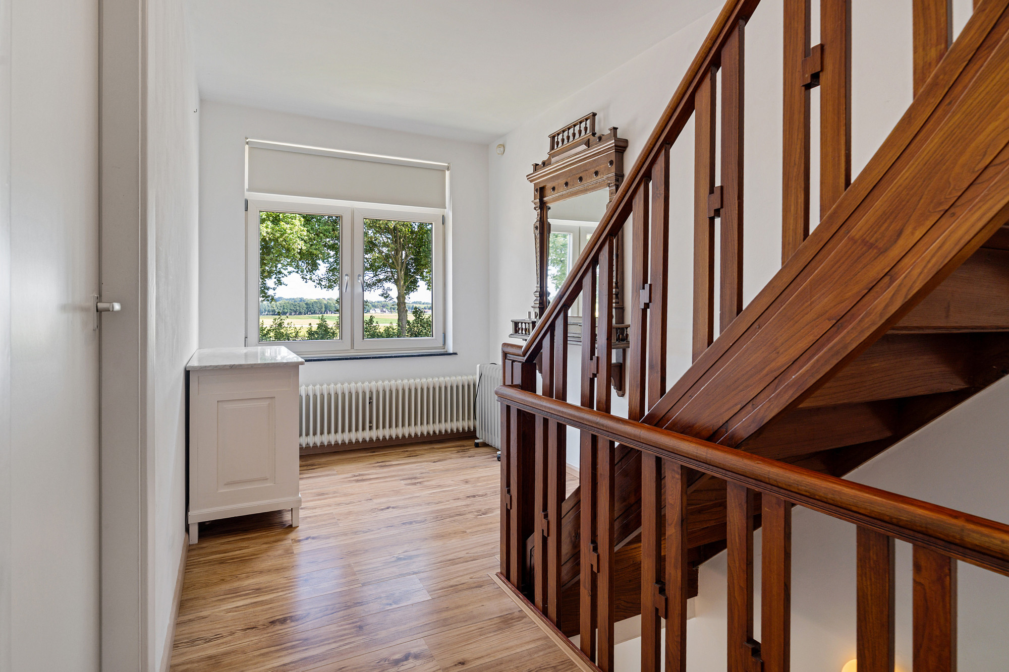 Een vaste trap leidt naar de tweede verdieping. Hier tref je een ruime overloop en vier slaapkamers, waarvan er momenteel twee als opslagruimte worden benut.