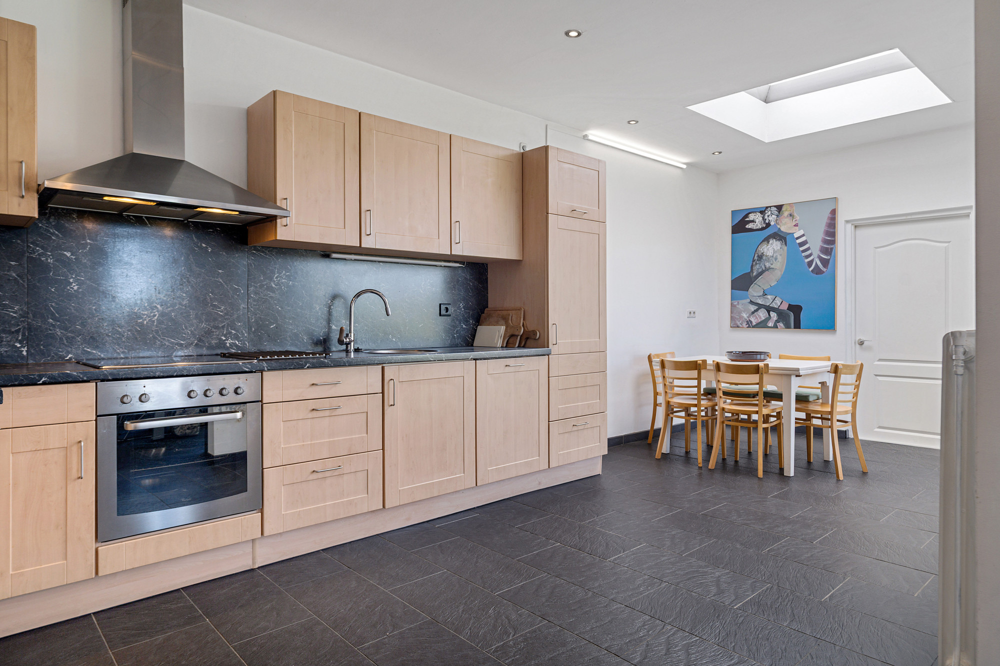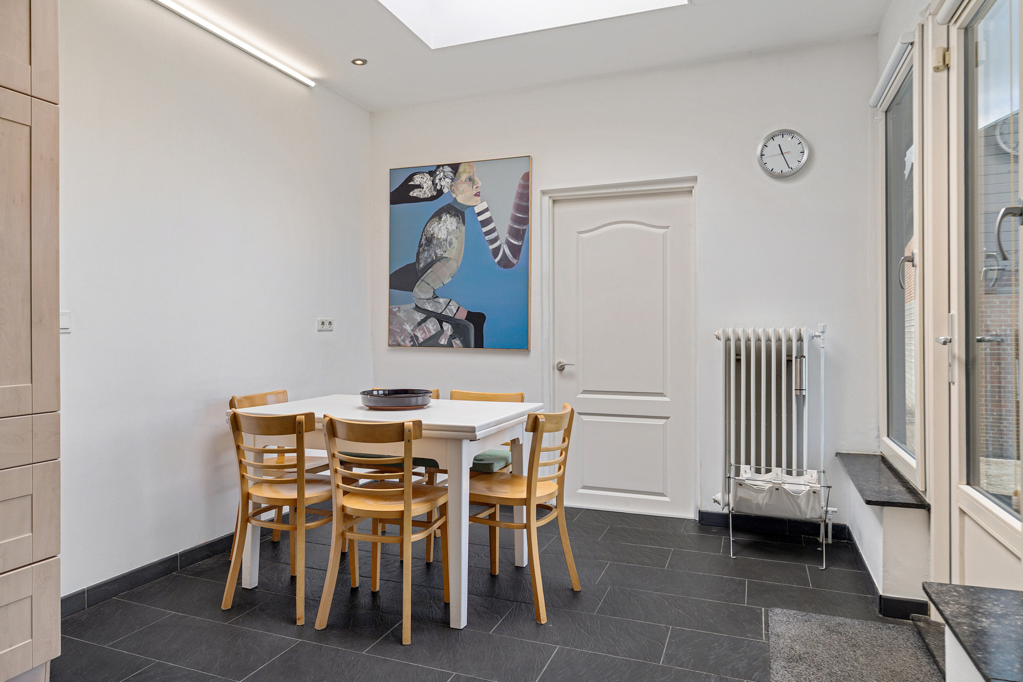 De royale woonkamer biedt een sfeervol zit- en eetgedeelte en staat in open verbinding met de keuken. Deze keuken is uitgerust met een oven, 4-pits keramische kookplaat, afzuigkap, marmeren werkblad, vaatwasser en koelkast. Daarnaast is er ruimte voor een knus eetgedeelte. De lichtkoepel zorgt voor veel lichtinval.