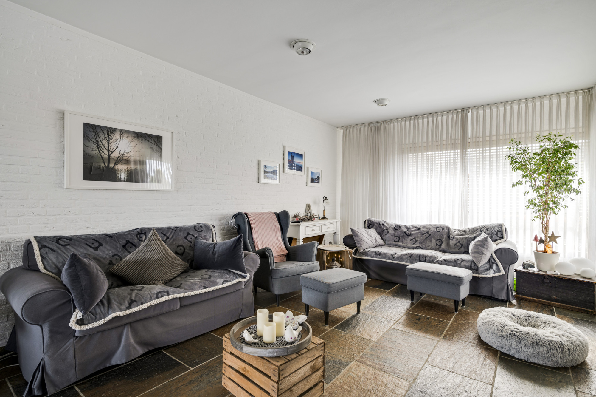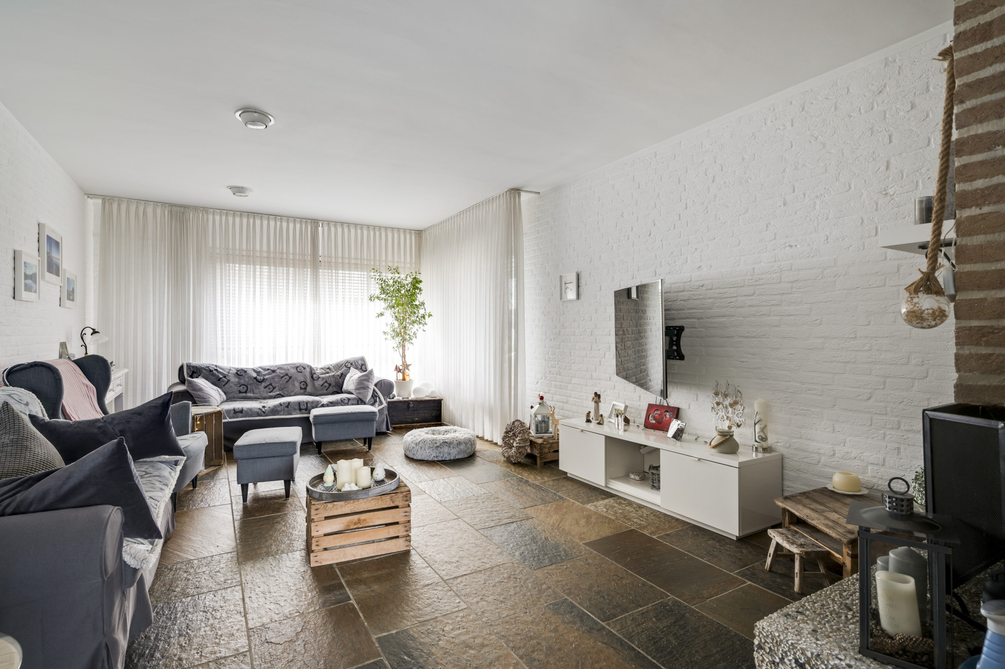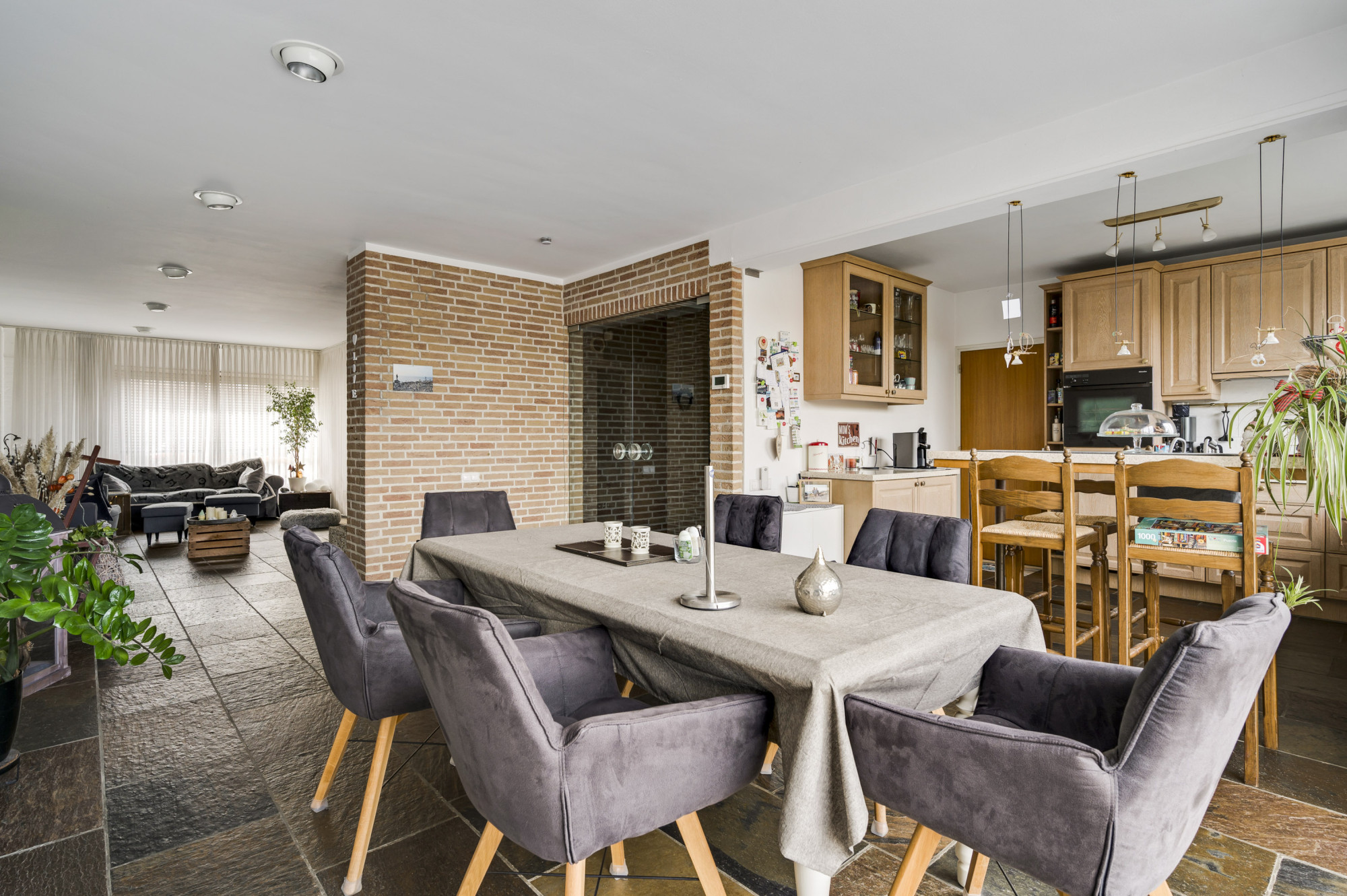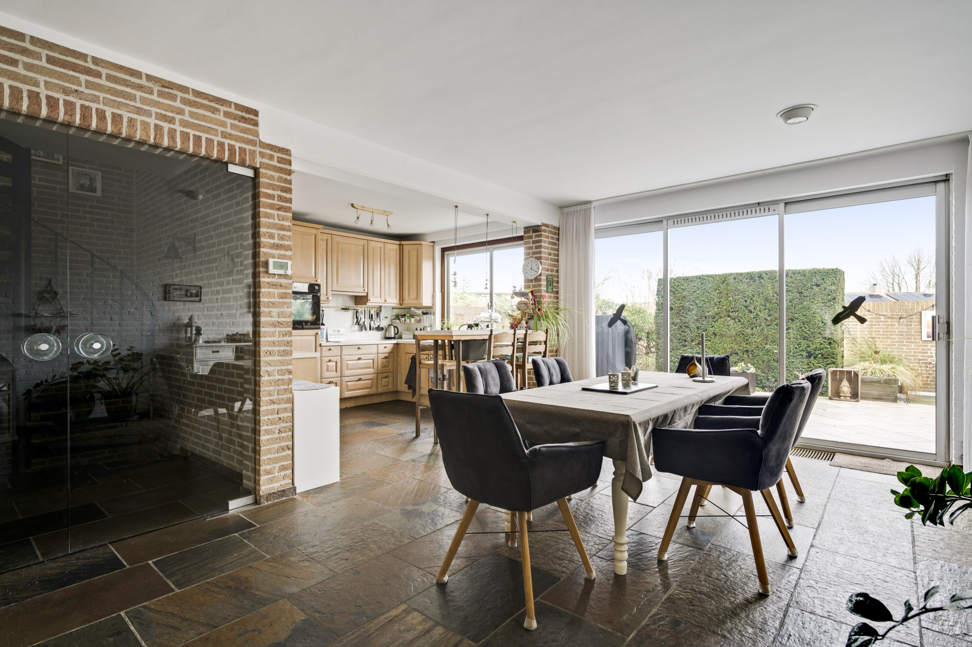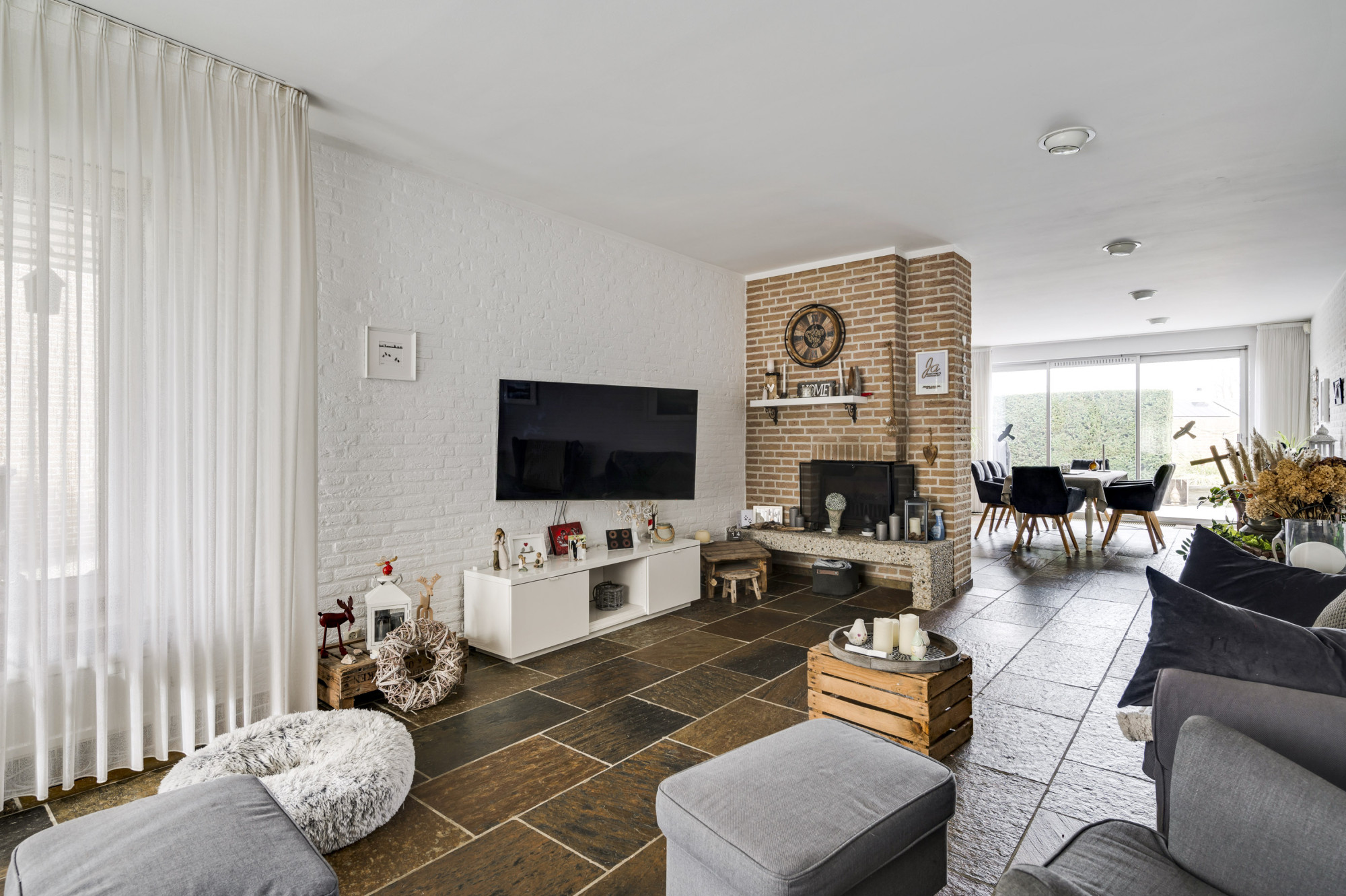 De sfeervolle woonkamer is ruim opgezet en voorzien van een karakteristieke schouw met open haard. De lichte eetkamer sluit hier perfect op aan en geeft via een schuifpui direct toegang tot de tuin – heerlijk voor zomerse avonden.