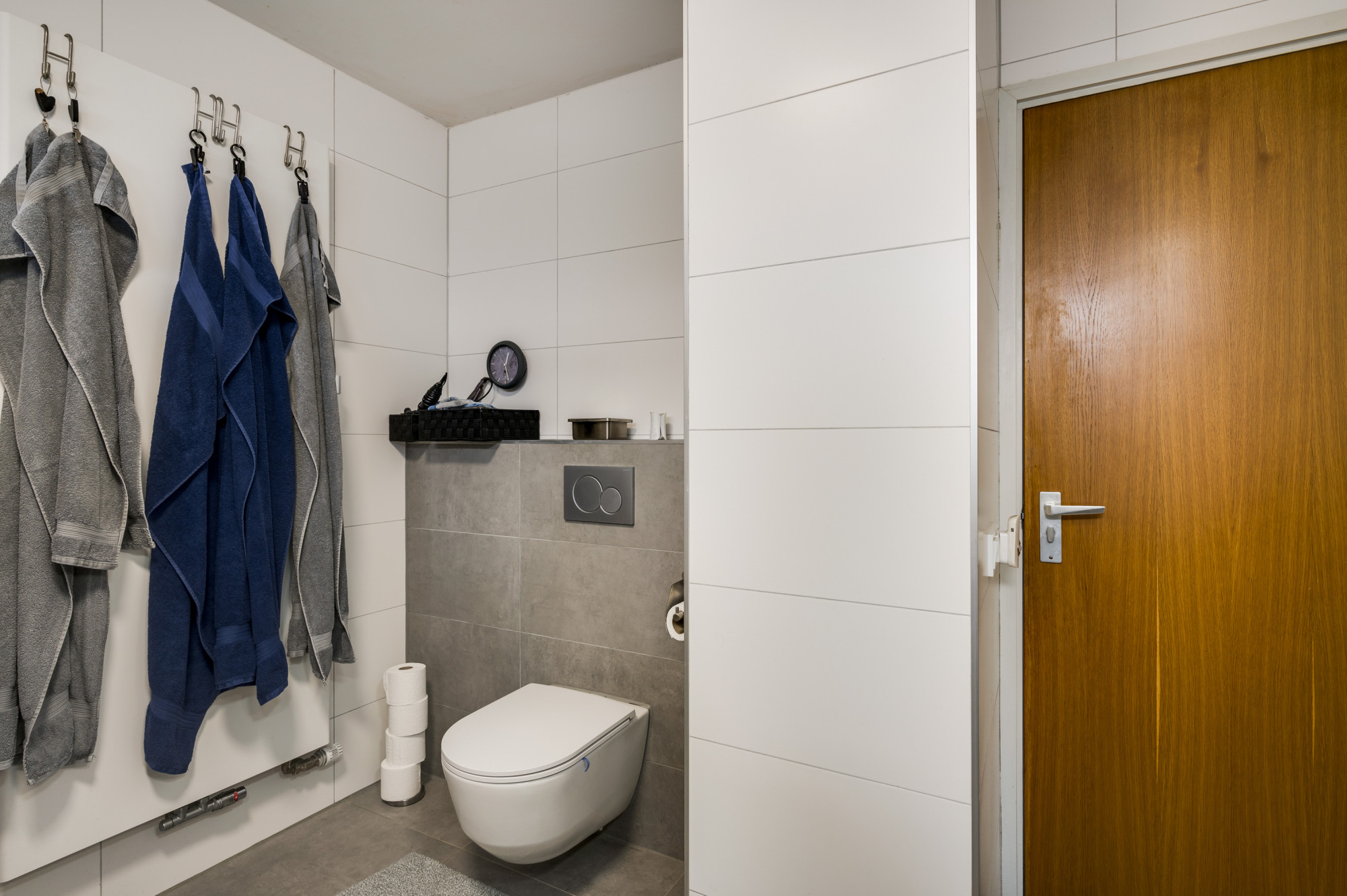 Centraal op de verdieping aanwezige eigentijdse, geheel betegelde en strakke badkamer voorzien van een inloopdouche, badkamermeubel met dubbele wastafel en tweede toilet.