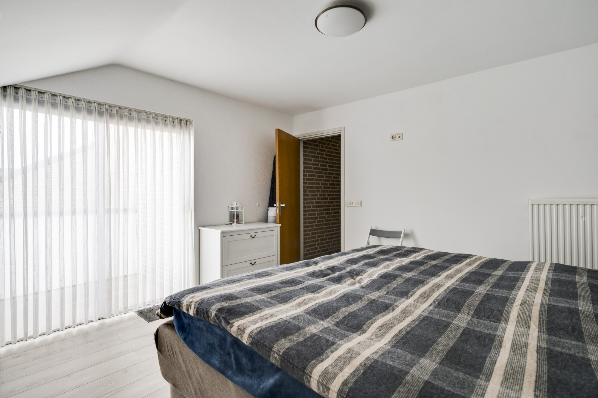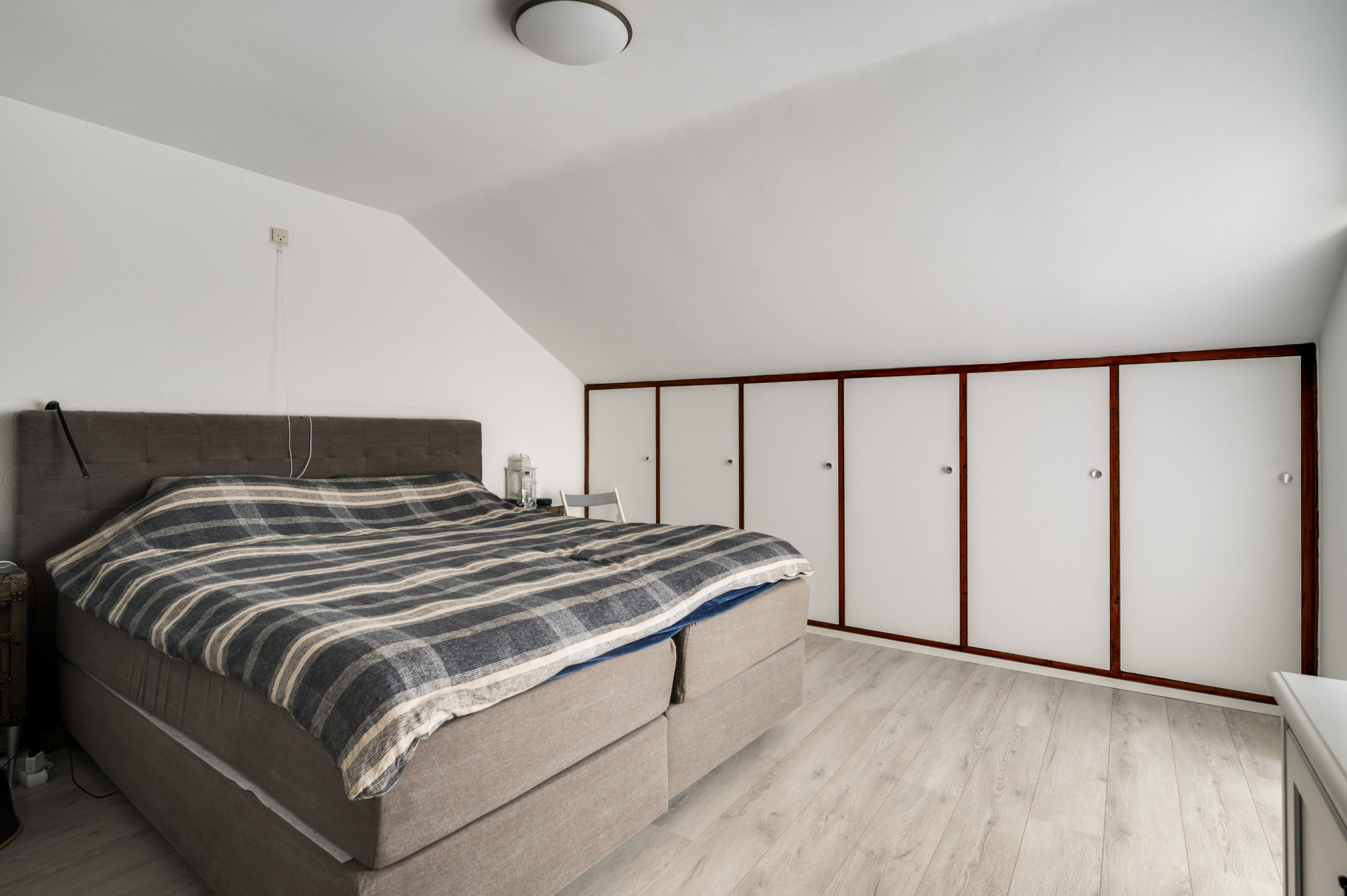 Rechtsvoor gesitueerde ruime hoofdslaapkamer met veel opbergmogelijkheden in de vaste kastenwanden in de schuinte van de dakconstructie en toegang tot het balkon aan de voorzijde.
