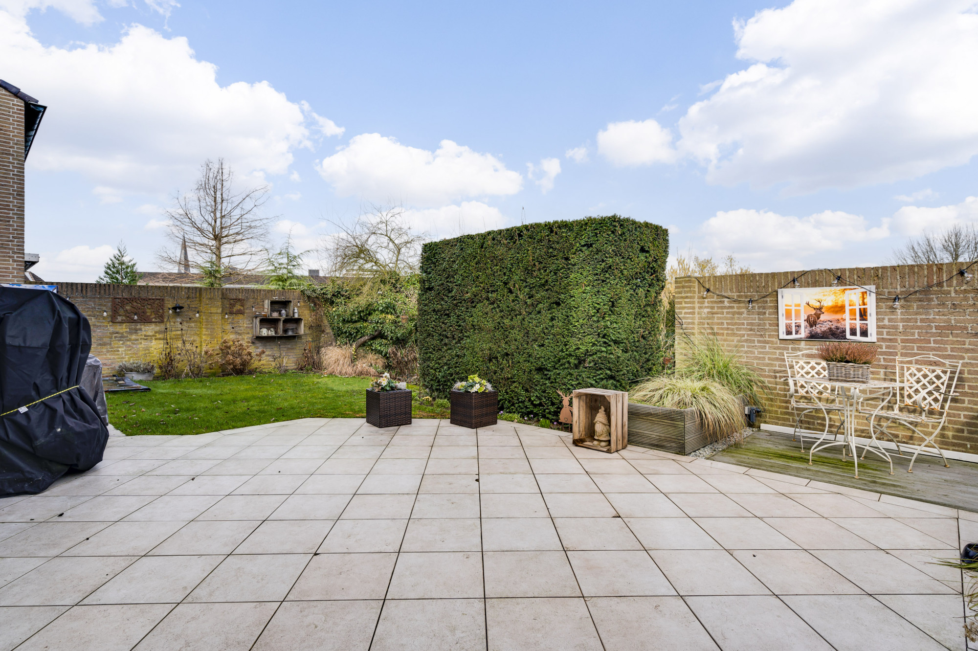 * VERZORGDE ACHTERTUIN MET TERRAS VOORZIEN VAN ZONNESCHERM, GAZON, BORDERS MET AANPLANTING