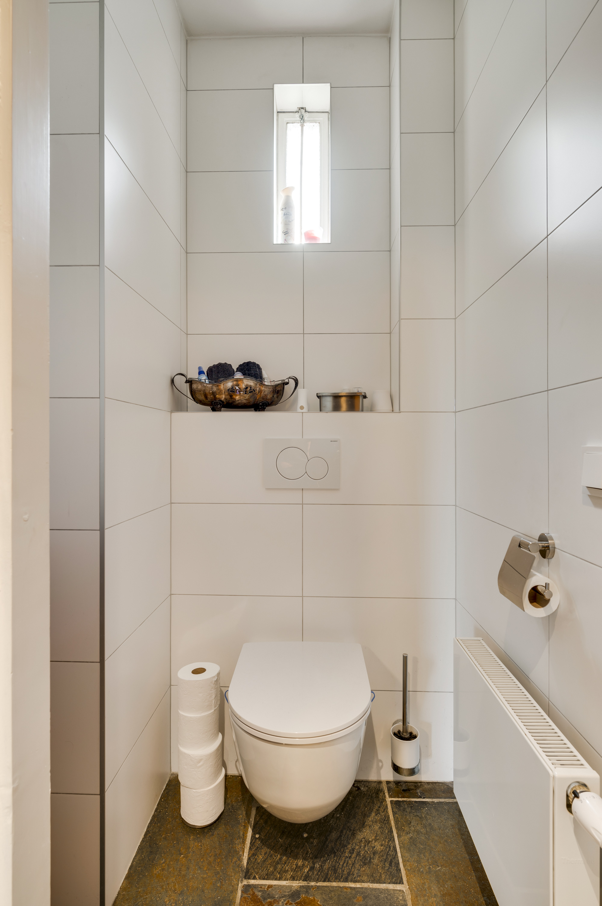 Geheel betegeld gastentoilet met zwevend wandcloset en fonteintje.