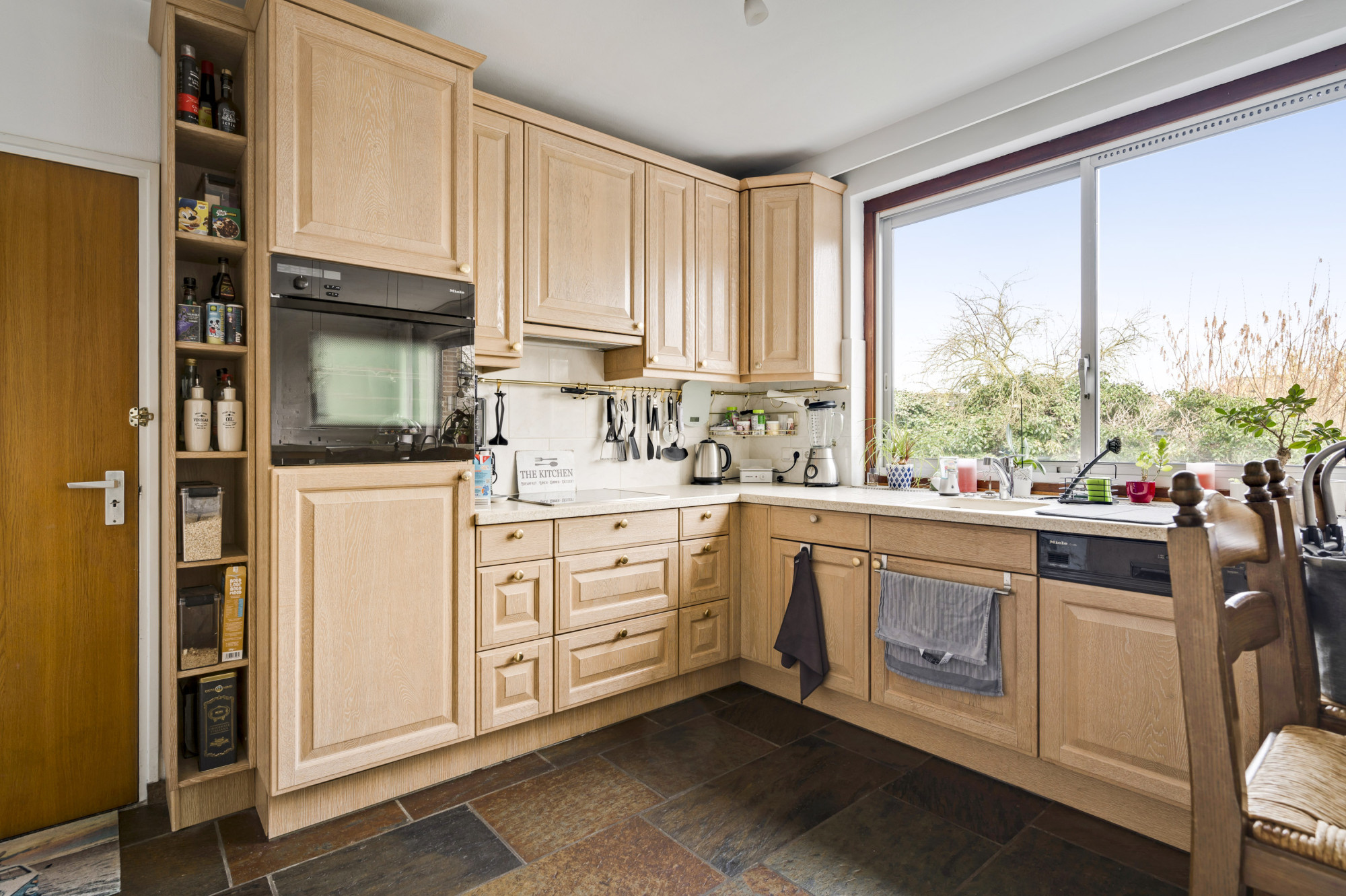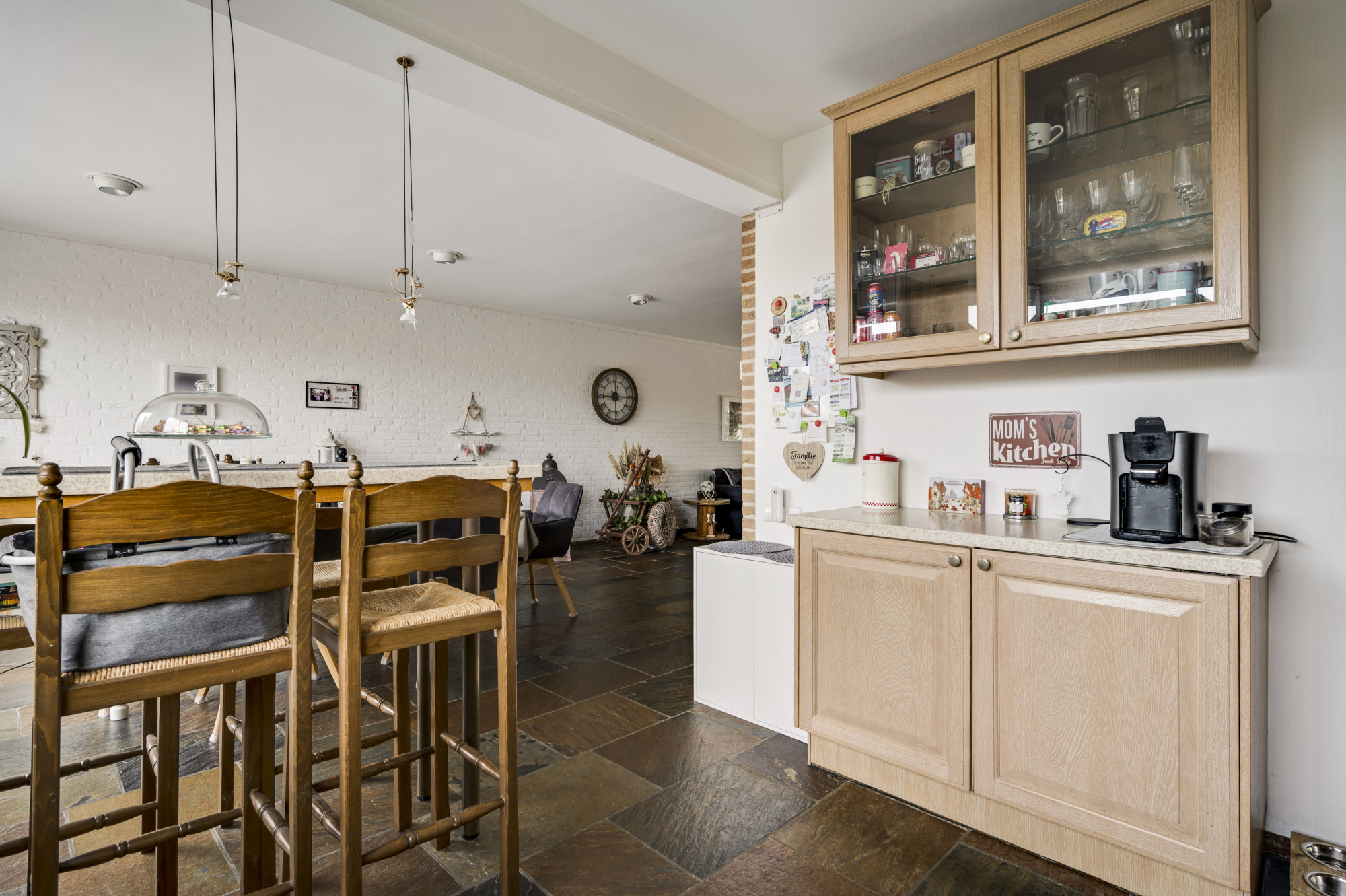 De open keuken in landelijke stijl is uitgerust met inbouwapparatuur en biedt volop ruimte om te koken en te genieten. Aansluitend bevindt zich een bijkeuken met extra bergruimte en de mogelijkheid tot een witgoedaansluiting.