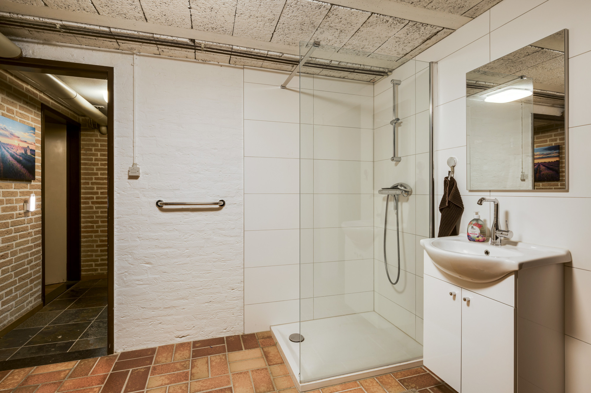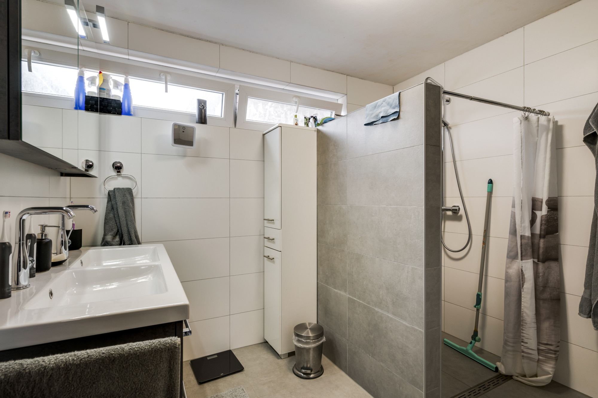 Aan de achterzijde een kelderruimte met een inloopdouche en badkamermeubel met vaste wastafel.