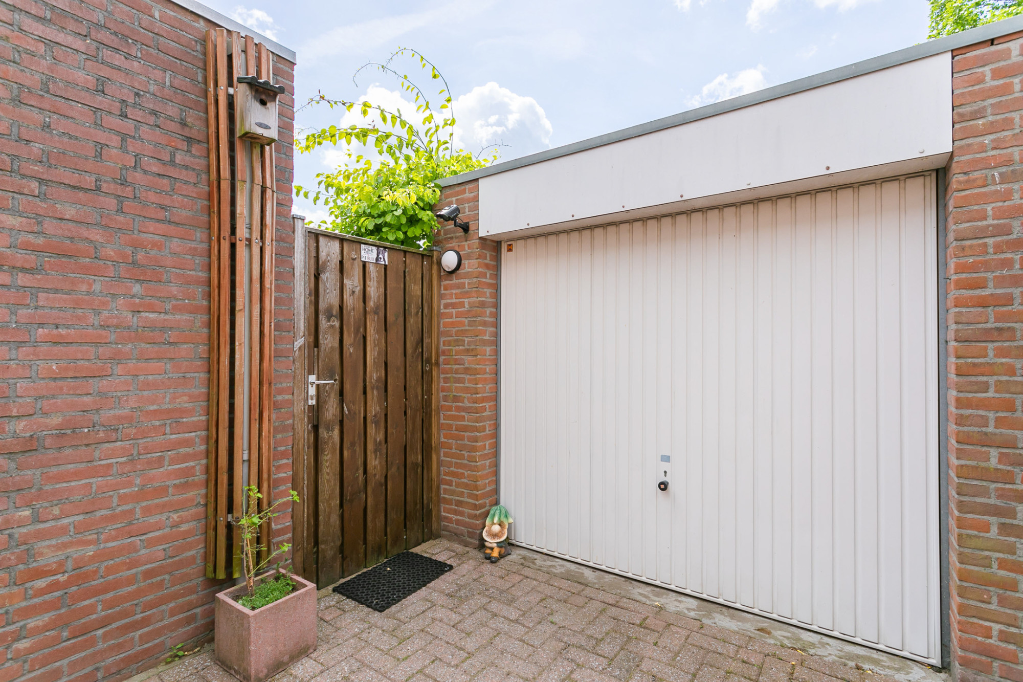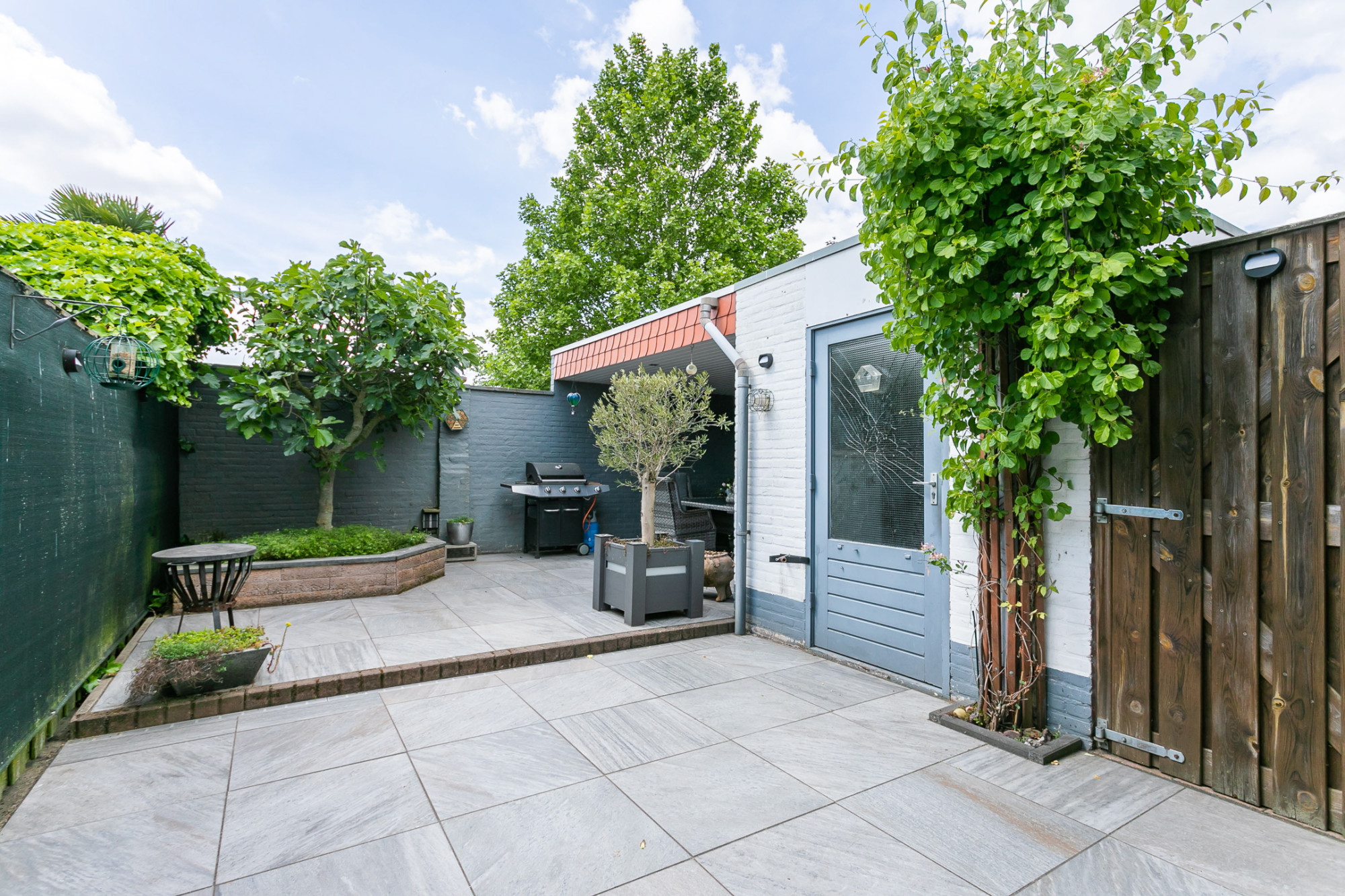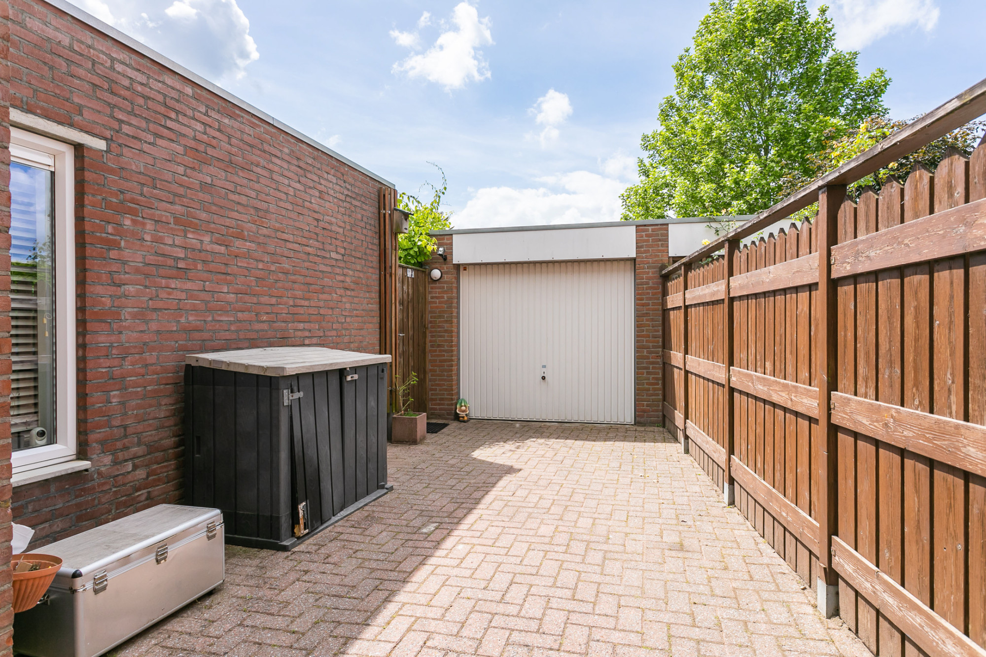 Geheel omsloten onderhoudsvriendelijke achtertuin voorzien van een beklinkerd terras, borders met aanplanting, een overdekt terras en veel privacy. Vrijstaande stenen tuinberging voorzien van een handmatig bedienbare kantelpoort met opslagmogelijkheden. Naastgelegen gemeenschappelijke oprit met parkeergelegenheid op eigen terrein.