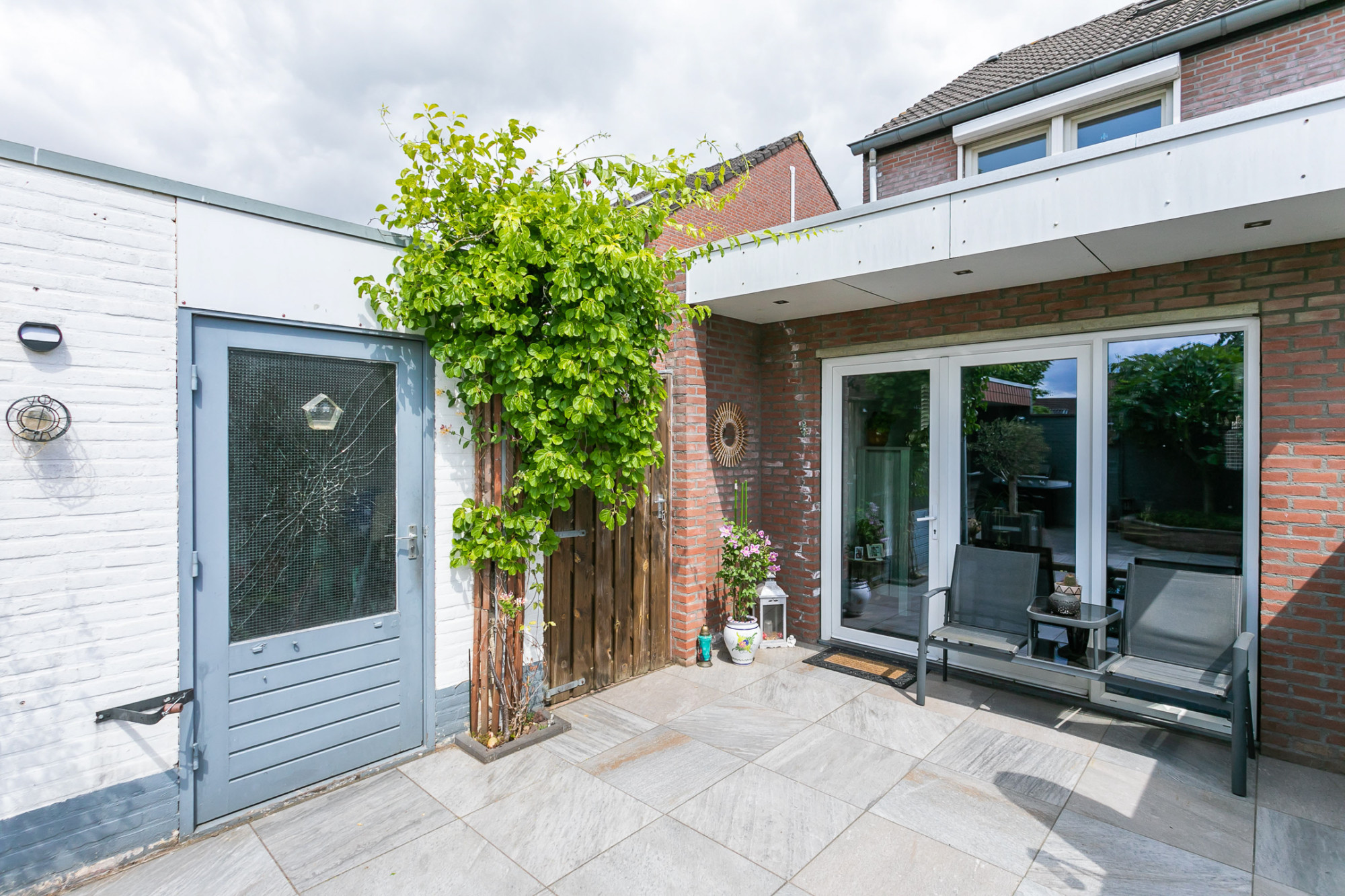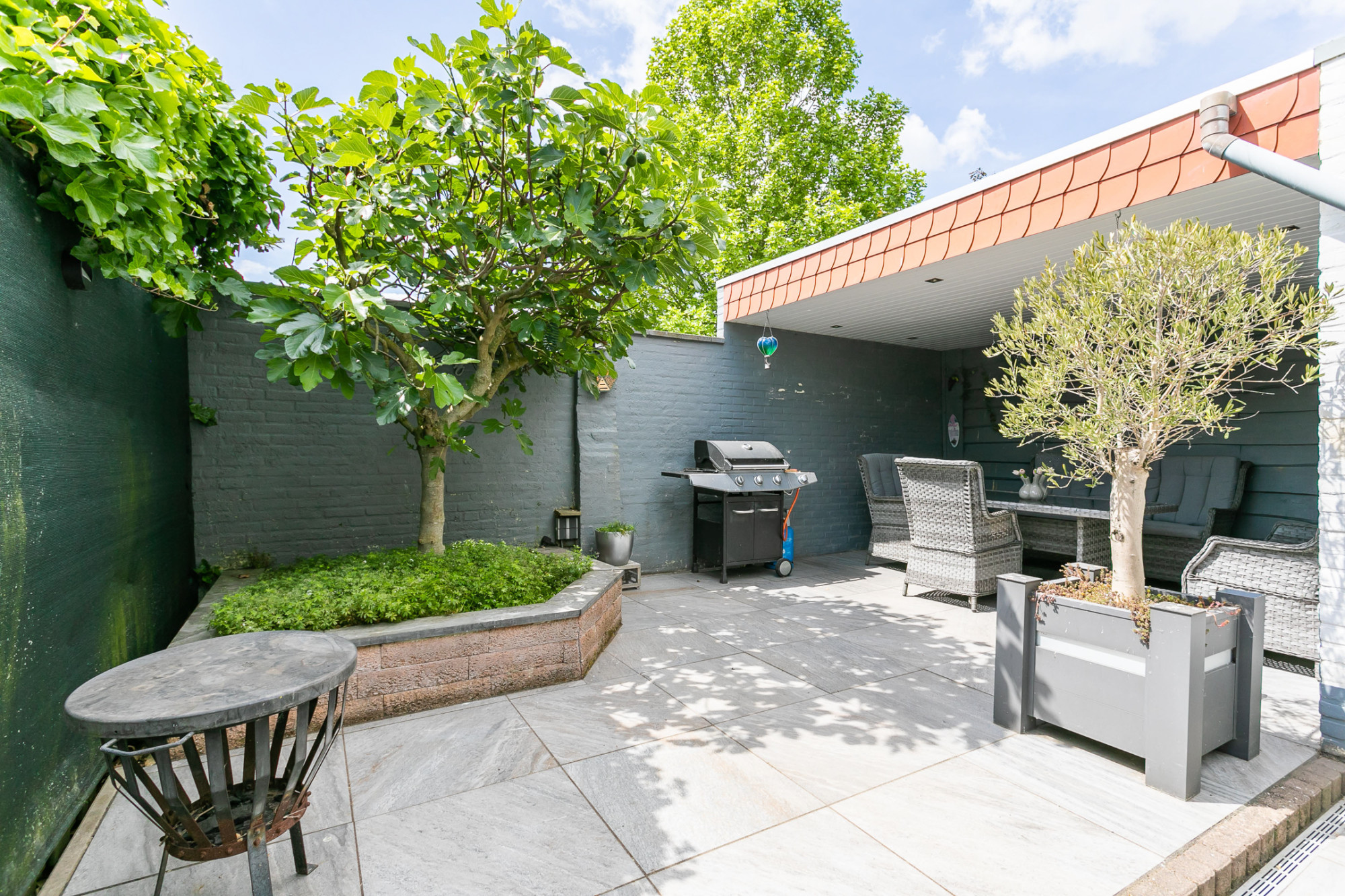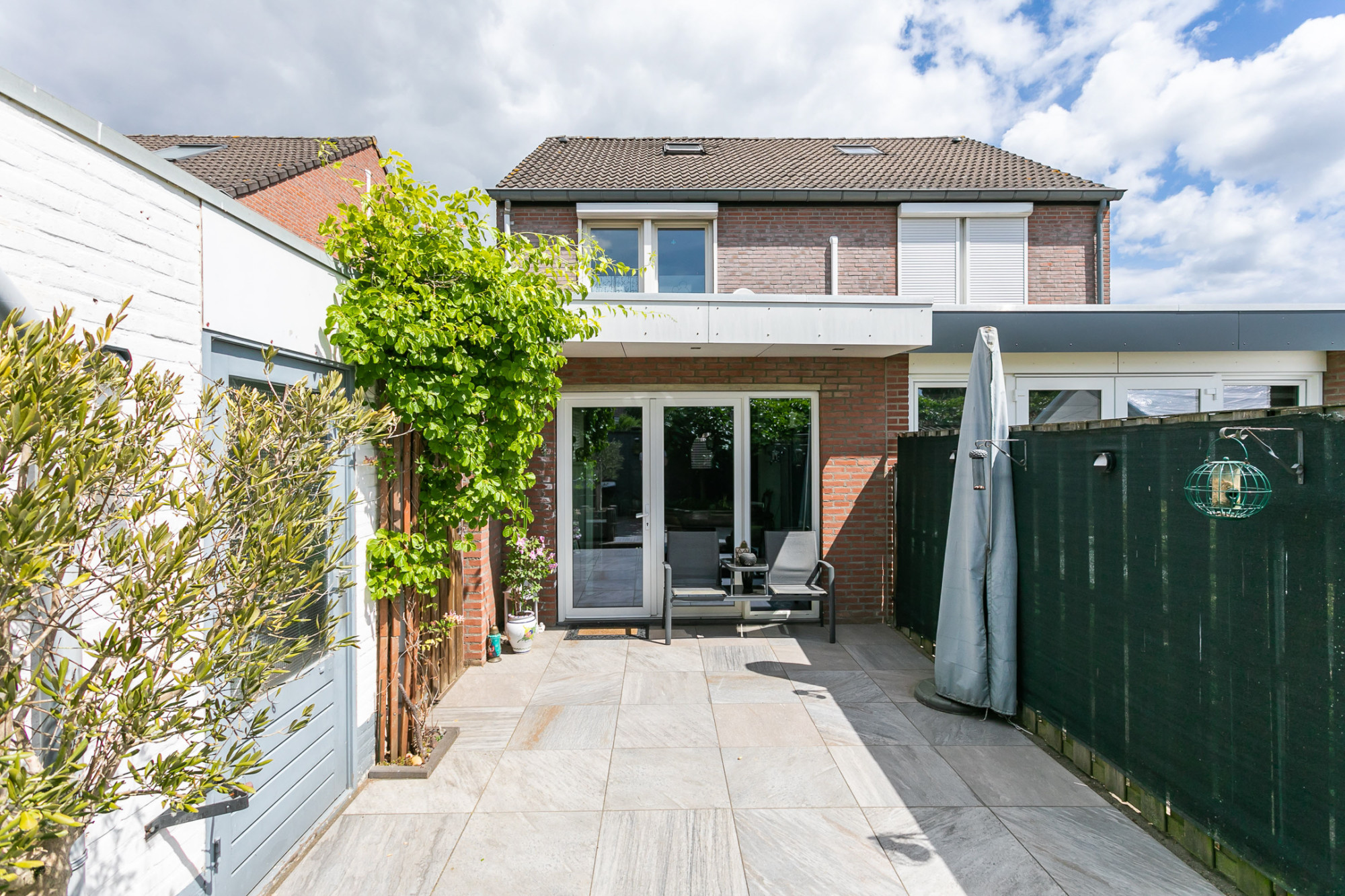 Geheel omsloten onderhoudsvriendelijke achtertuin voorzien van een beklinkerd terras, borders met aanplanting, een overdekt terras en veel privacy. Vrijstaande stenen tuinberging voorzien van een handmatig bedienbare kantelpoort met opslagmogelijkheden. Naastgelegen gemeenschappelijke oprit met parkeergelegenheid op eigen terrein.