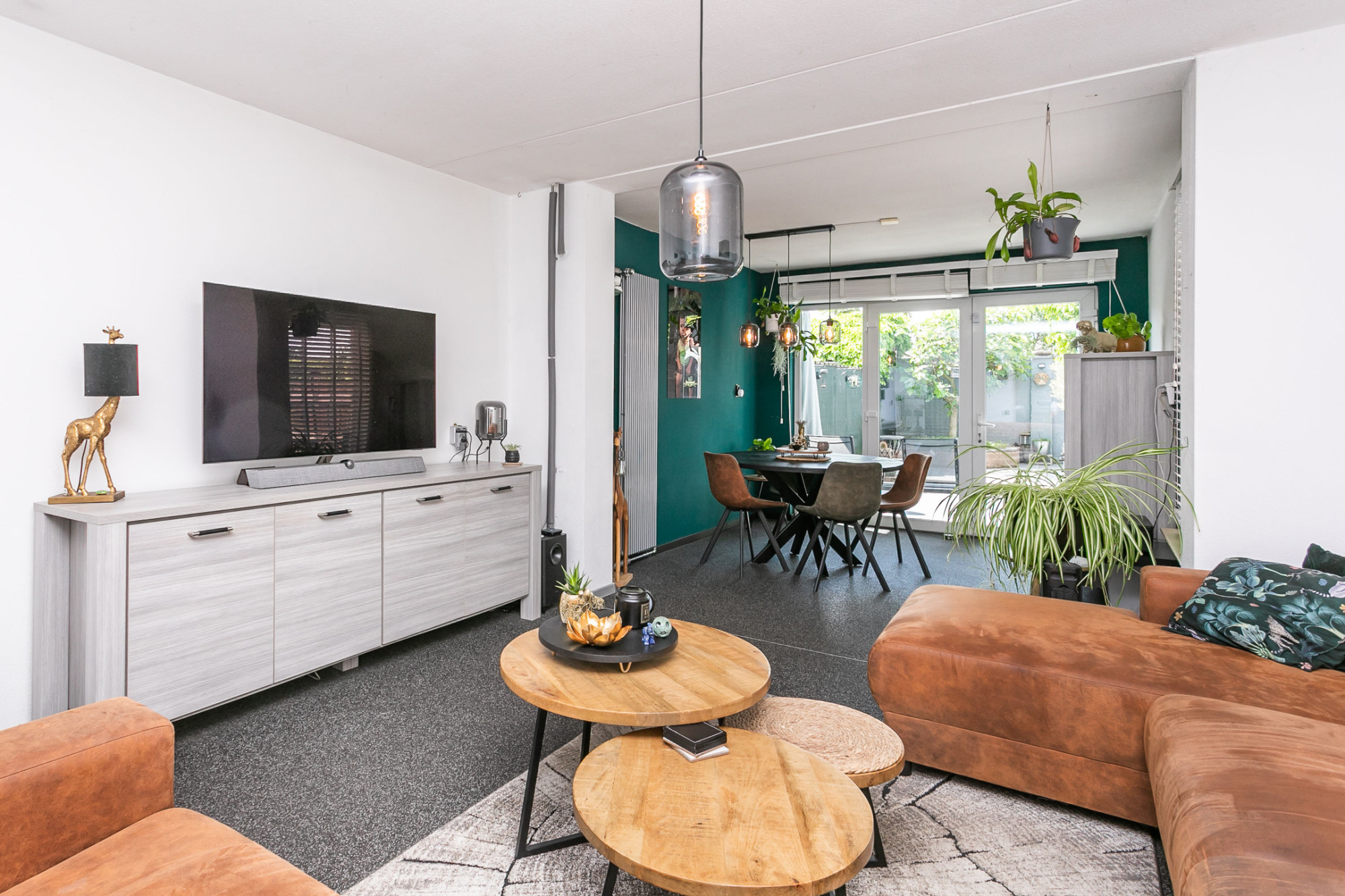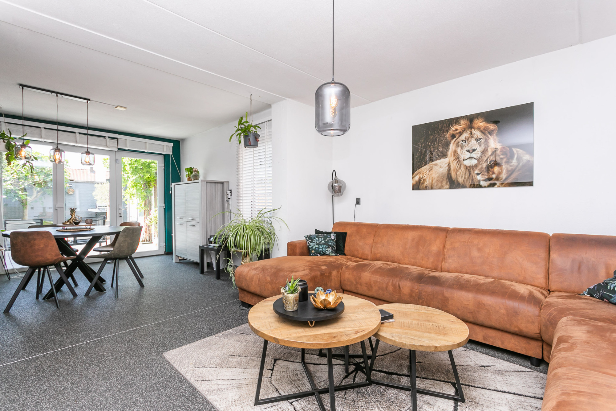 Ruime woonkamer waar centraal geplaatst een royale zithoek met audio-/visuele aansluitingen, voorzien van een siergrindvloer en een trapkast voor opslag en provisie. In aanbouw gesitueerde eetkamer met veel lichtinval en loopdeur naar het terras en de achtertuin.