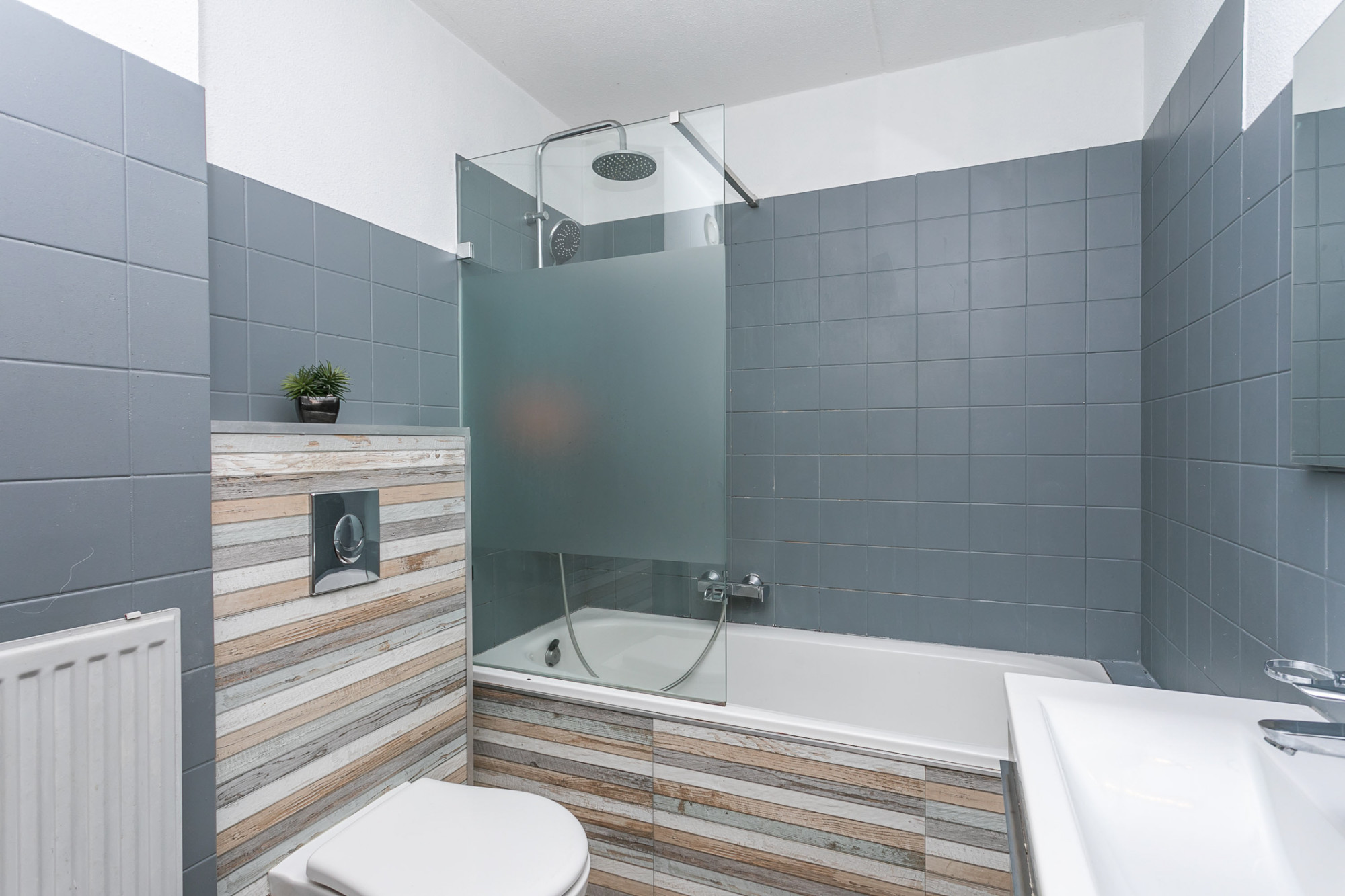 De badkamer, centraal gelegen, beschikt over een ligbad, tweede toilet en een badkamermeubel met wastafel.