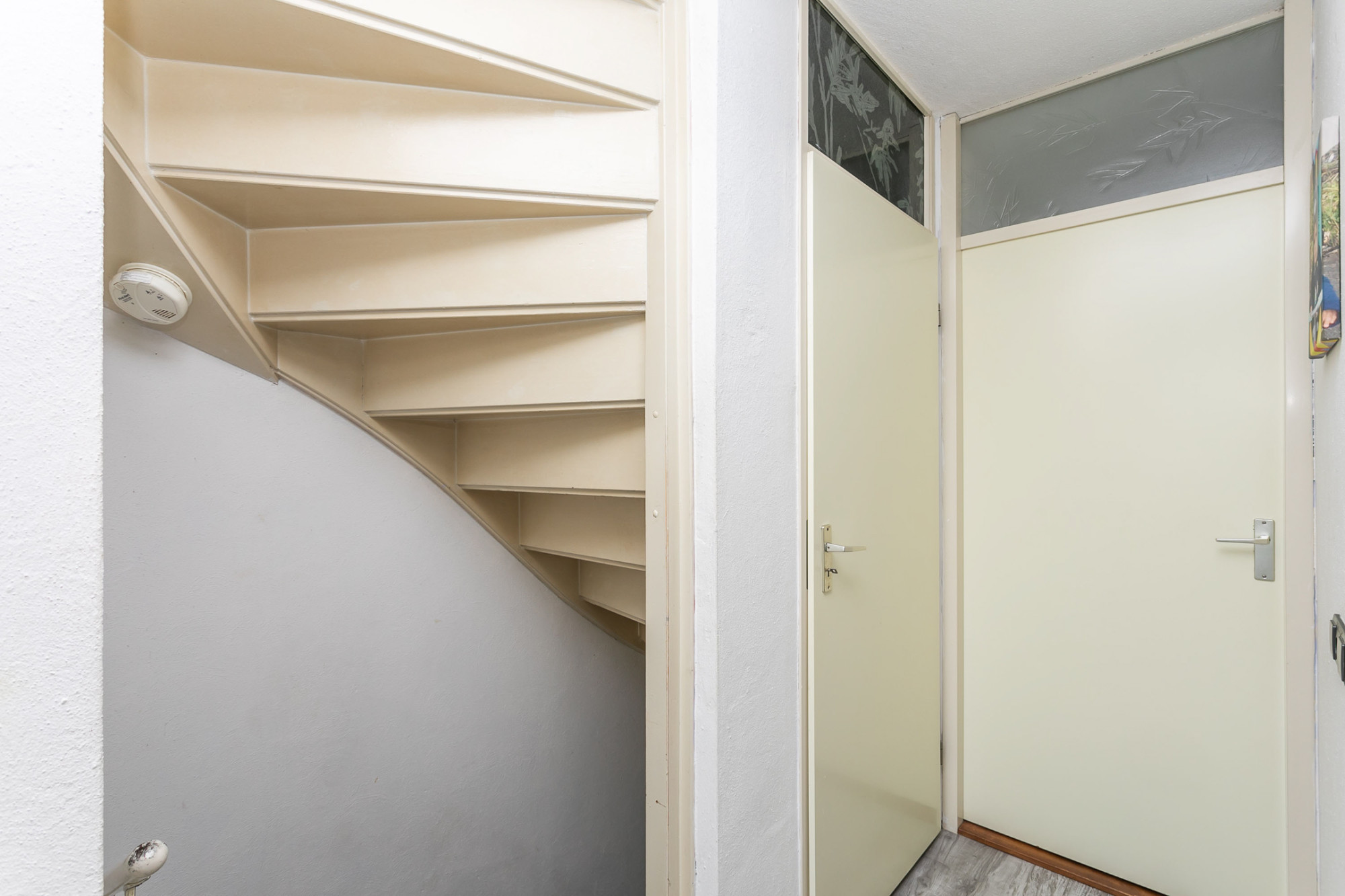Vaste trap naar de zolder met dakraam. Veel bergruimte onder de geïsoleerde dakconstructie, waar geplaatst de gehuurde ATAG CV-Combi-ketel en witgoedaansluitingen voor wasmachine en droger.